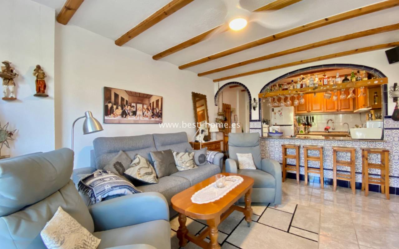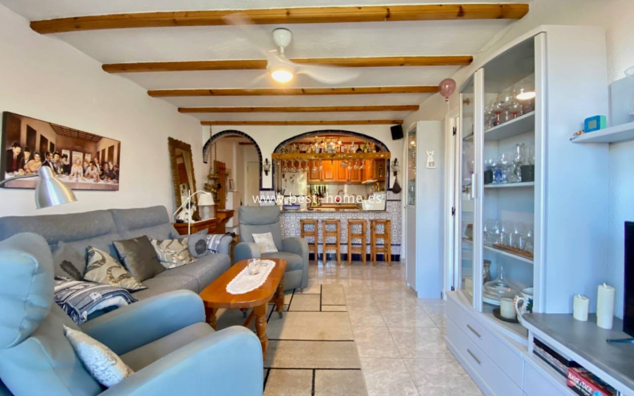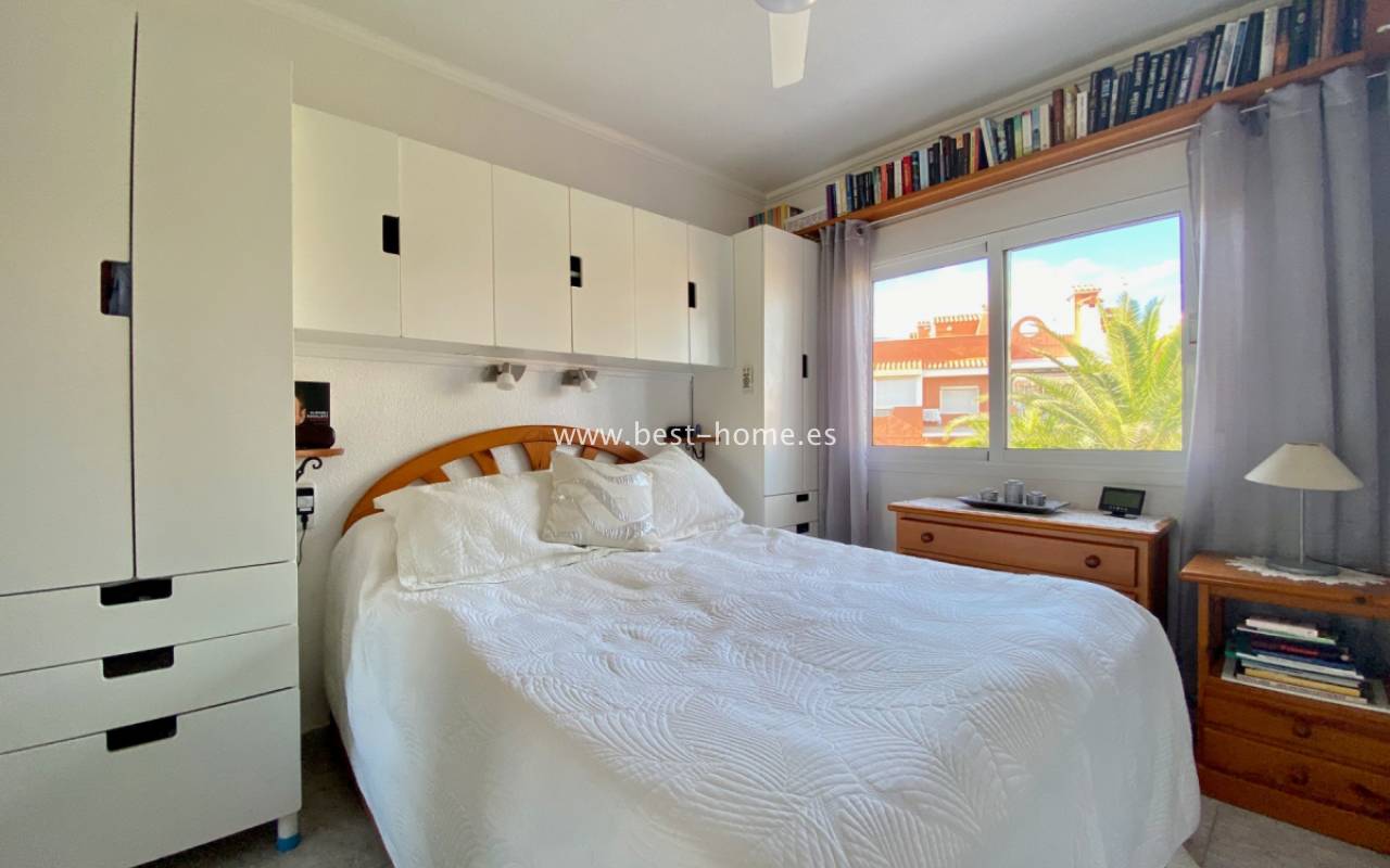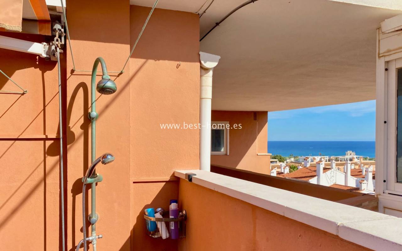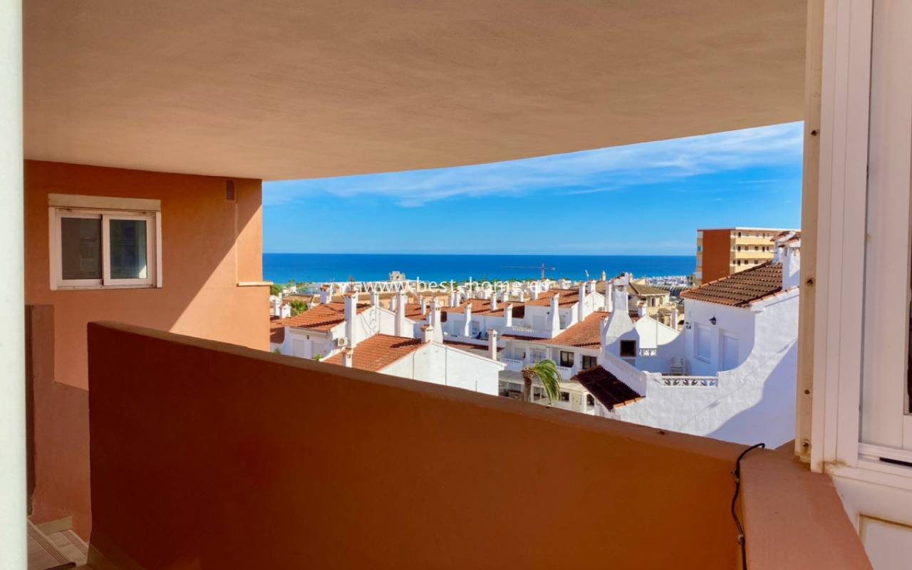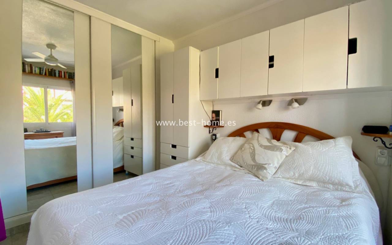 A picturesque penthouse with lagoon views, a solarium, and a charming community pool. It features a living room with an open-plan American kitchen equipped with appliances, one double bedroom, and a bathroom. Additionally, the upper floor boasts a terrace/solarium overlooking the lagoon and a brick fireplace. A major draw is the beautiful swimming pool surrounded by palm trees and lush greenery. The apartment is well-maintained and ideal for vacation rentals.