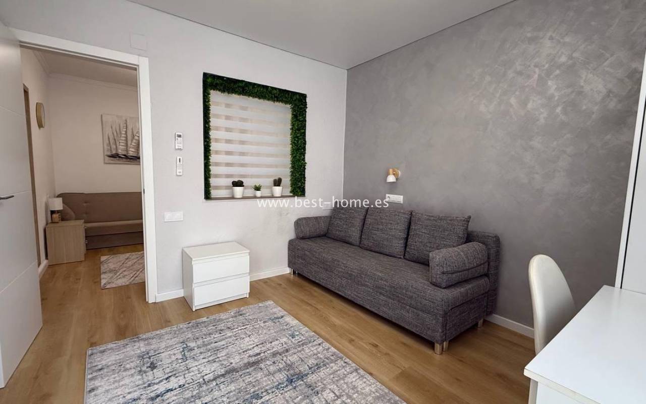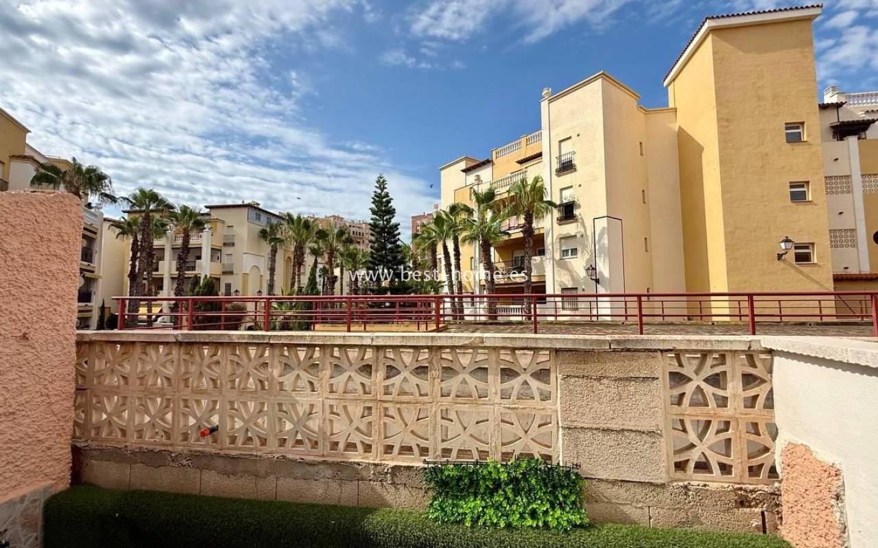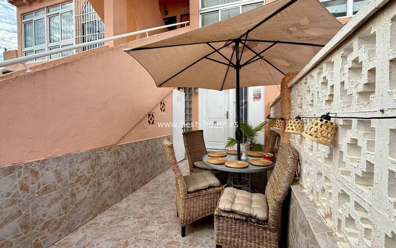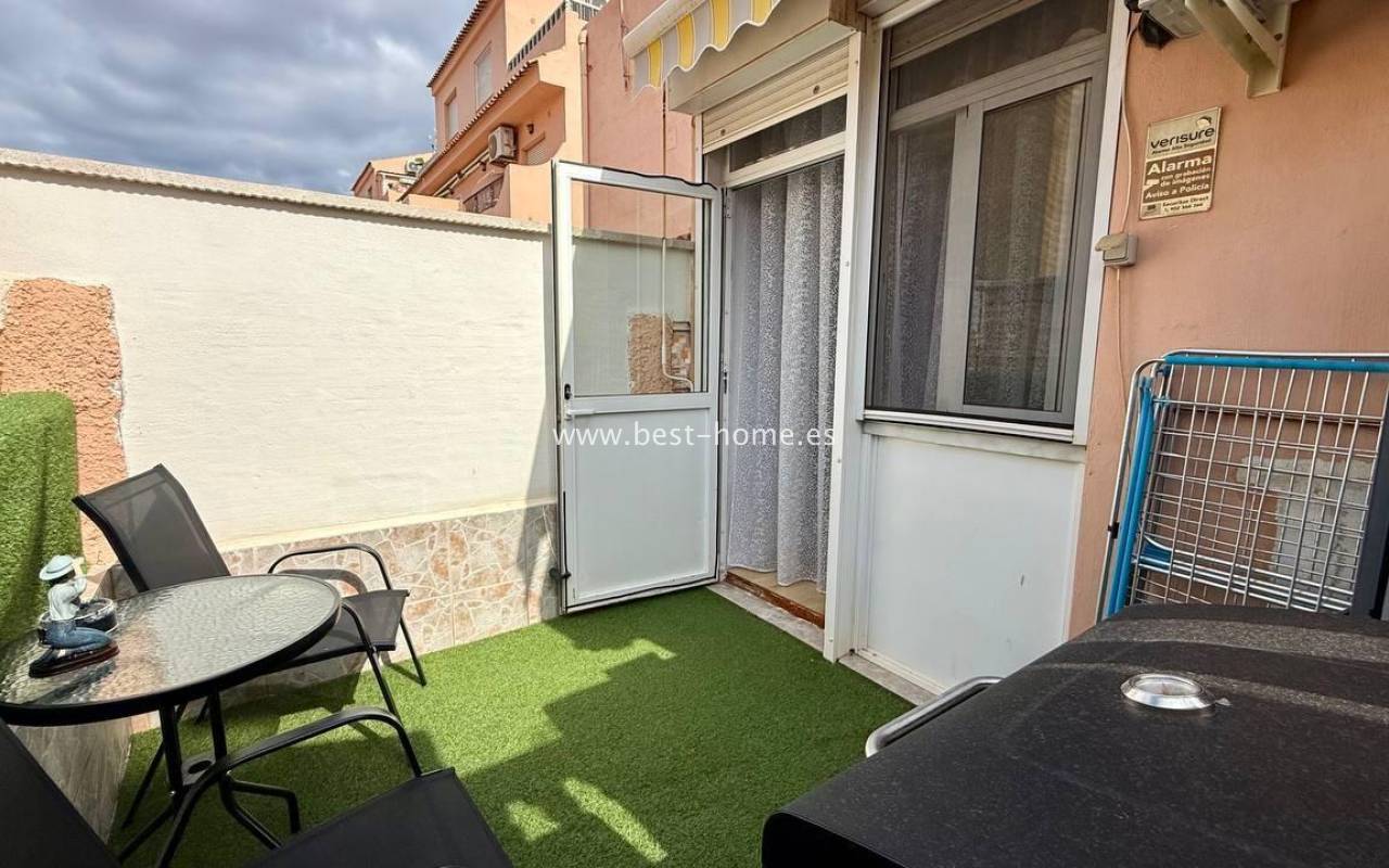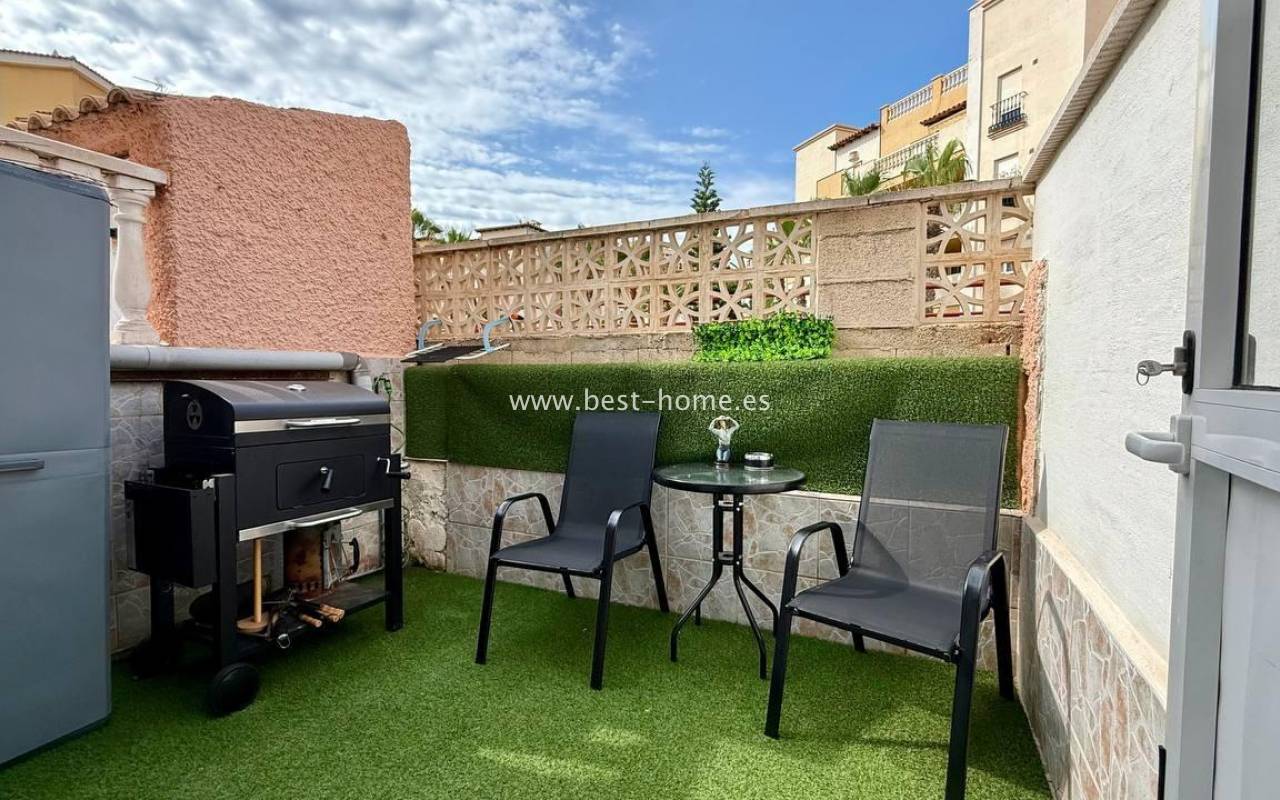 This beautifully designed apartment in the Los Frutales urbanization boasts two terraces, a barbecue, and a lounge area. The living room is accessed through a garden corridor with a lounge area, followed by a living room, an open-plan kitchen equipped with appliances, two bedrooms, the master bedroom opening onto an additional terrace with a barbecue, and a bathroom. This property is ideal for holiday rentals or permanent residence. The apartment is furnished and equipped with air conditioning. Additionally, the garden corridor offers storage space.