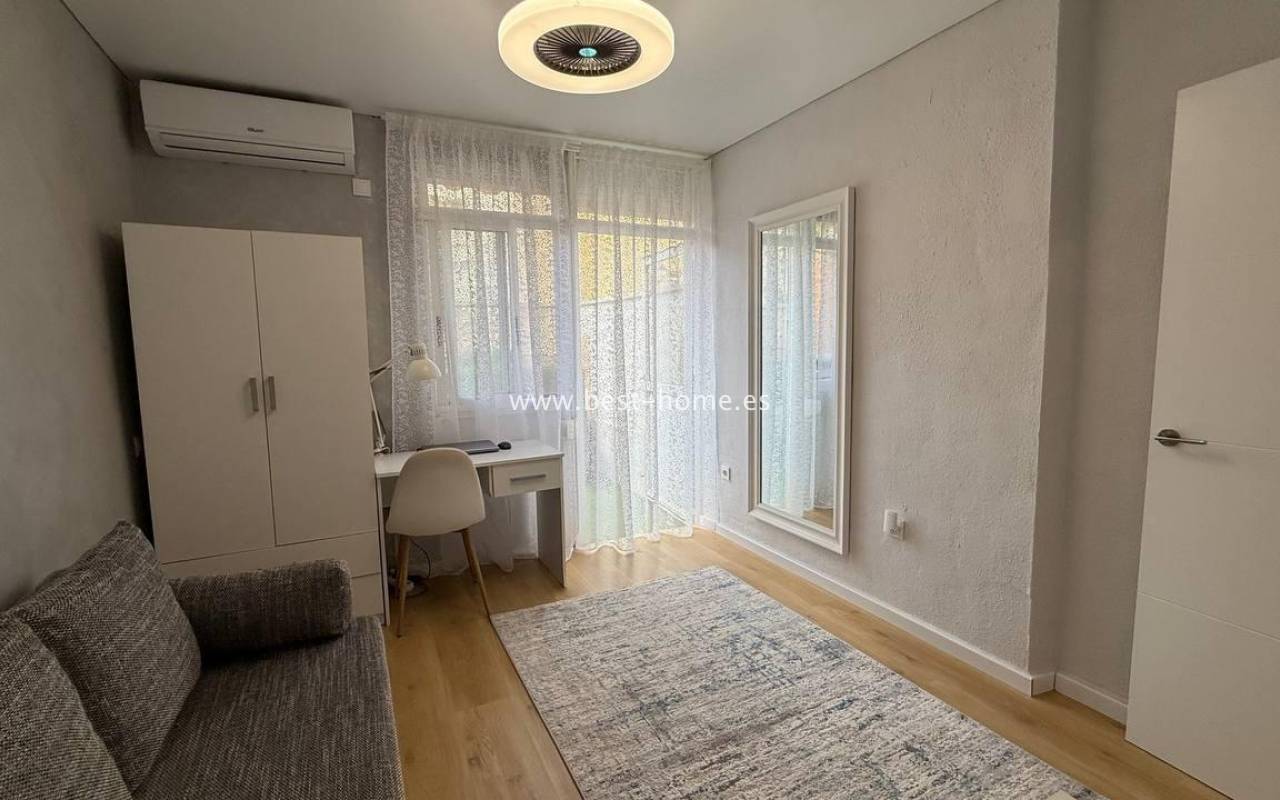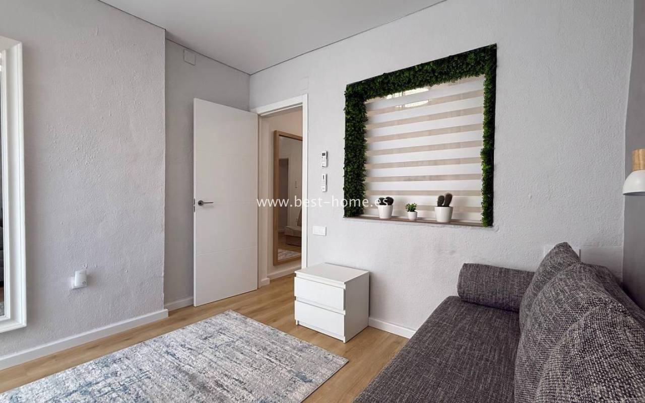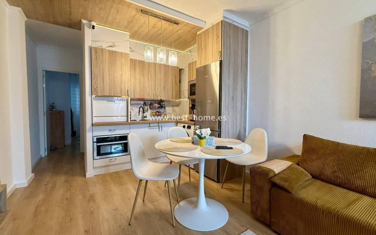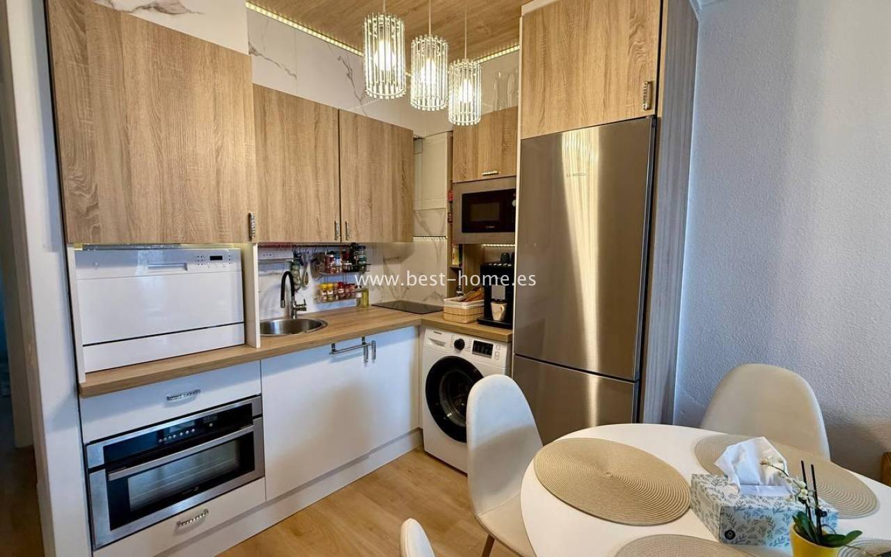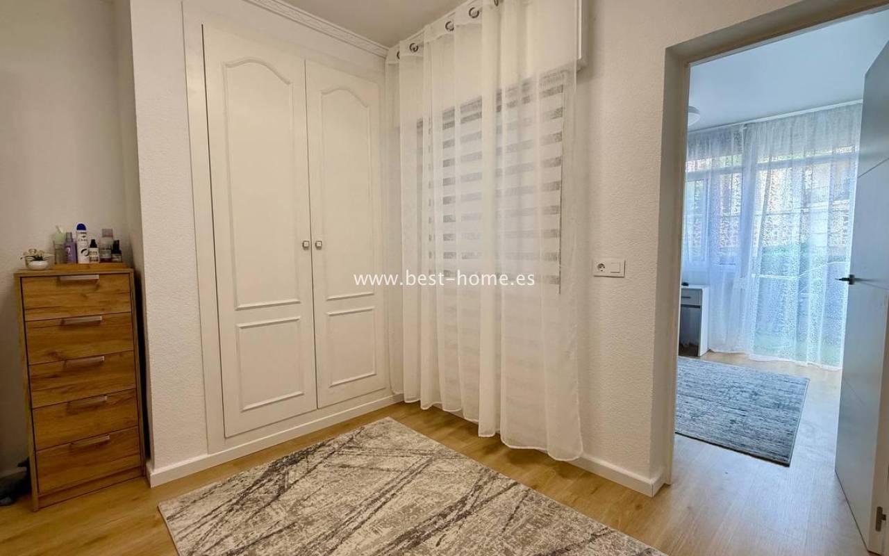 This beautifully designed apartment in the Los Frutales urbanization boasts two terraces, a barbecue, and a lounge area. The living room is accessed through a garden corridor with a lounge area, followed by a living room, an open-plan kitchen equipped with appliances, two bedrooms, the master bedroom opening onto an additional terrace with a barbecue, and a bathroom. This property is ideal for holiday rentals or permanent residence. The apartment is furnished and equipped with air conditioning. Additionally, the garden corridor offers storage space.