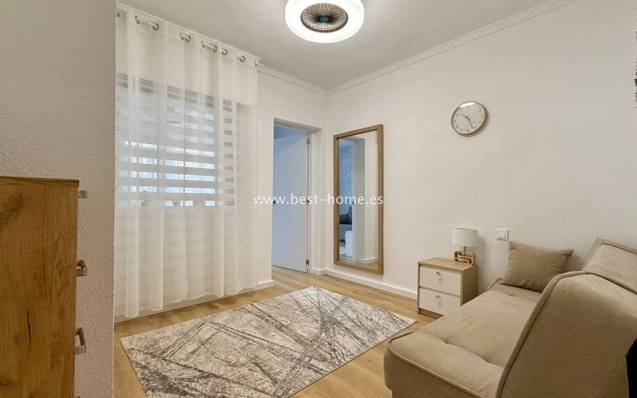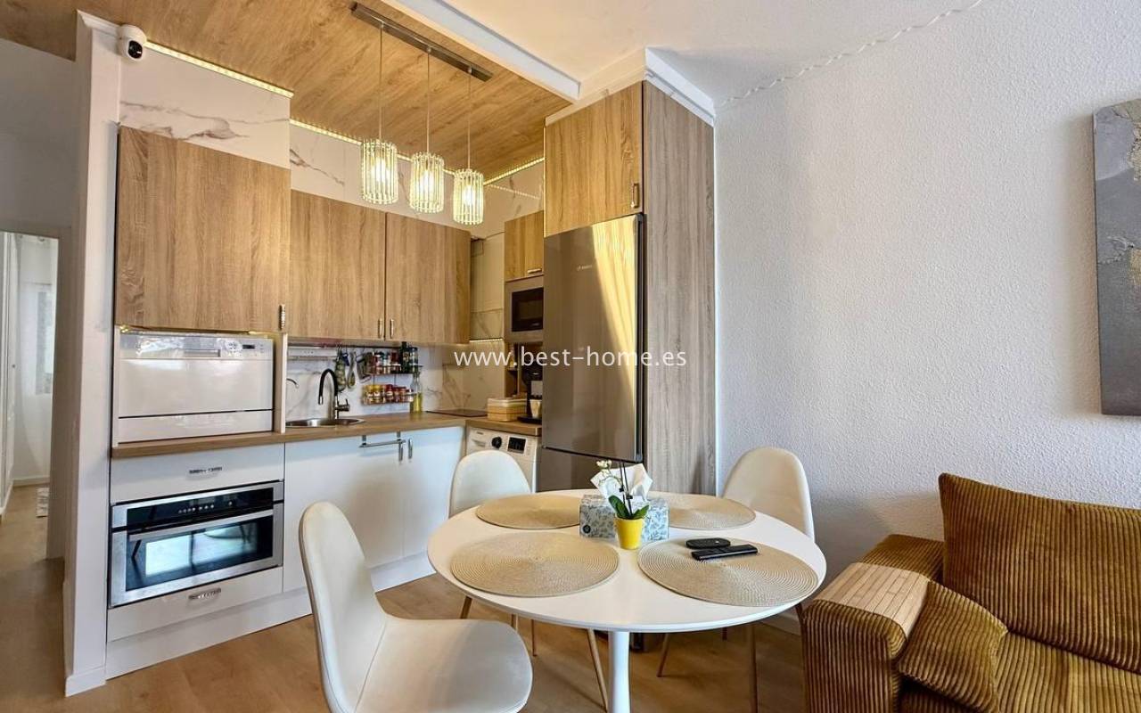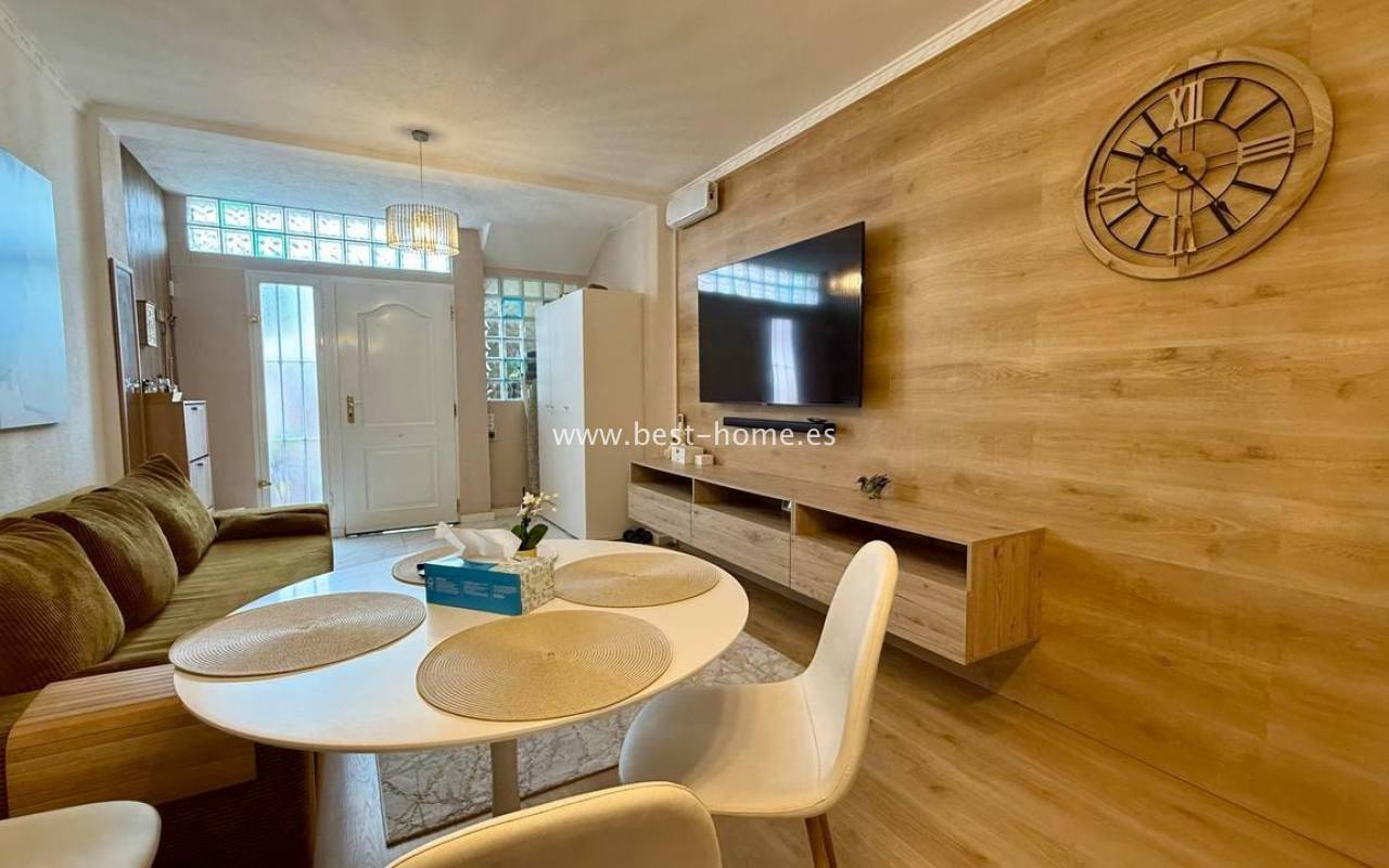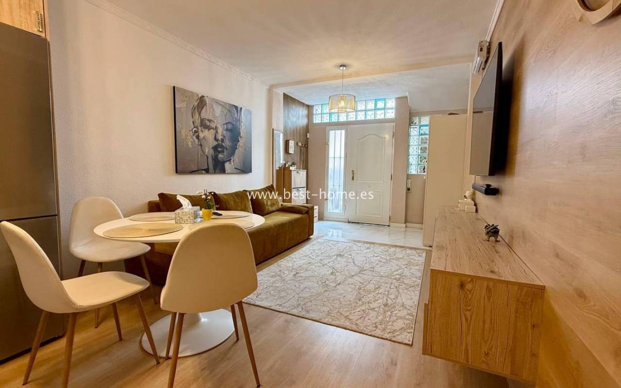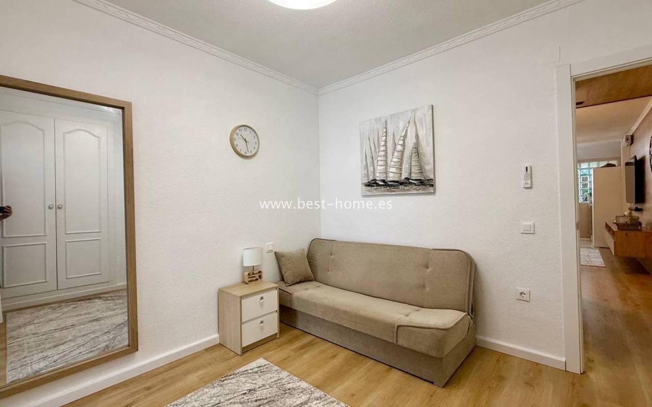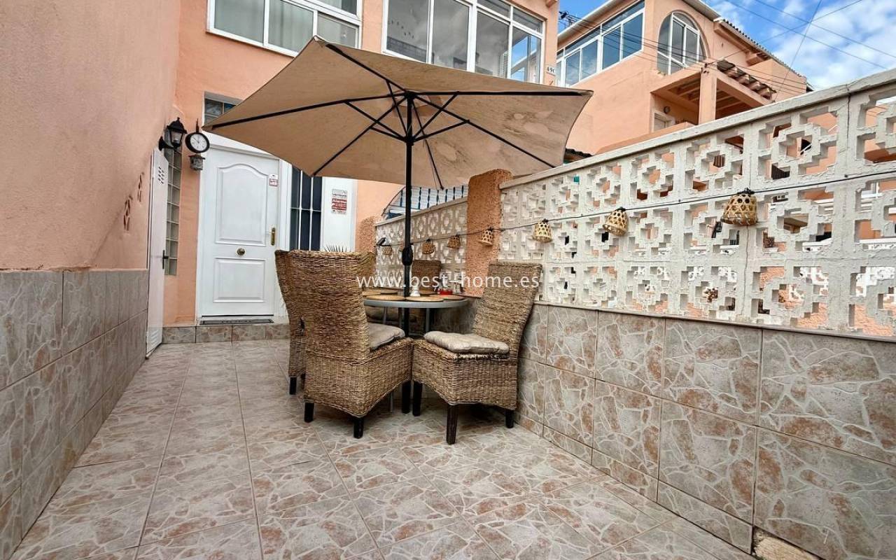 This beautifully designed apartment in the Los Frutales urbanization boasts two terraces, a barbecue, and a lounge area. The living room is accessed through a garden corridor with a lounge area, followed by a living room, an open-plan kitchen equipped with appliances, two bedrooms, the master bedroom opening onto an additional terrace with a barbecue, and a bathroom. This property is ideal for holiday rentals or permanent residence. The apartment is furnished and equipped with air conditioning. Additionally, the garden corridor offers storage space.