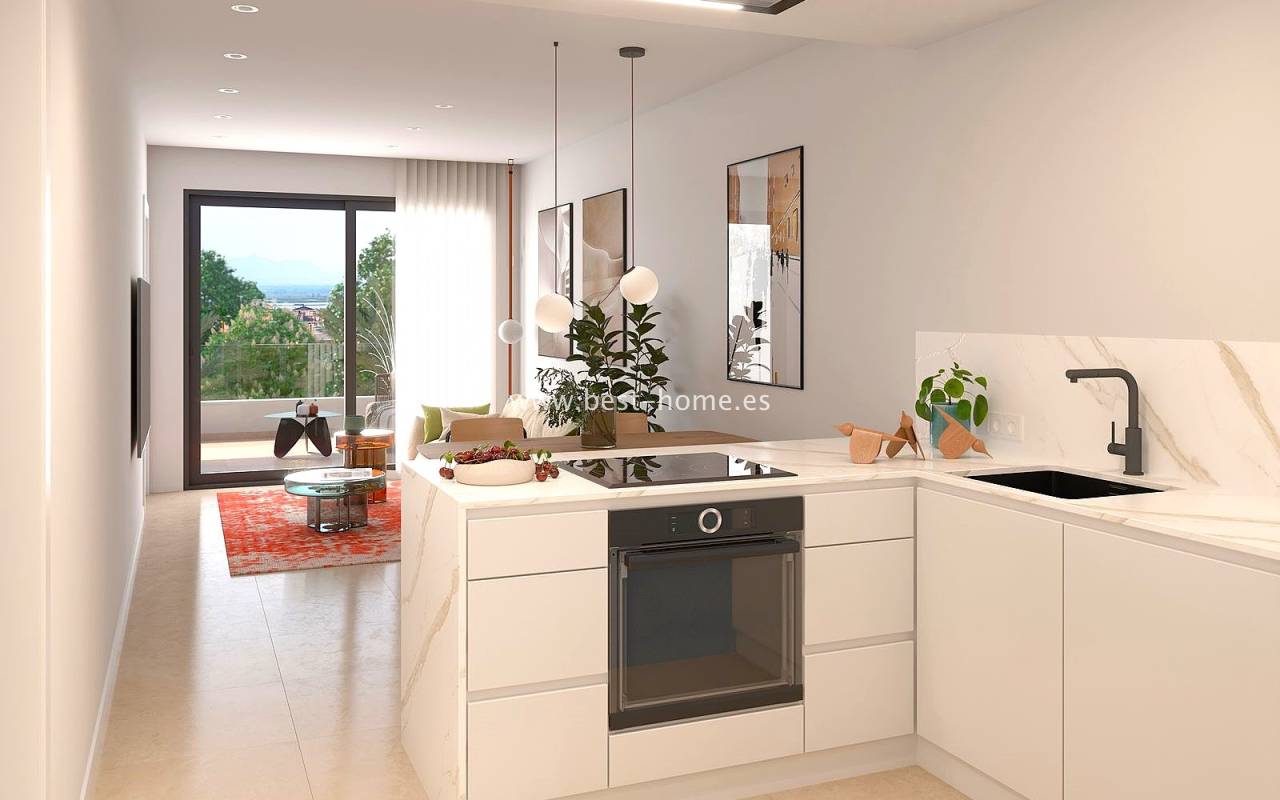 A new development of 64 apartments is being built in a quiet location on El Pinet Beach. Each apartment will feature two bedrooms with fitted wardrobes, two bathrooms, and a fitted kitchen with a dining area and living room. The master bedroom and living room will have access to a terrace (approx. 17 m²). The price includes full furnishings, appliances, lighting, pre-installation of central air conditioning, a parking space, and a storage unit.