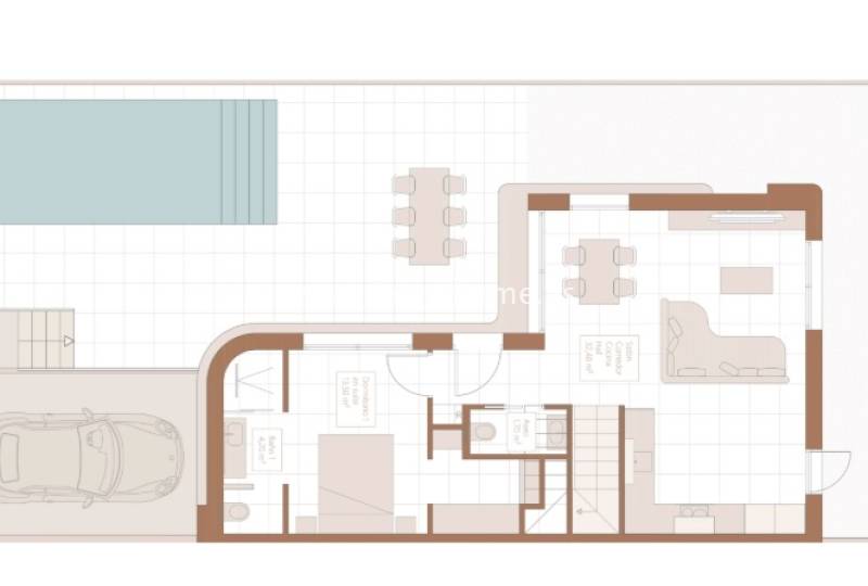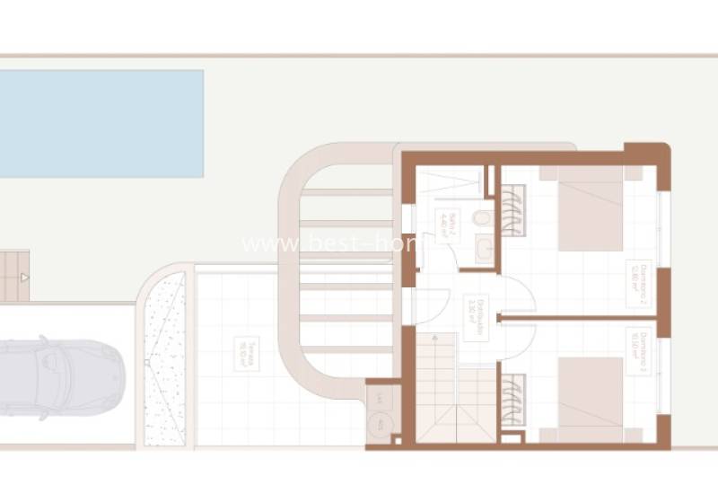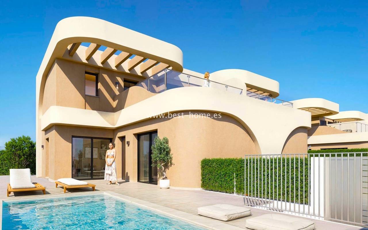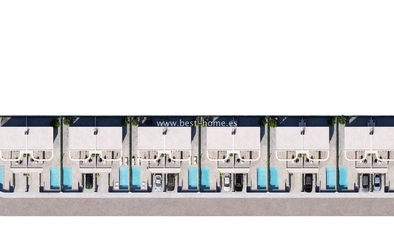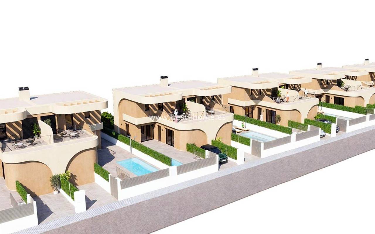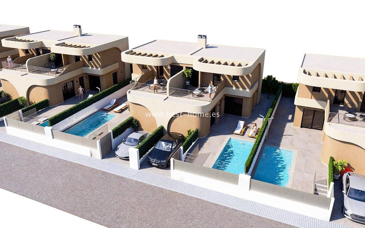 These new semi-detached villas are being built in the quiet Spanish town of Daya Nueva. The ground floor villas will feature a spacious living room with a dining area and a fitted kitchen, a powder room, and a master bedroom with a walk-in closet and en-suite bathroom. The first floor will feature two bedrooms with fitted wardrobes, a second bathroom, and a terrace. The price includes kitchen units (hood and sink), complete bathrooms, LED lighting, electric blinds in the bedrooms, pre-installed central air conditioning, and solar panels. Plot sizes range from 195 m² to 217 m². An optional 15 m² swimming pool is available for €19,900.