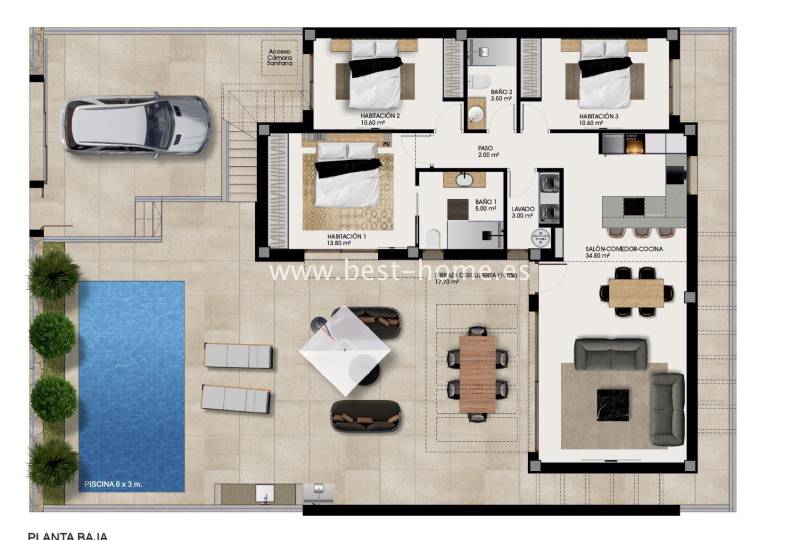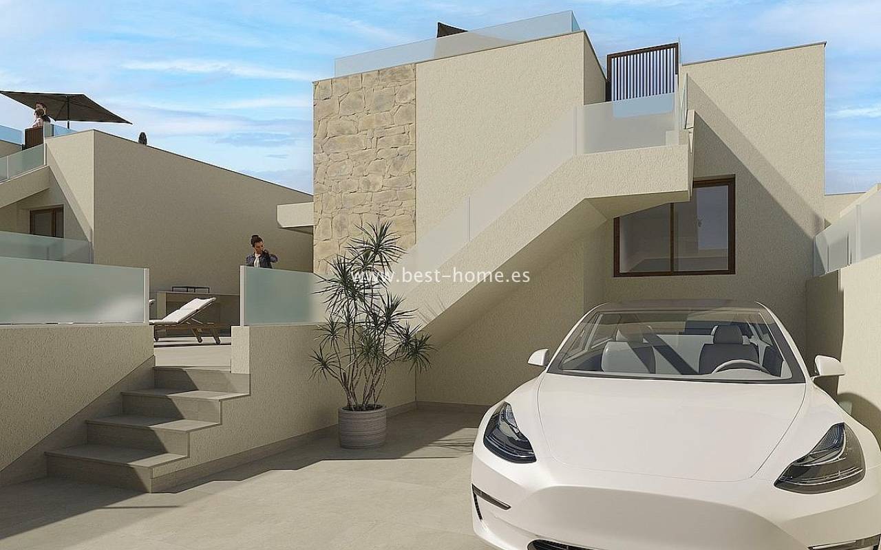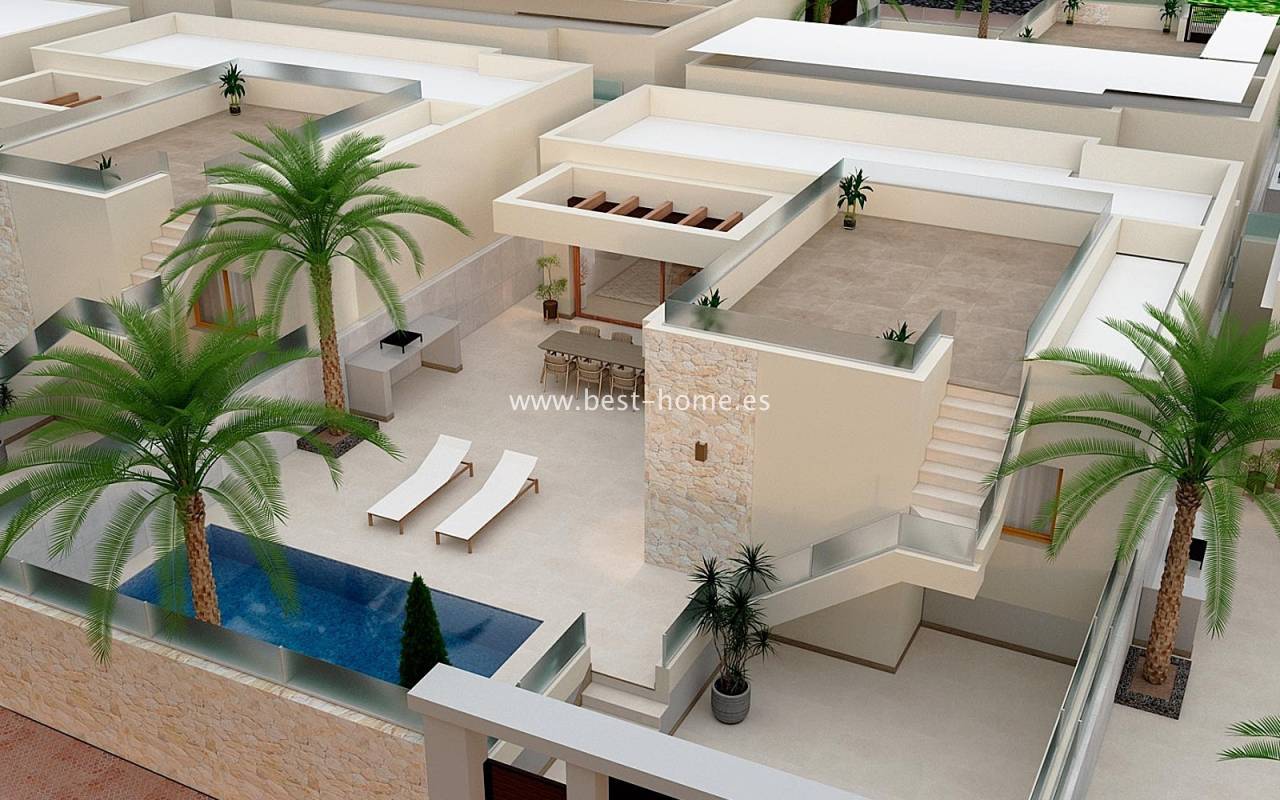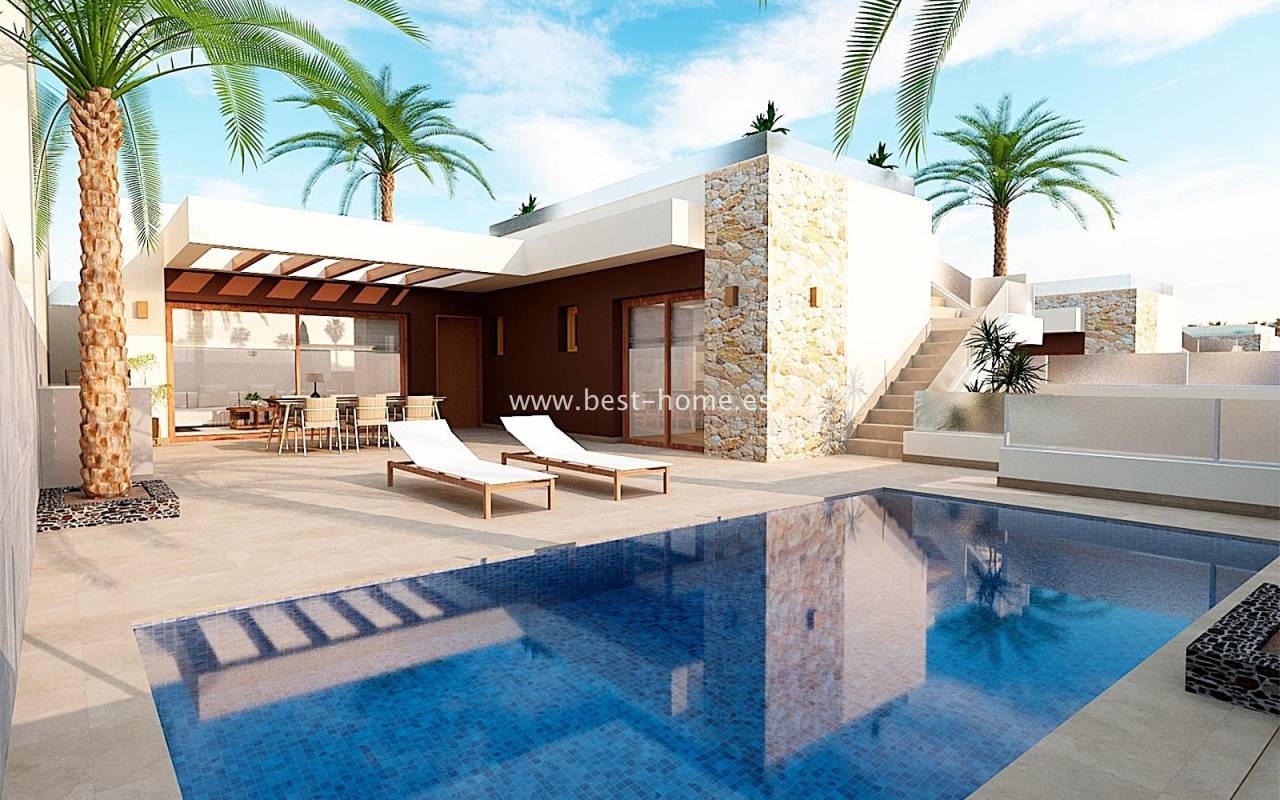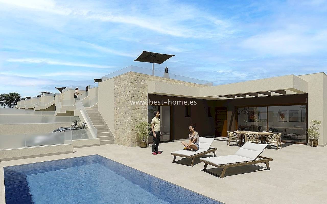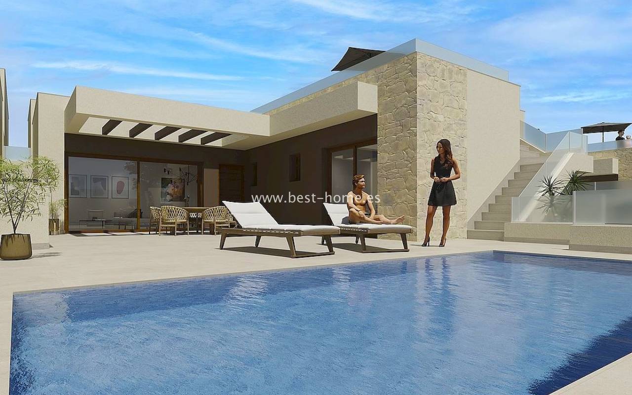 New villas are being built in a quiet community next to the golf course in Rojales. These single-story homes will feature three bedrooms, two bathrooms, a laundry room, and a fitted kitchen with a bar, connected to the dining area and living room. The living room and master bedroom will have access to a terrace and a private pool. The price includes a fitted kitchen with appliances, central hot/cold air conditioning, electric shutters, an automatic entrance gate, a private 6x3 chlorinated swimming pool, and a basement. Only two villas are available, priced at €480,000 and €500,000, and will be