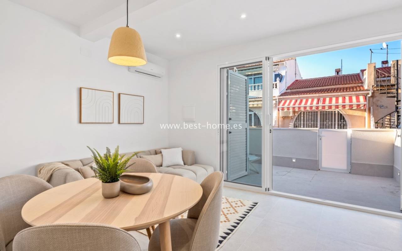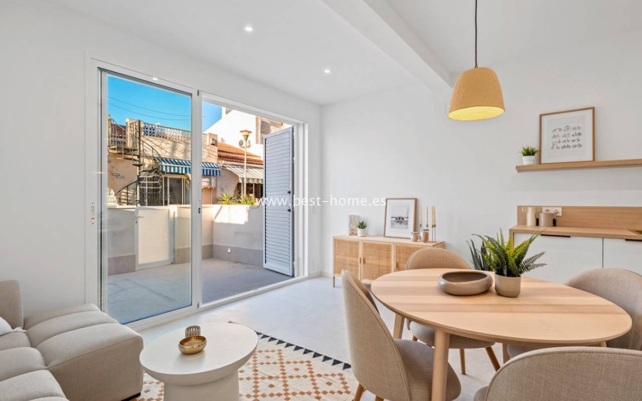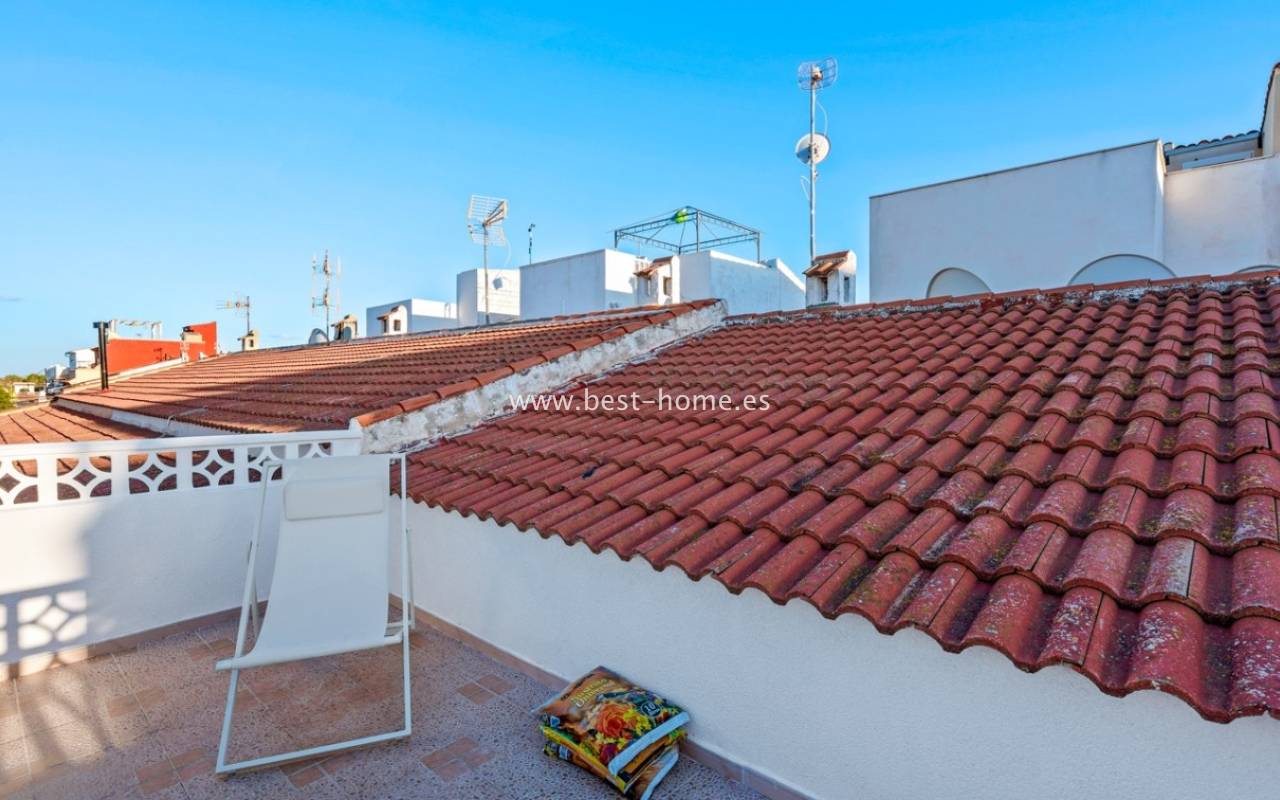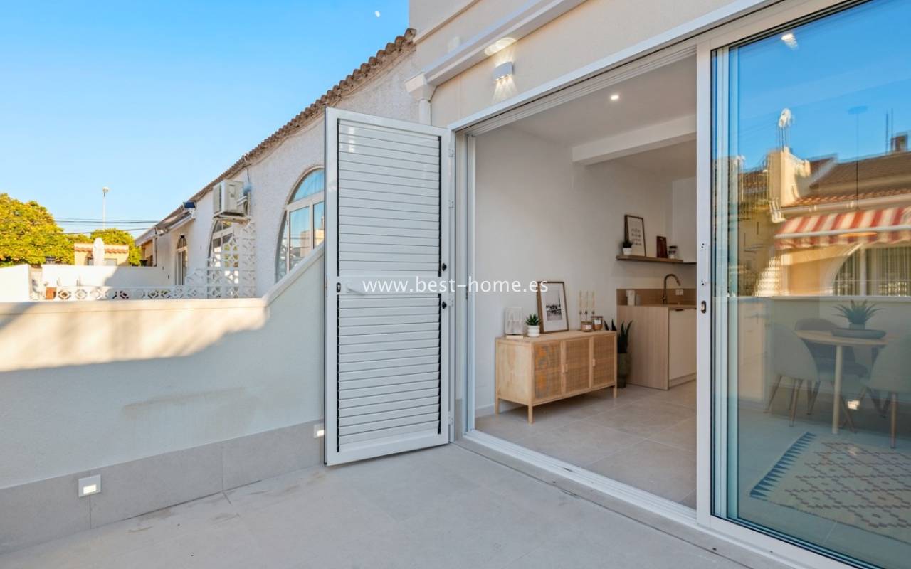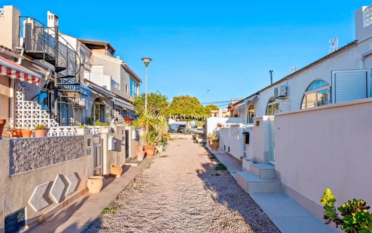 A very modern single-story bungalow with a solarium in the peaceful, quiet El Chaparral development. It features a garden/terrace, leading to a bright, spacious living room decorated in a boho style. Next, you'll find a modern kitchen equipped with high-quality appliances, two bedrooms, including a double master bedroom with built-in wardrobes, and a renovated bathroom with a shower. Upstairs, you'll find a terrace/solarium with a beautiful view of the green park, perfect for relaxing and spending time with family. Nearby, you'll find a park, numerous bars, restaurants, and a charming natural lake, perfect for walks and bike rides.