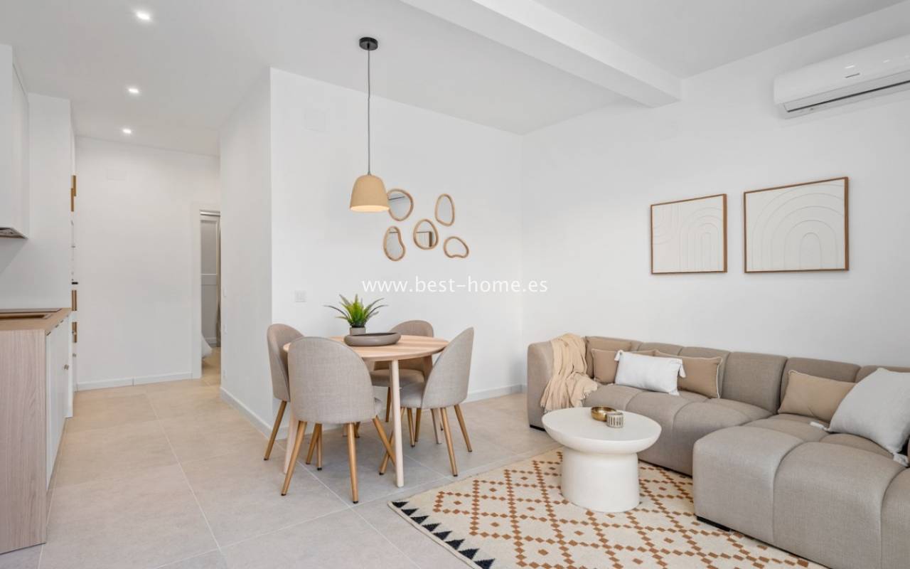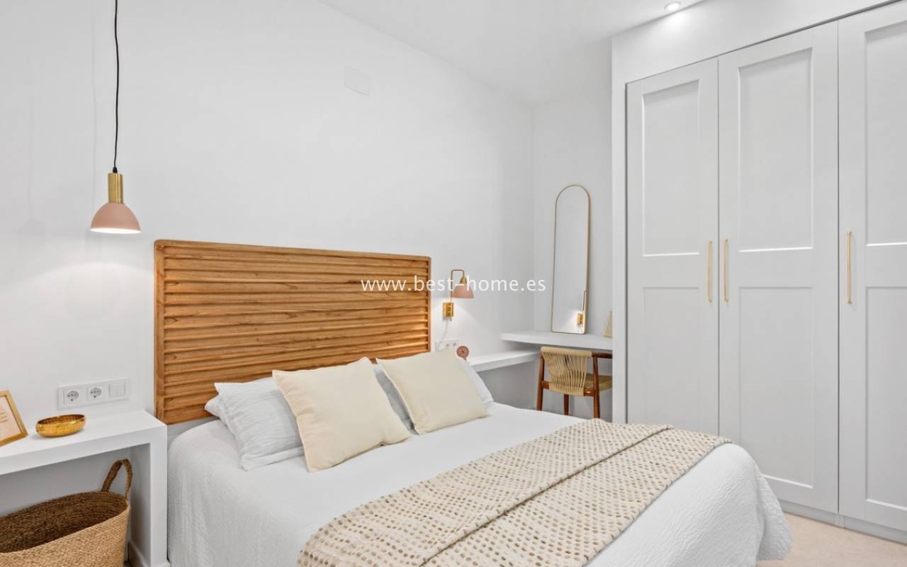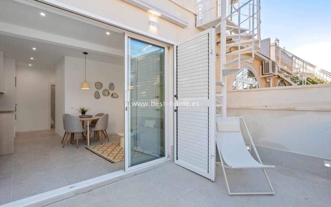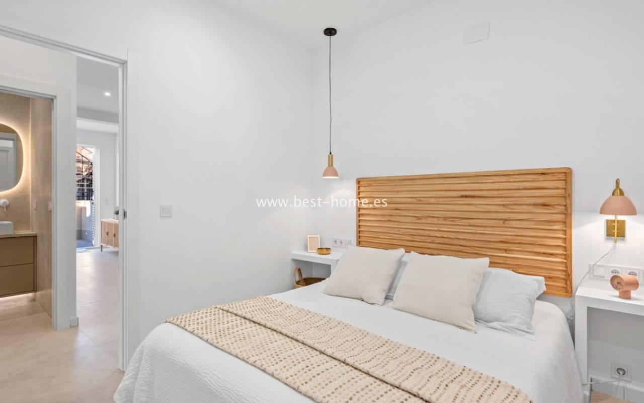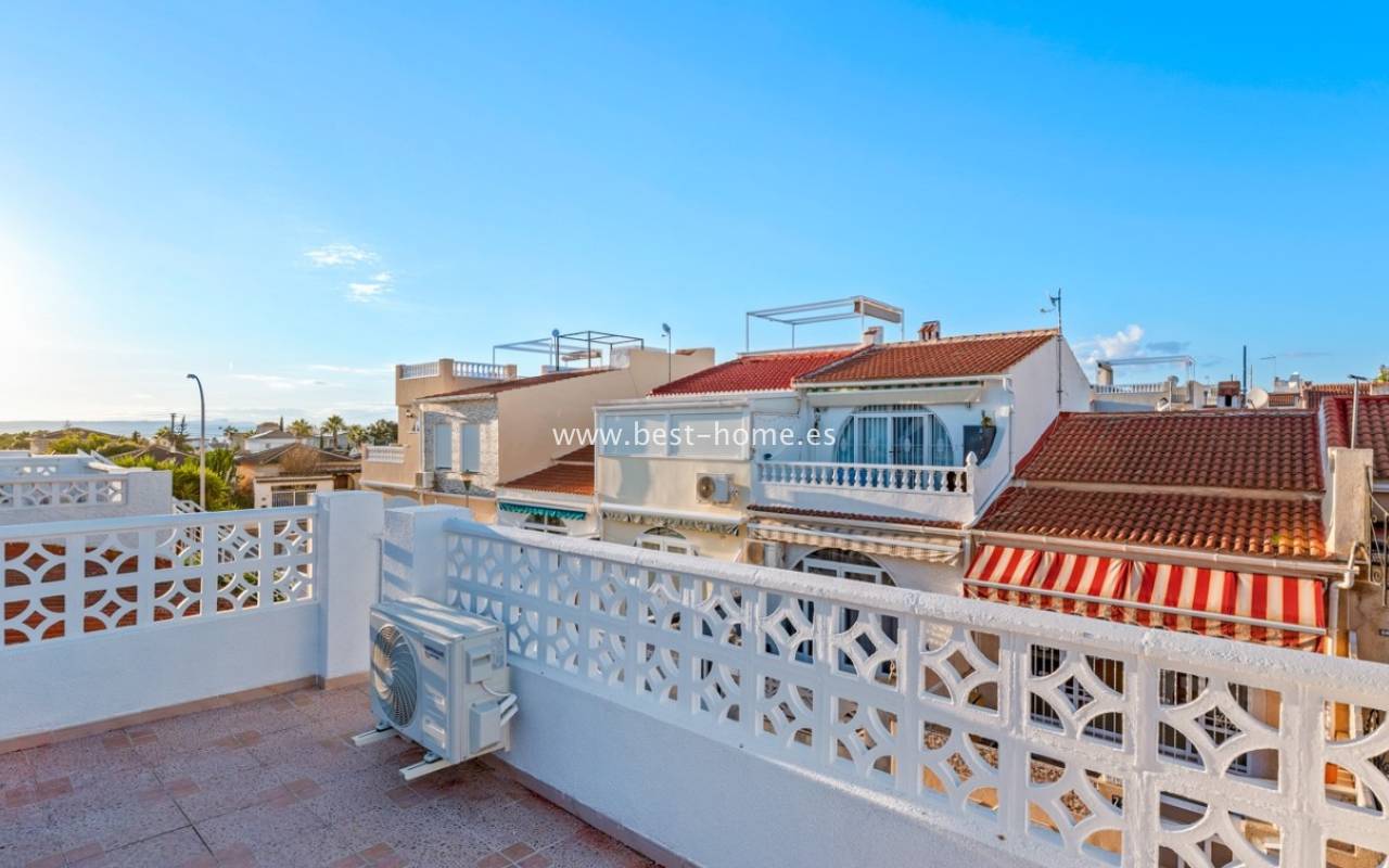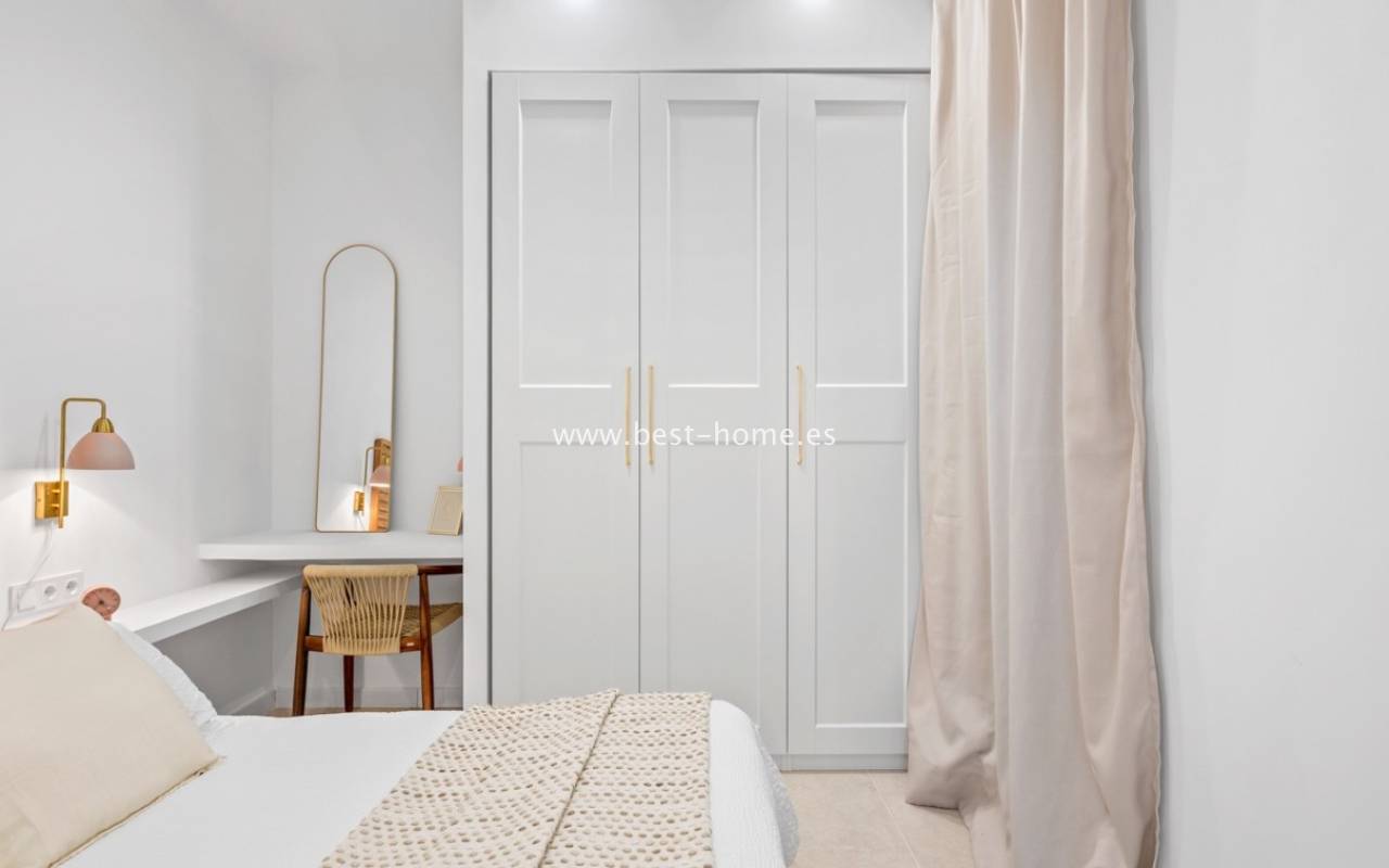 A very modern single-story bungalow with a solarium in the peaceful, quiet El Chaparral development. It features a garden/terrace, leading to a bright, spacious living room decorated in a boho style. Next, you'll find a modern kitchen equipped with high-quality appliances, two bedrooms, including a double master bedroom with built-in wardrobes, and a renovated bathroom with a shower. Upstairs, you'll find a terrace/solarium with a beautiful view of the green park, perfect for relaxing and spending time with family. Nearby, you'll find a park, numerous bars, restaurants, and a charming natural lake, perfect for walks and bike rides.