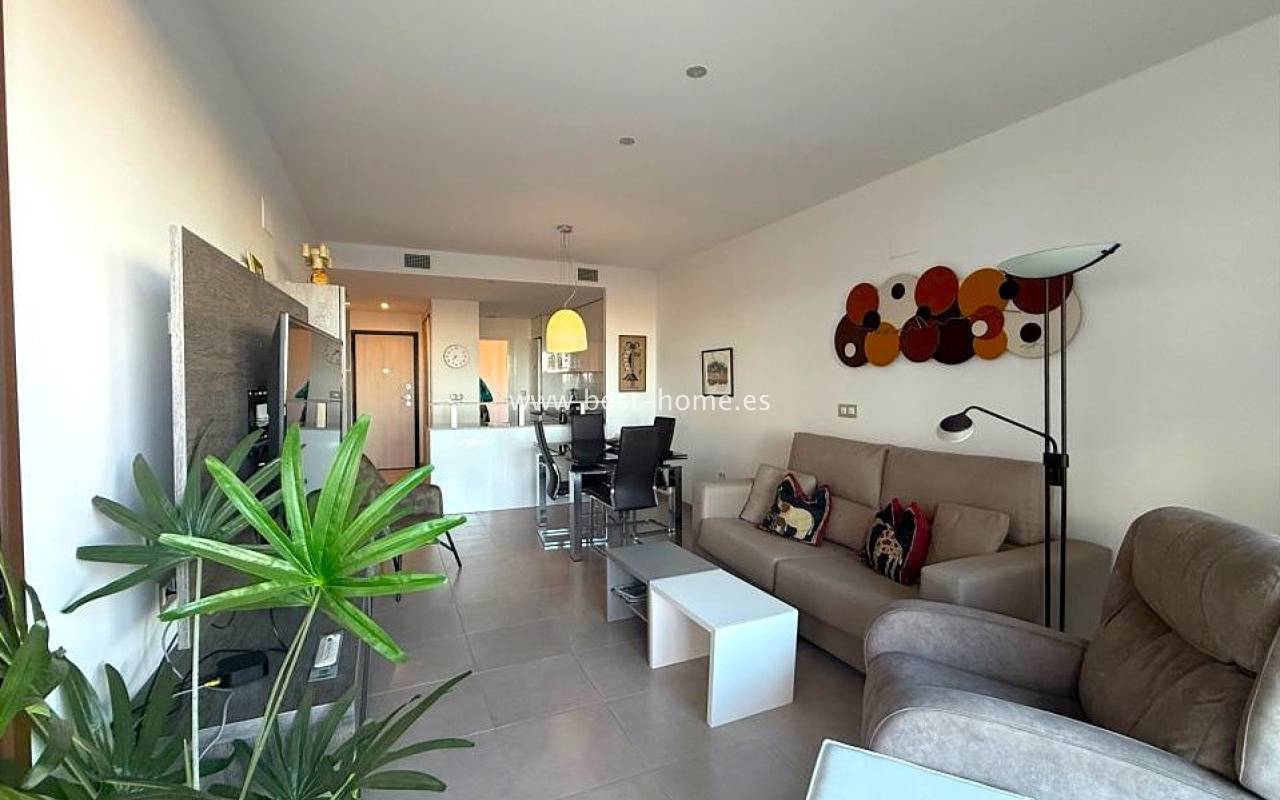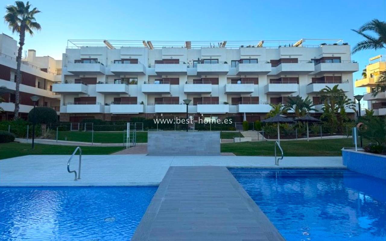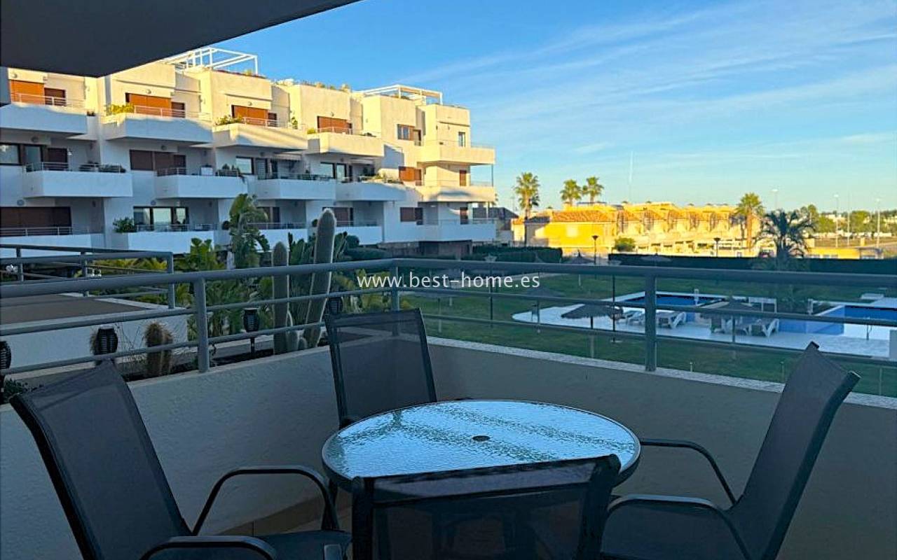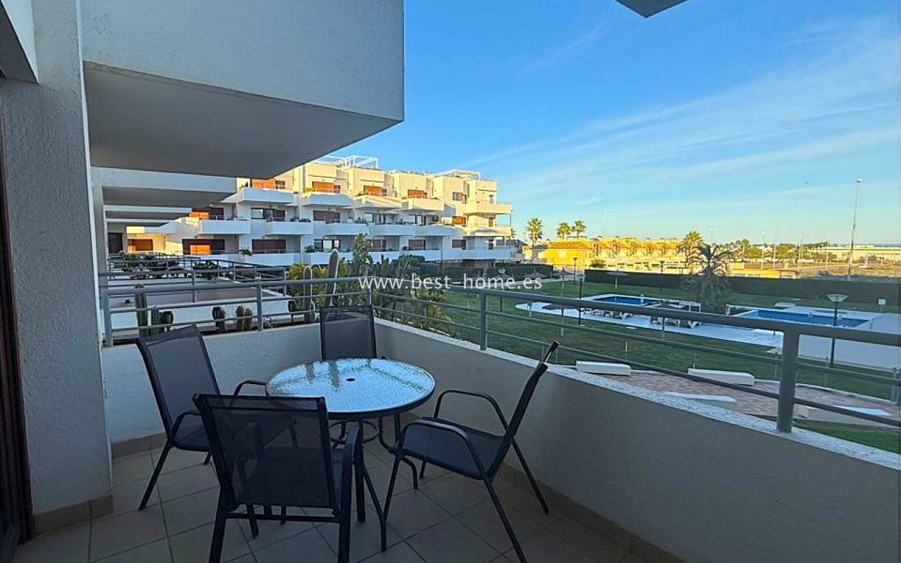 This attractive apartment is located in a gated community with swimming pools in Lomas de Cabo Roig. The property is on the first floor and comprises two bedrooms, one bathroom, a furnished kitchen with a utility room, and a spacious living room with a dining area. Both the master bedroom and living room open onto a terrace with partial views of the pool and sea. The price includes furniture, appliances, air conditioning, and a parking space.