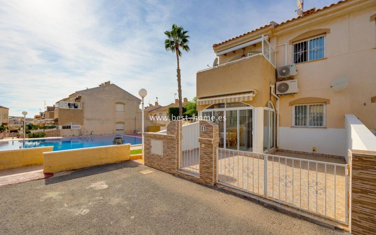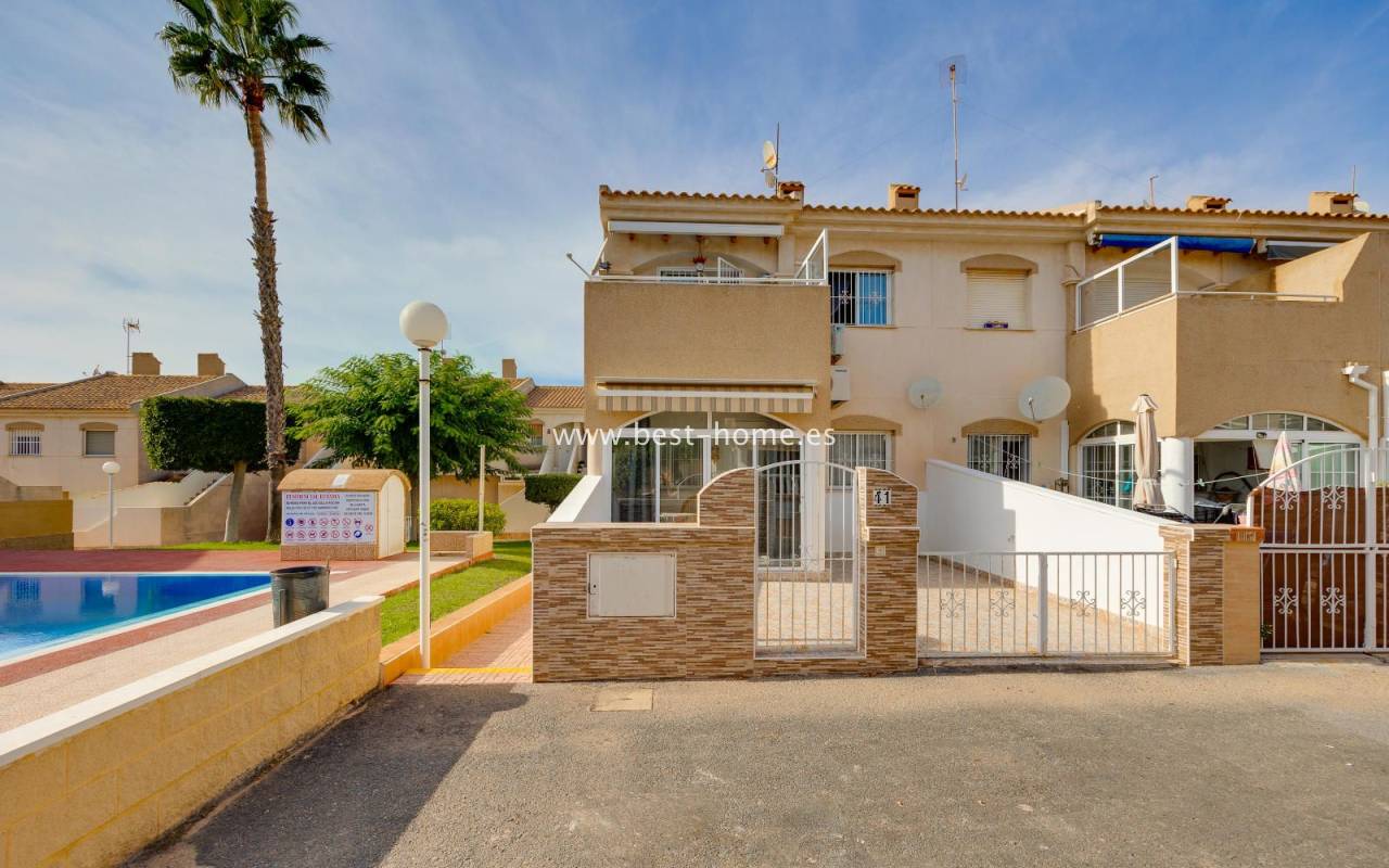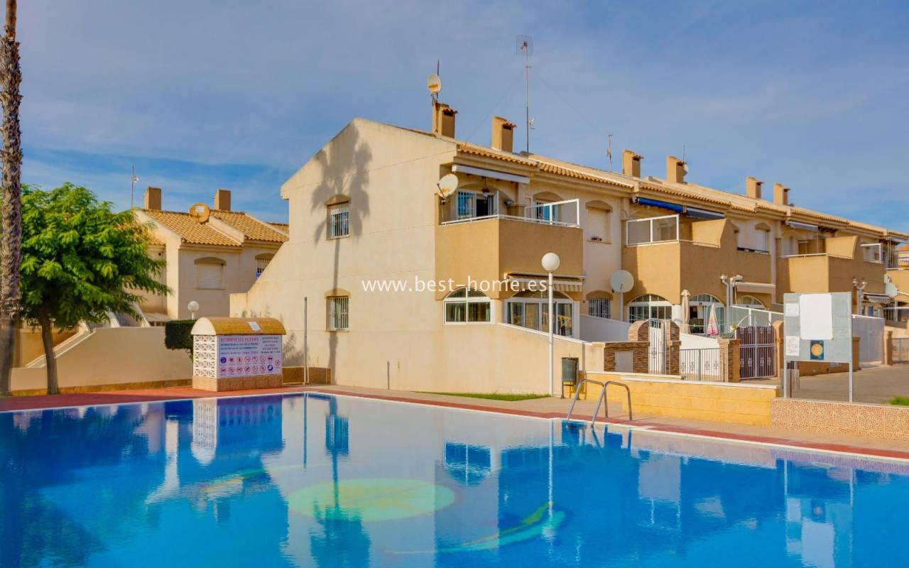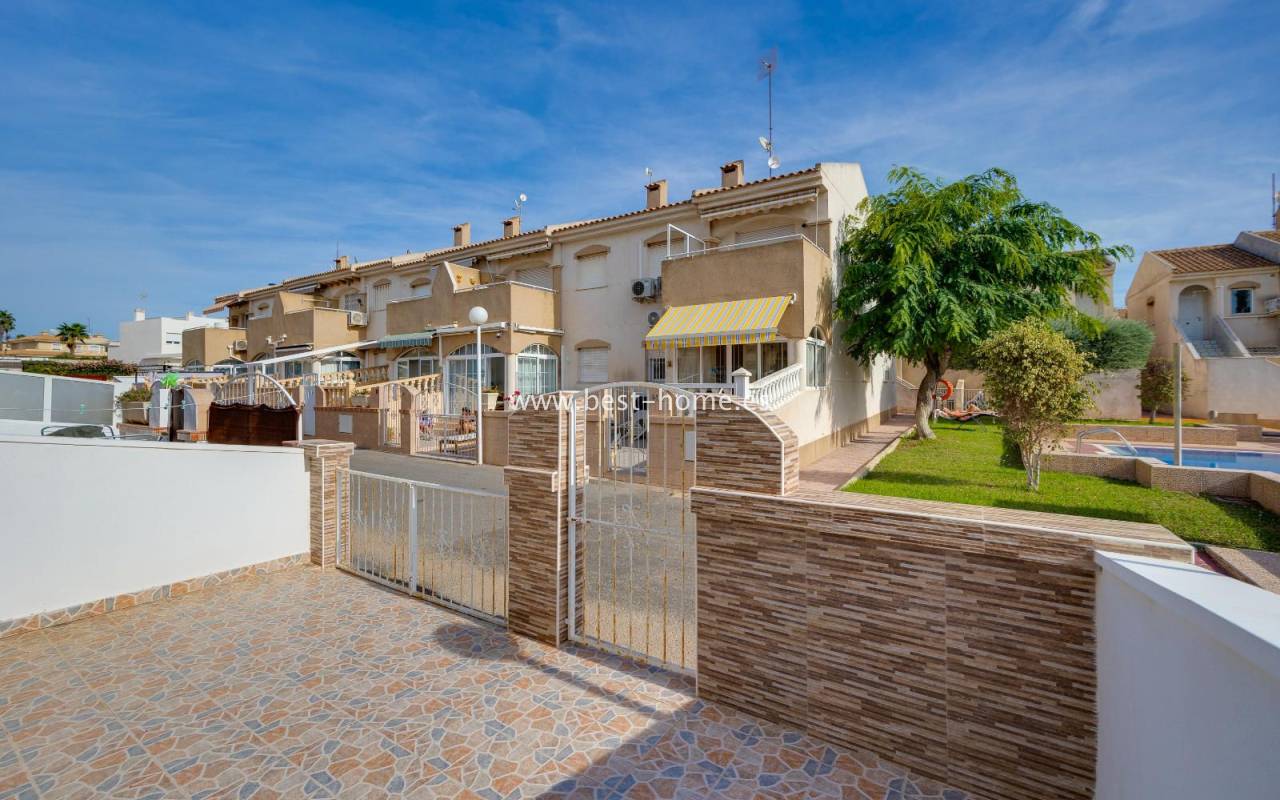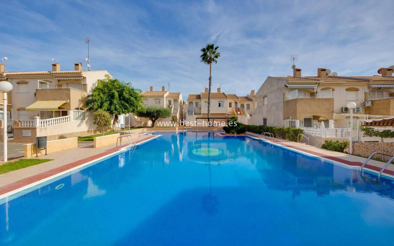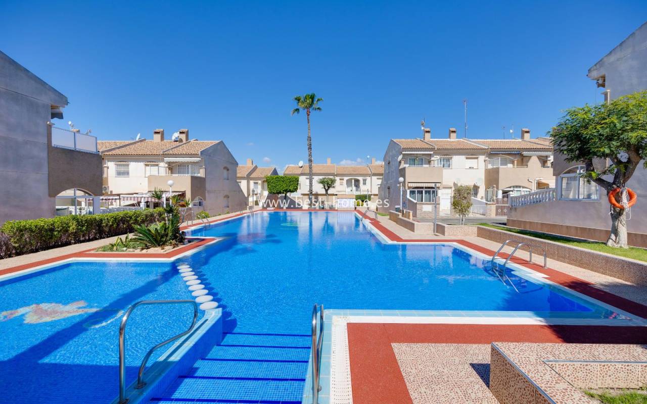 The residential complex includes a beautiful communal swimming pool surrounded by green areas, providing an ideal setting to enjoy the sun and unwind in a peaceful environment.