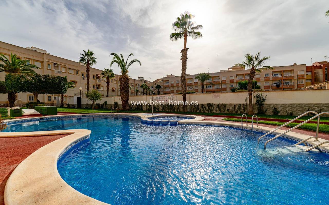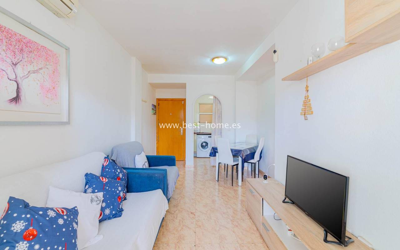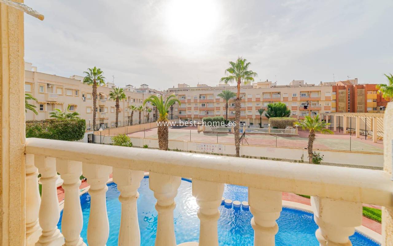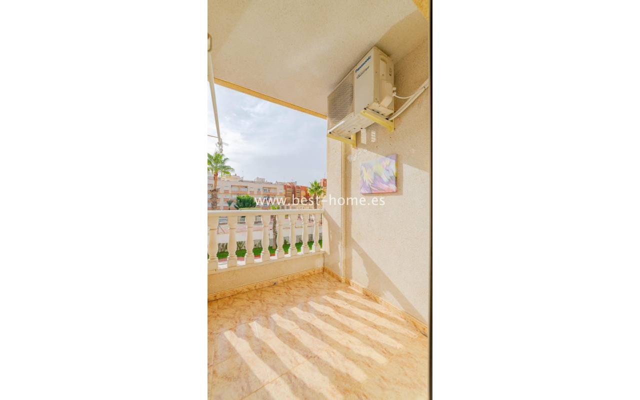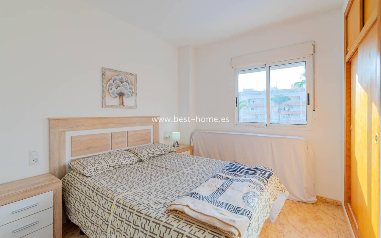 A sunny apartment with fantastic views of the palm trees and the community pool. It features a living room with access to a south-facing terrace overlooking the garden, palm trees, and the community pool. It also has two bedrooms, including a double master bedroom with a built-in wardrobe, and a bathroom with a shower. The apartment is furnished and air-conditioned. Ideal for holiday or long-term rentals, there are numerous bars, cafes, ice cream parlors, and restaurants nearby.
