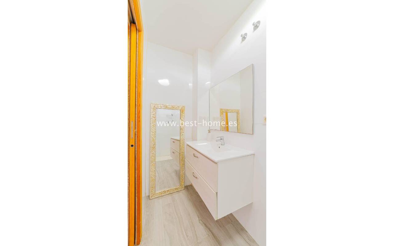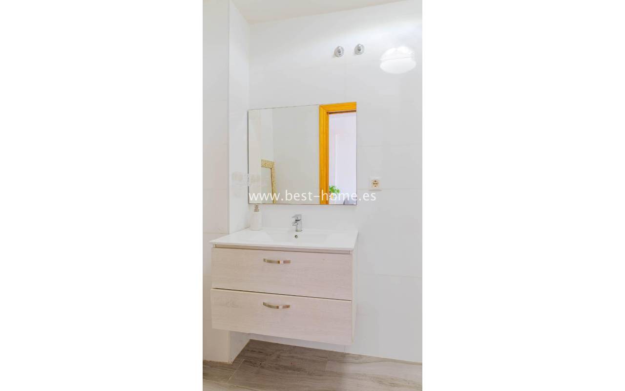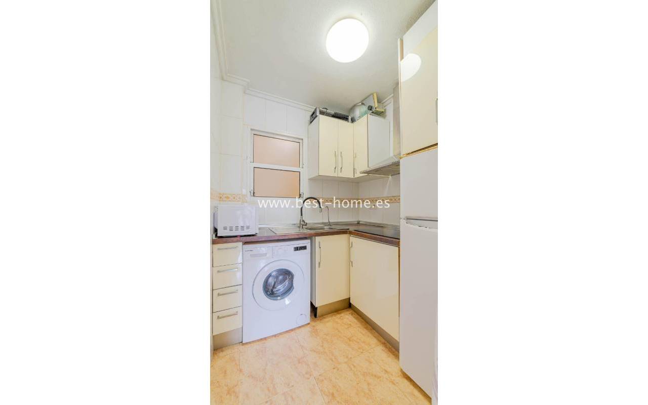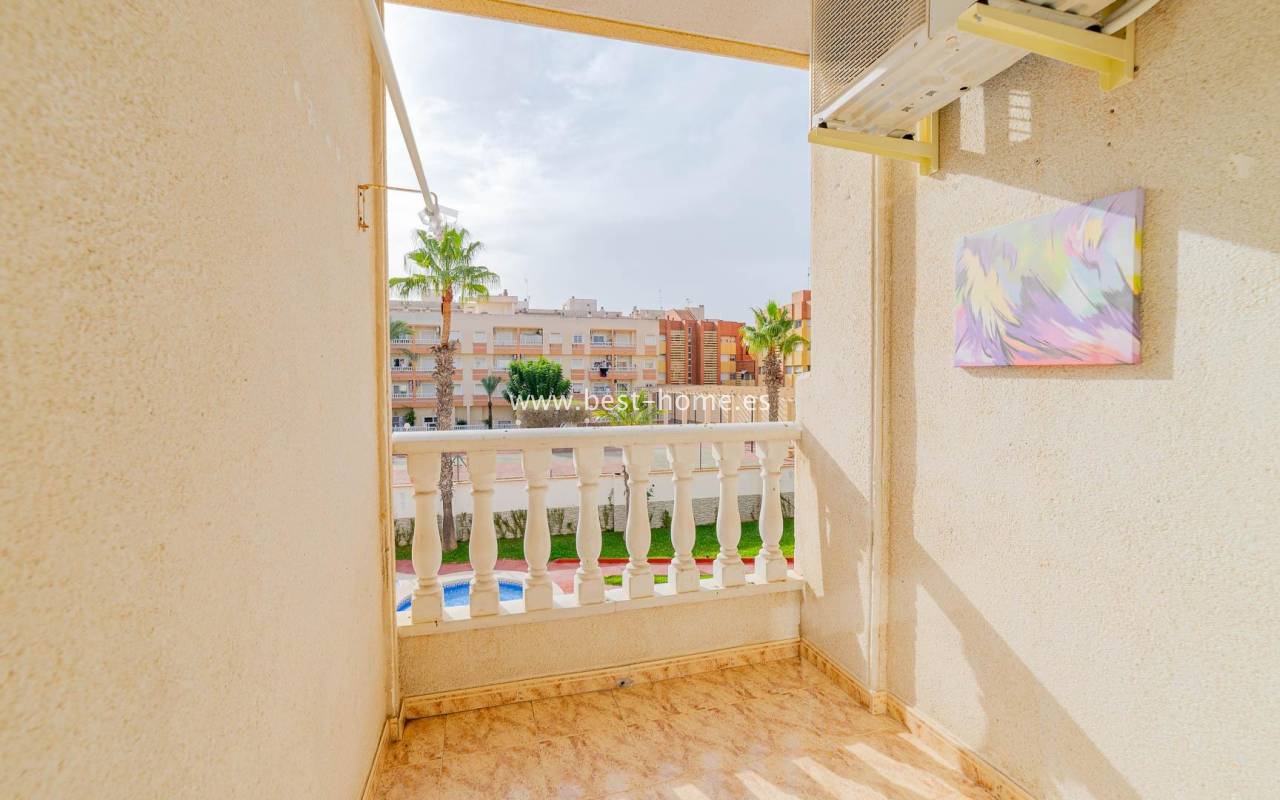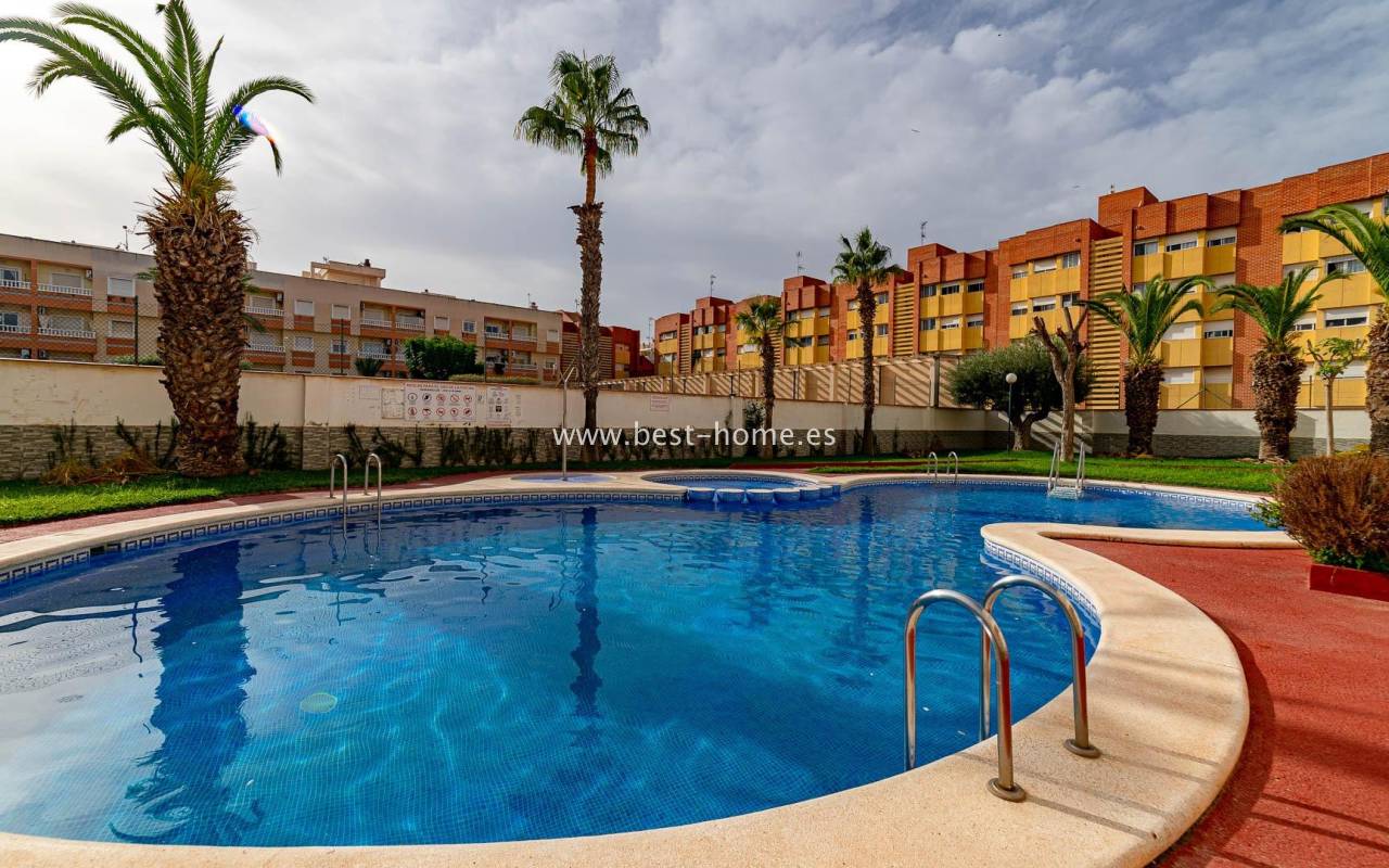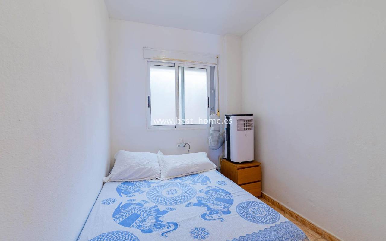 A sunny apartment with fantastic views of the palm trees and the community pool. It features a living room with access to a south-facing terrace overlooking the garden, palm trees, and the community pool. It also has two bedrooms, including a double master bedroom with a built-in wardrobe, and a bathroom with a shower. The apartment is furnished and air-conditioned. Ideal for holiday or long-term rentals, there are numerous bars, cafes, ice cream parlors, and restaurants nearby.