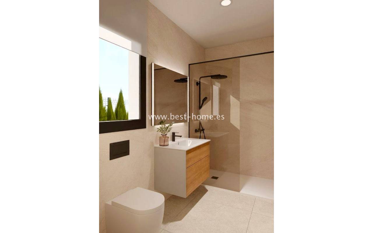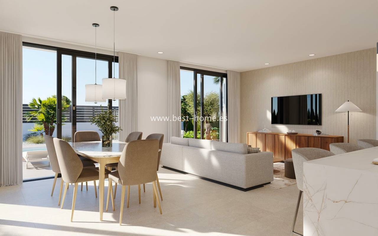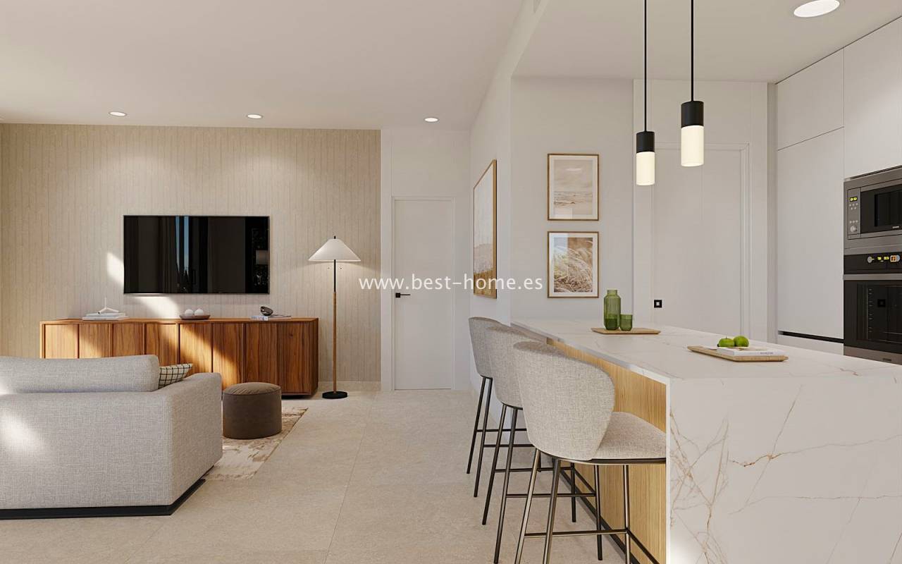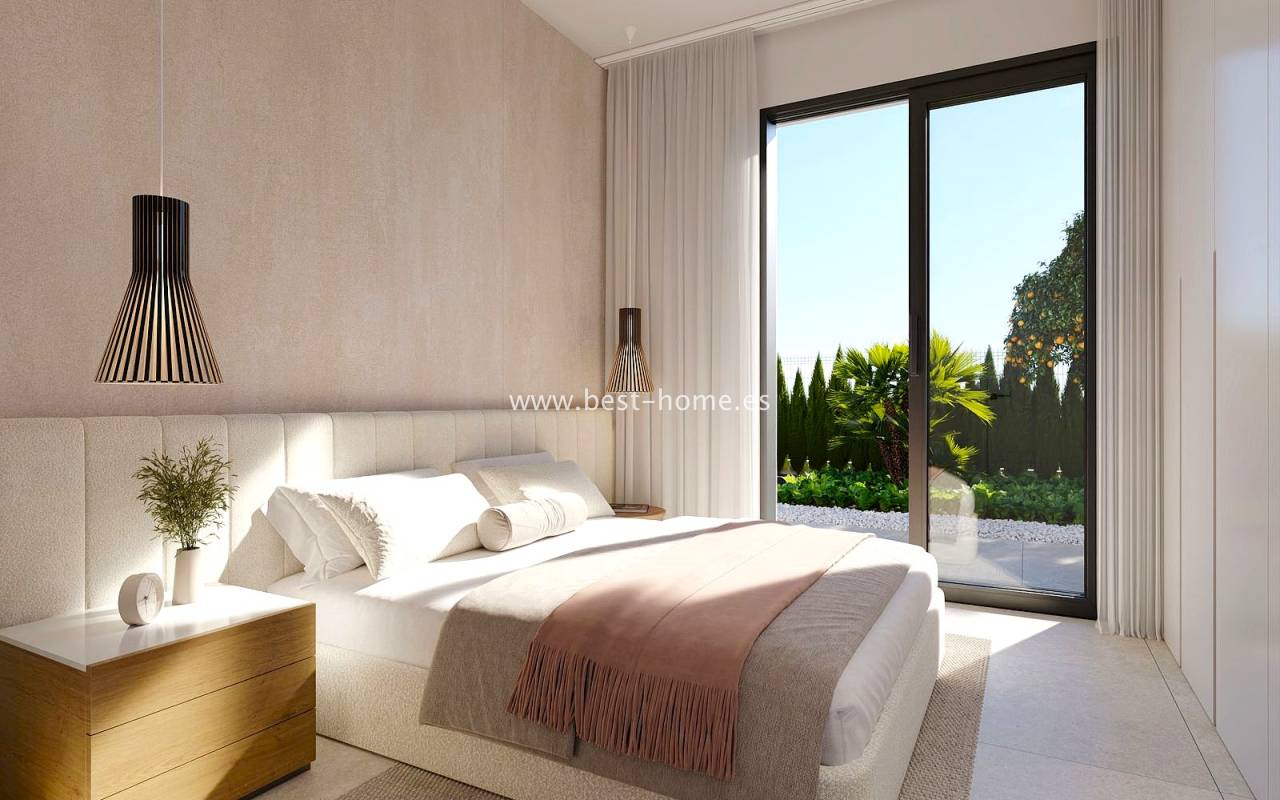 These fantastic new villas are being built within the gated Hacienda del Alamo golf resort. Twenty-six single-story homes are available on plots ranging from 302 m² to 352 m². Each property will feature two bedrooms, two full bathrooms, a utility room/laundry room, a furnished kitchen with an island, and a sunny living room with a dining area. The living/dining room will have access to a terrace, garden, and private pool. External stairs lead to a 53 m² solarium/rooftop terrace. The price includes kitchen units, built-in wardrobes, finished bathrooms, LED lighting, pre-installed central air conditioning, and a private swimming pool (2.4 x 6 m). The resort also features a sports center, a 4-star hotel, and numerous restaurants and bars.