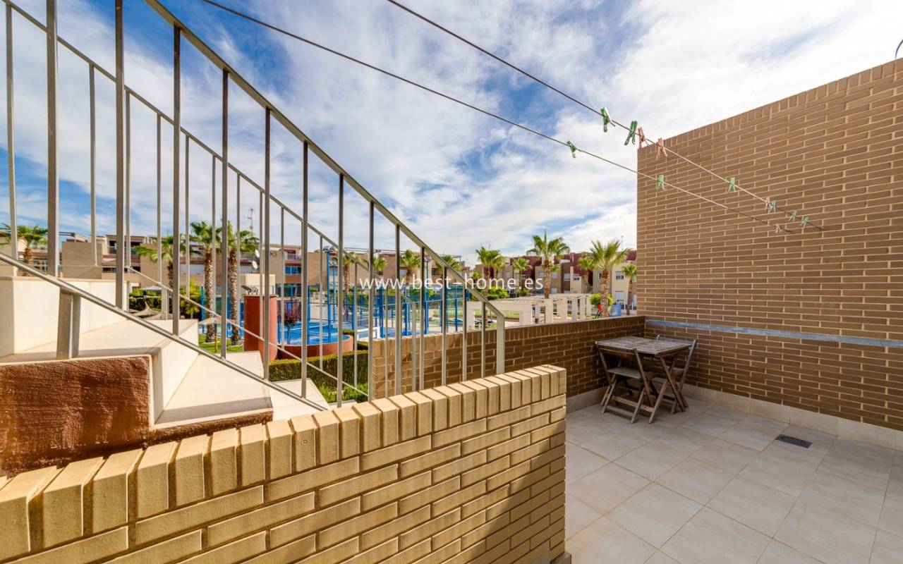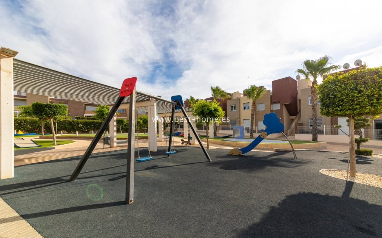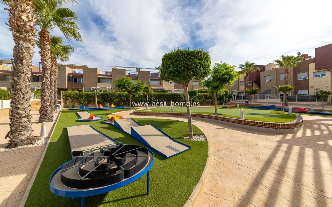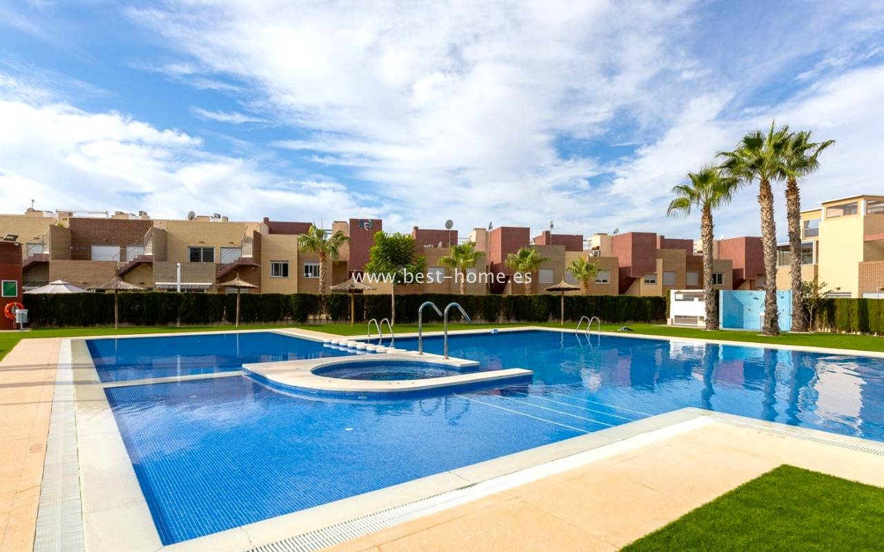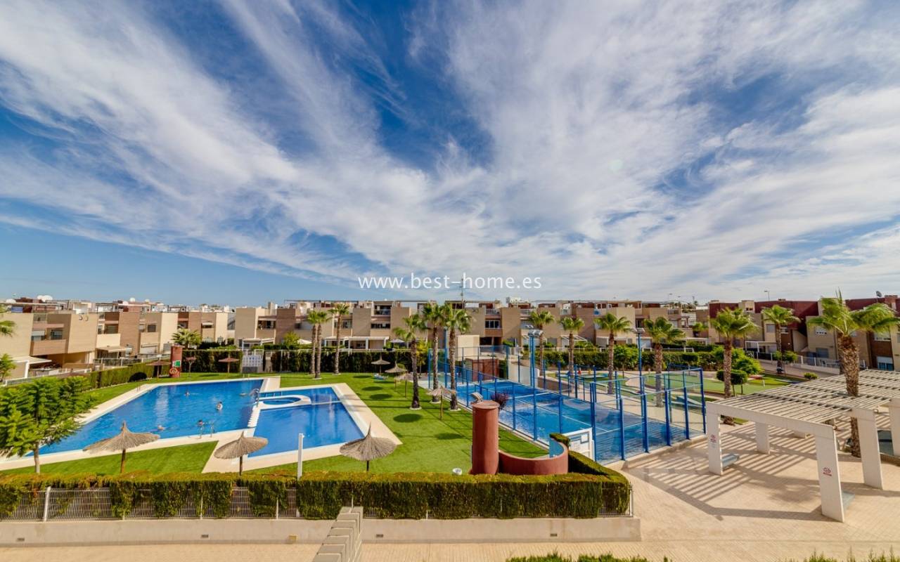 This well-maintained townhouse is located in a gated community in the quiet Aguas Nuevas neighborhood. On the ground floor, you'll find a living room with a dining area and a furnished kitchen, along with one bedroom and a bathroom. The living room opens onto a garden (approx. 41 m²). On the first floor, there are two bedrooms and another bathroom. Both bedrooms open onto a terrace, which leads to a solarium (rooftop terrace). Here, you'll find a barbecue area and a shower. The communal areas include a swimming pool, a paddle tennis court, a playground, and a mini-golf course. The price includes furniture, appliances, and air conditioning.