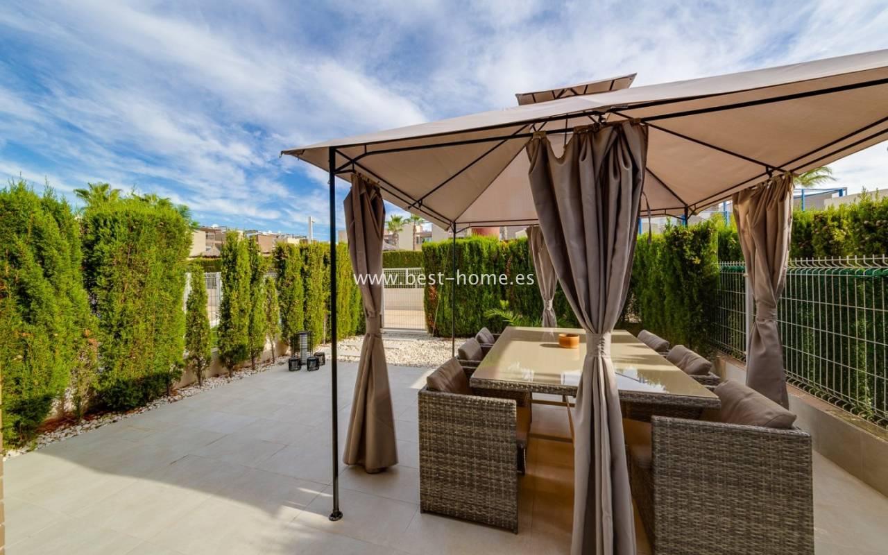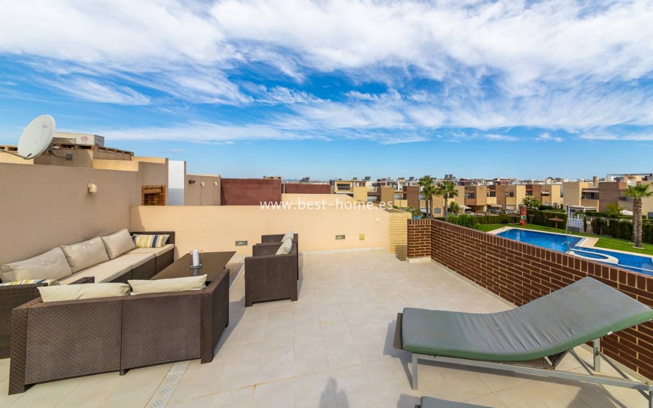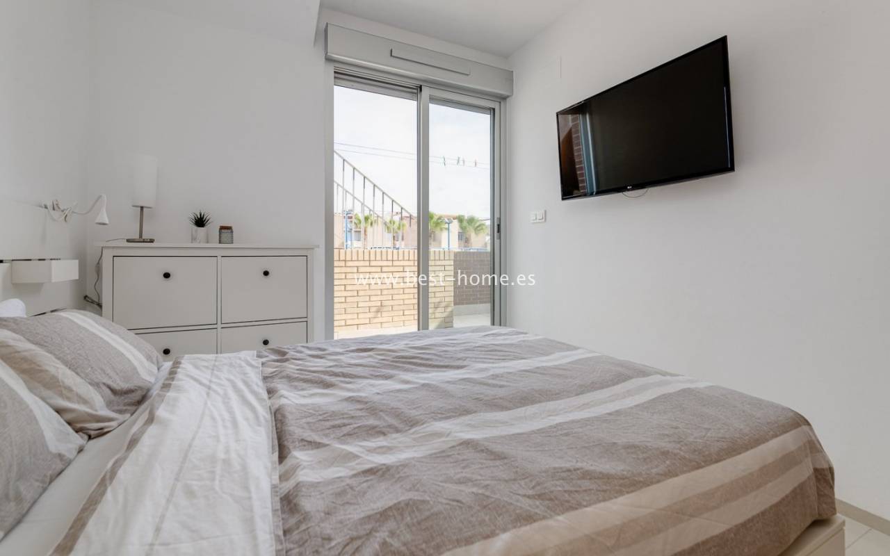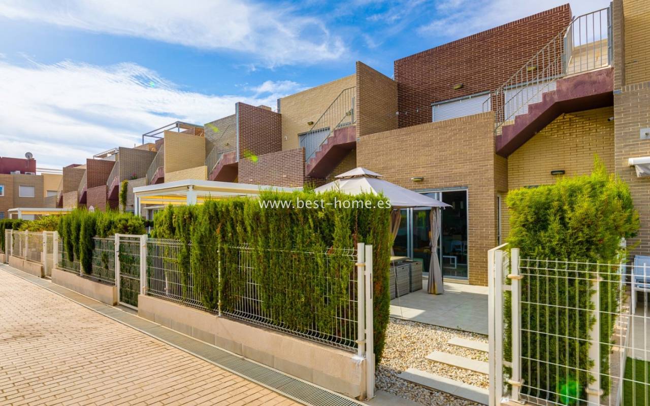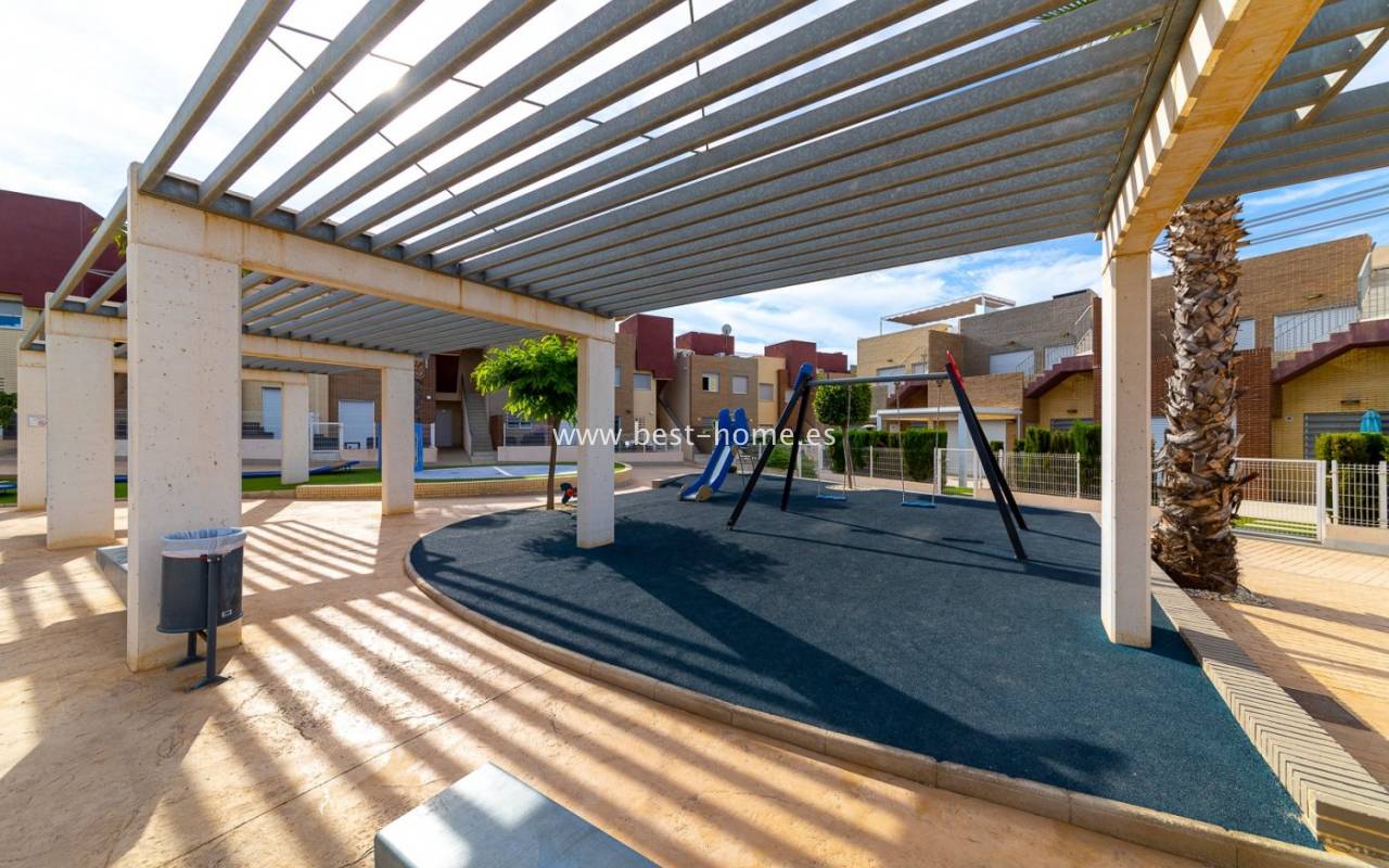 This well-maintained townhouse is located in a gated community in the quiet Aguas Nuevas neighborhood. On the ground floor, you'll find a living room with a dining area and a furnished kitchen, along with one bedroom and a bathroom. The living room opens onto a garden (approx. 41 m²). On the first floor, there are two bedrooms and another bathroom. Both bedrooms open onto a terrace, which leads to a solarium (rooftop terrace). Here, you'll find a barbecue area and a shower. The communal areas include a swimming pool, a paddle tennis court, a playground, and a mini-golf course. The price includes furniture, appliances, and air conditioning.