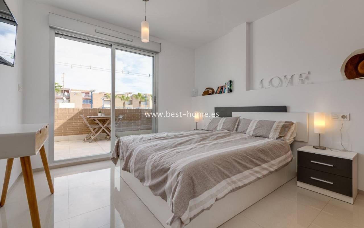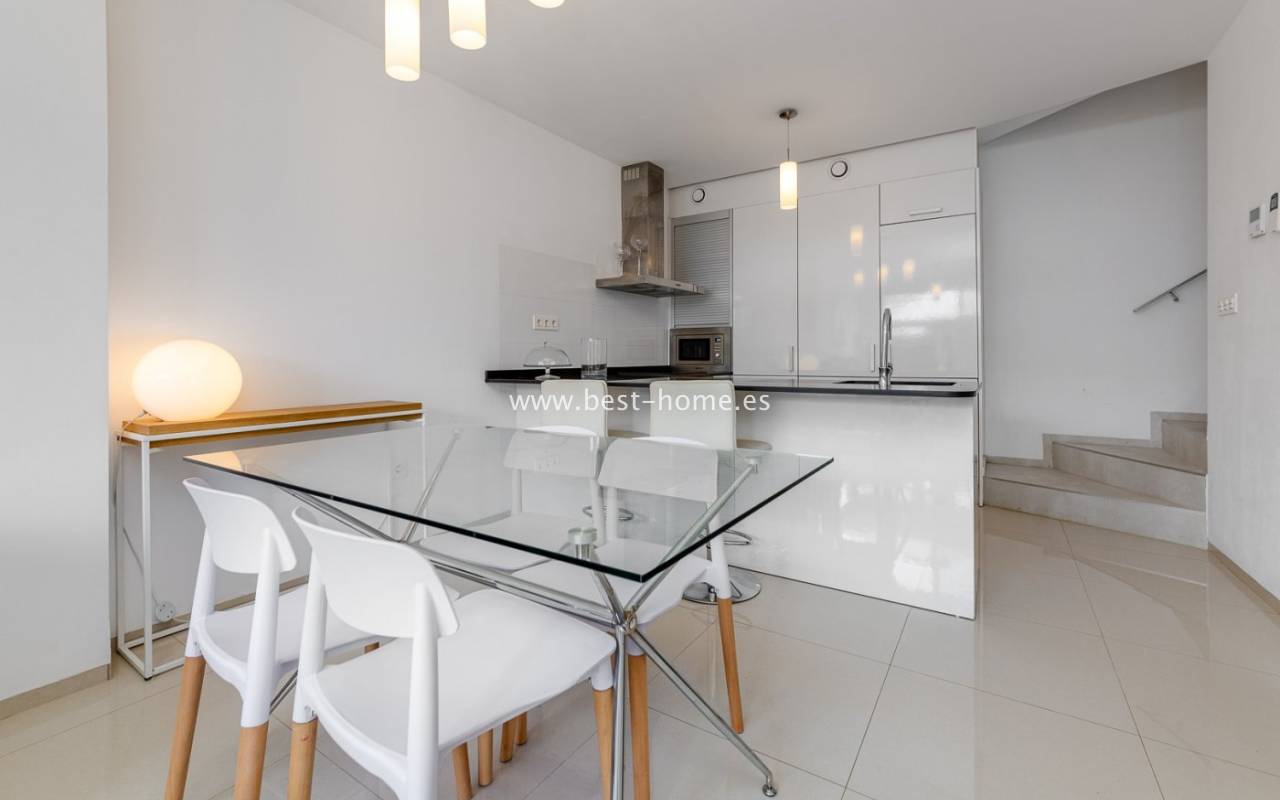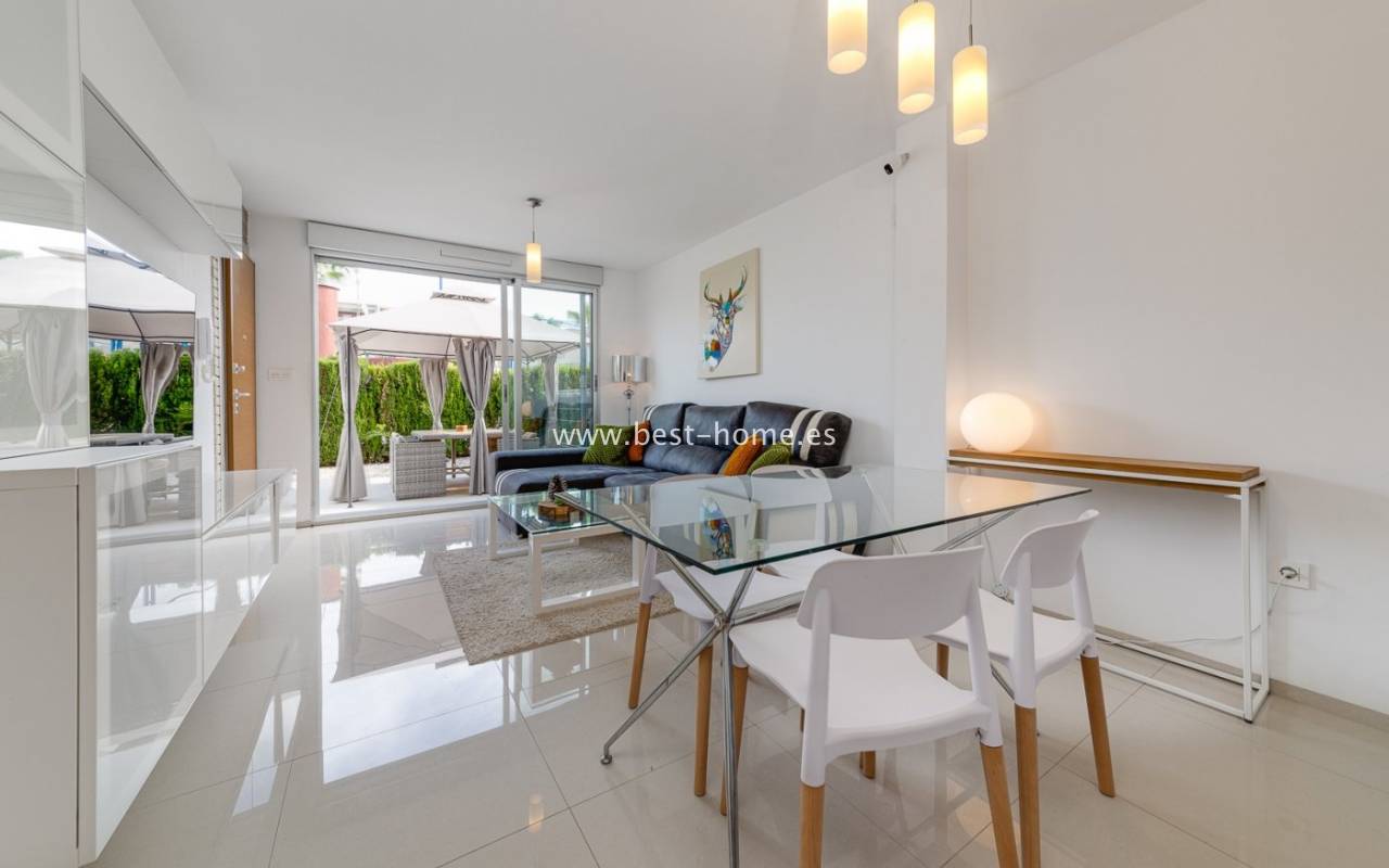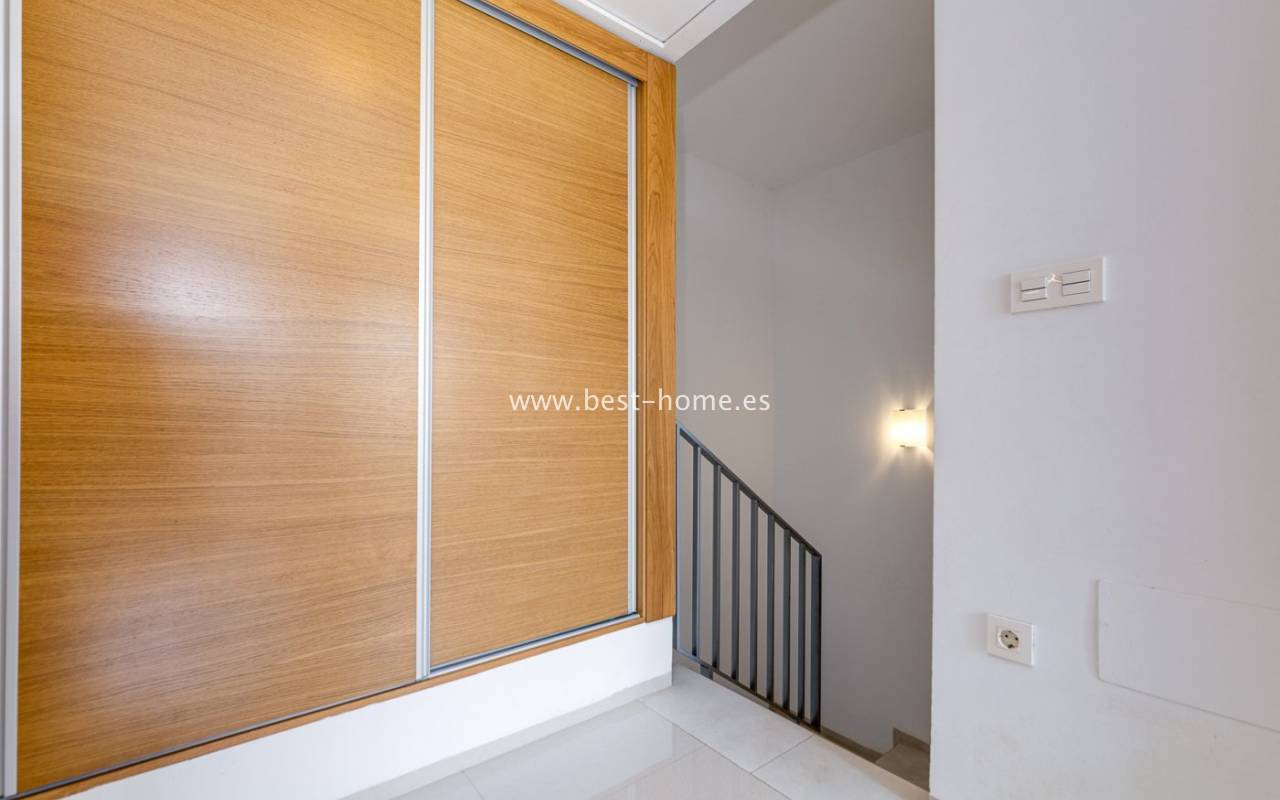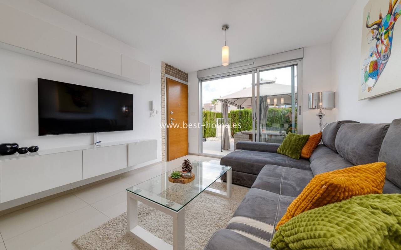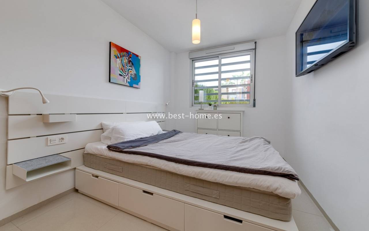This well-maintained townhouse is located in a gated community in the quiet Aguas Nuevas neighborhood. On the ground floor, you'll find a living room with a dining area and a furnished kitchen, along with one bedroom and a bathroom. The living room opens onto a garden (approx. 41 m²). On the first floor, there are two bedrooms and another bathroom. Both bedrooms open onto a terrace, which leads to a solarium (rooftop terrace). Here, you'll find a barbecue area and a shower. The communal areas include a swimming pool, a paddle tennis court, a playground, and a mini-golf course. The price includes furniture, appliances, and air conditioning.