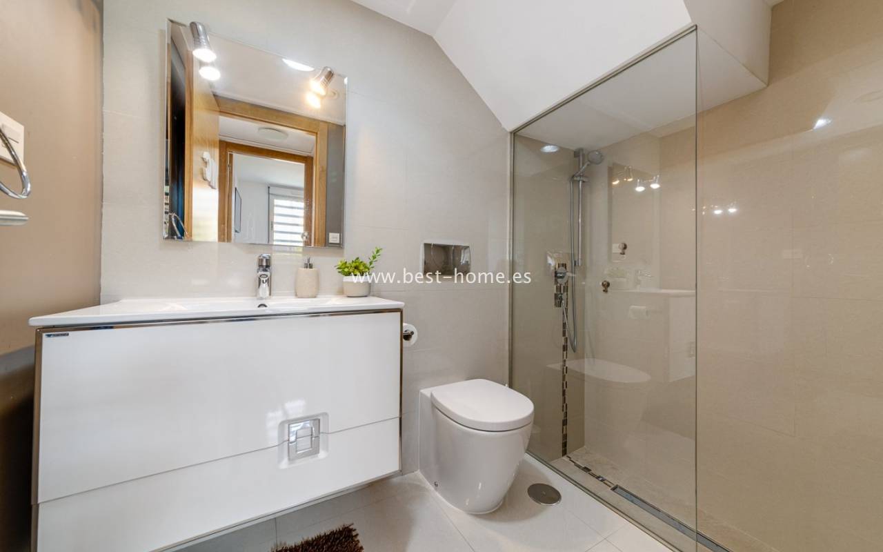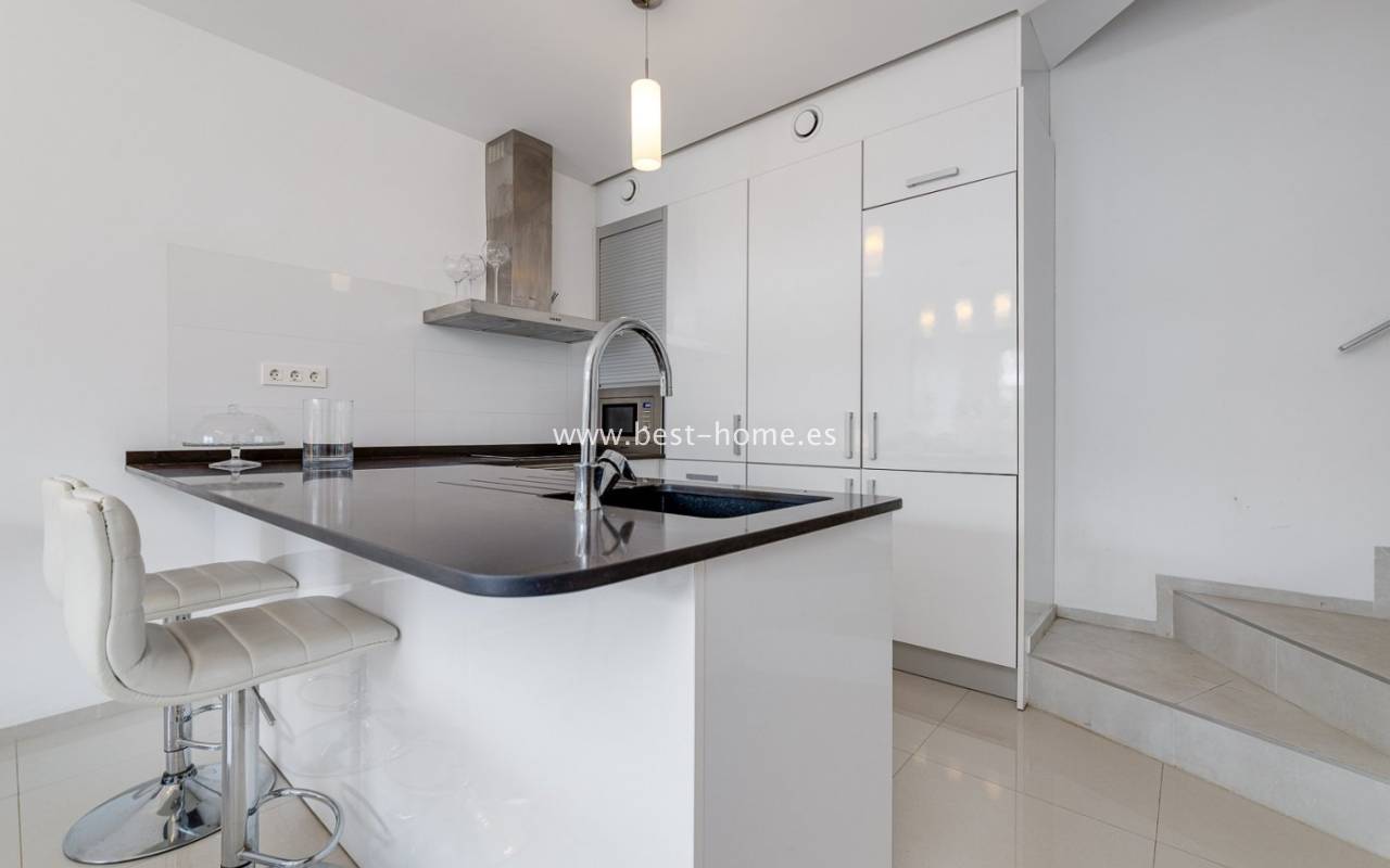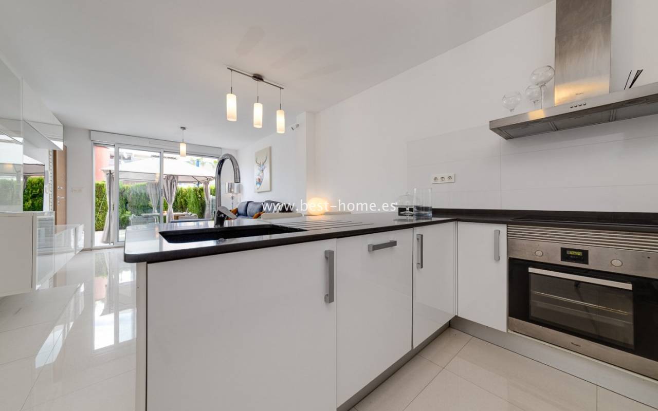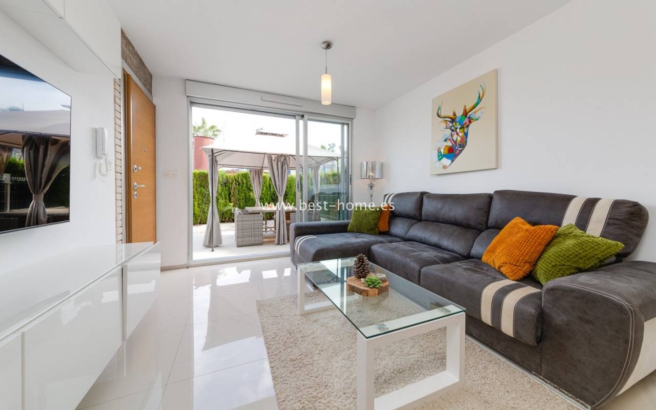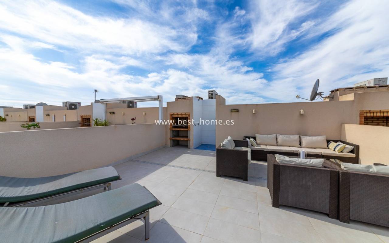 This well-maintained townhouse is located in a gated community in the quiet Aguas Nuevas neighborhood. On the ground floor, you'll find a living room with a dining area and a furnished kitchen, along with one bedroom and a bathroom. The living room opens onto a garden (approx. 41 m²). On the first floor, there are two bedrooms and another bathroom. Both bedrooms open onto a terrace, which leads to a solarium (rooftop terrace). Here, you'll find a barbecue area and a shower. The communal areas include a swimming pool, a paddle tennis court, a playground, and a mini-golf course. The price includes furniture, appliances, and air conditioning.