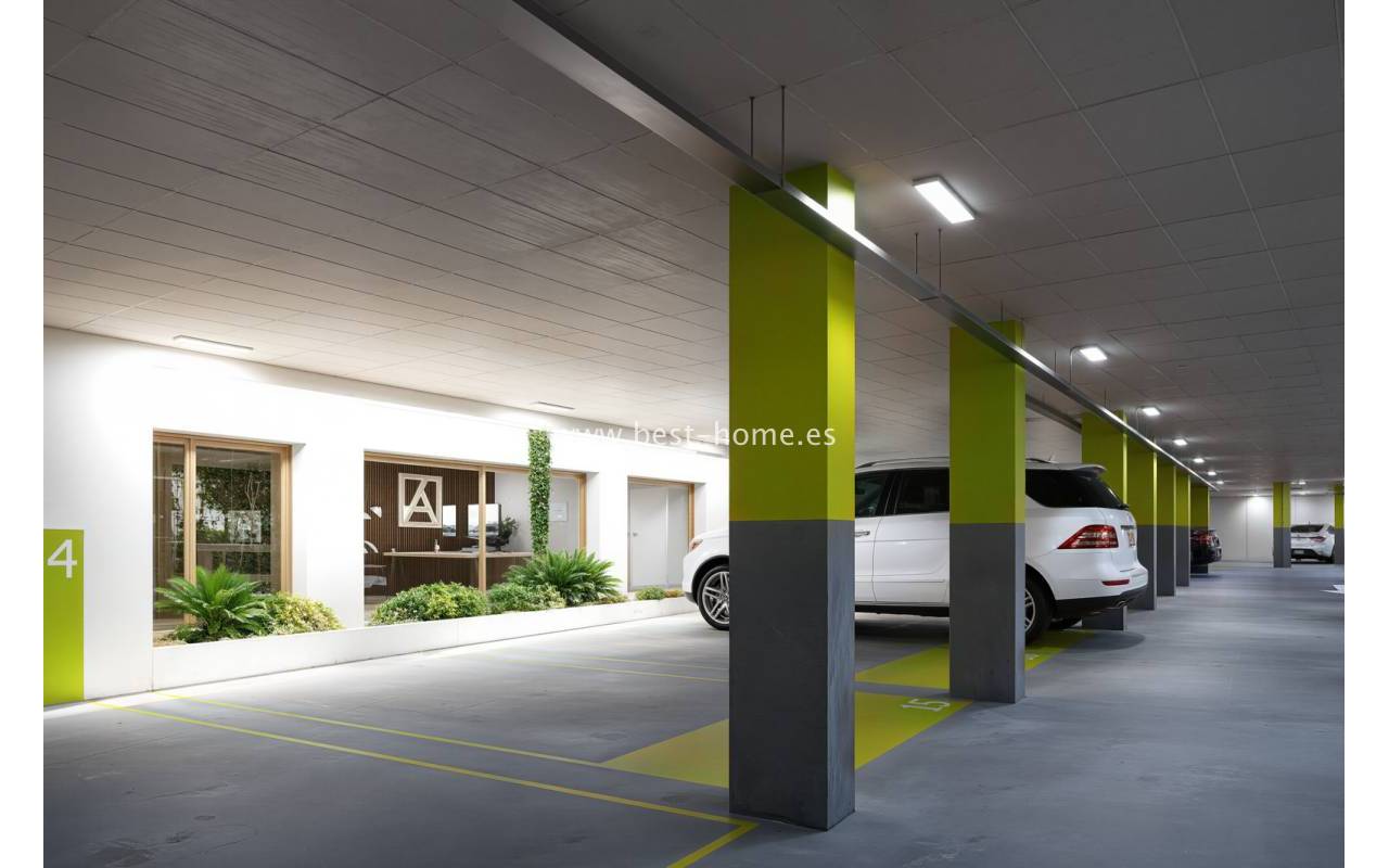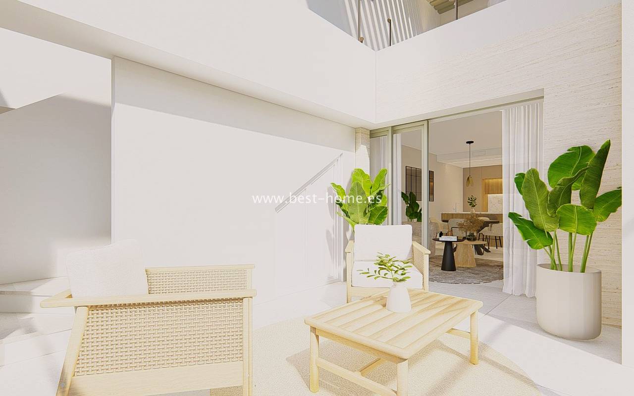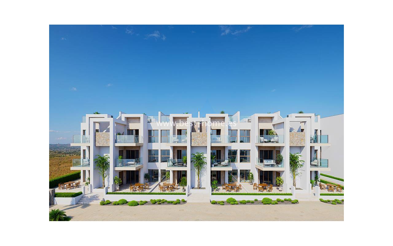 A new development of 66 apartments is being built next to the Los Alcazares golf course. Spacious penthouses are available, each with three bedrooms, two bathrooms, and a fitted kitchen with a dining area and living room. The living room opens onto a 12 m² terrace, which leads to an 80 m² solarium. A summer kitchen and jacuzzi can be added to the solarium for an additional fee. The price includes a fitted kitchen with appliances, central hot/cold air conditioning, electric blinds, LED lighting, finished bathrooms, and a parking space in the basement. The development also features a magnificent swimming pool surrounded by greenery, sunbathing areas, a spa area, sauna, gym, children's playground, and a boules court. Prices start from €409,000.