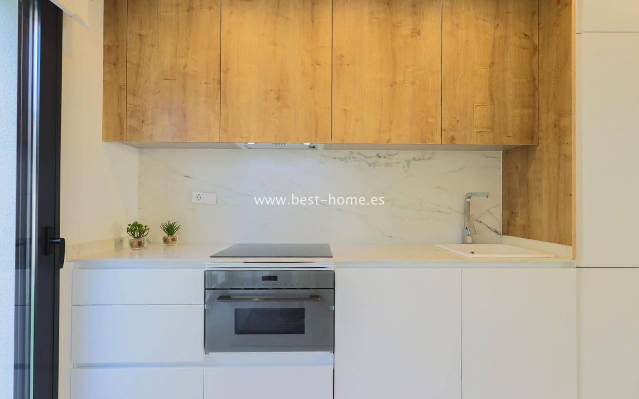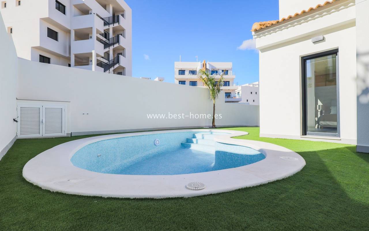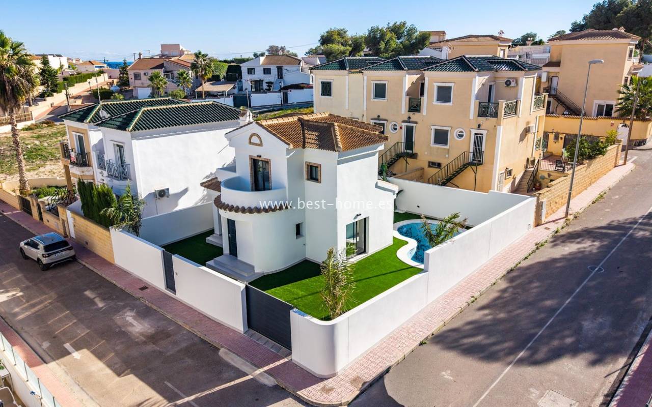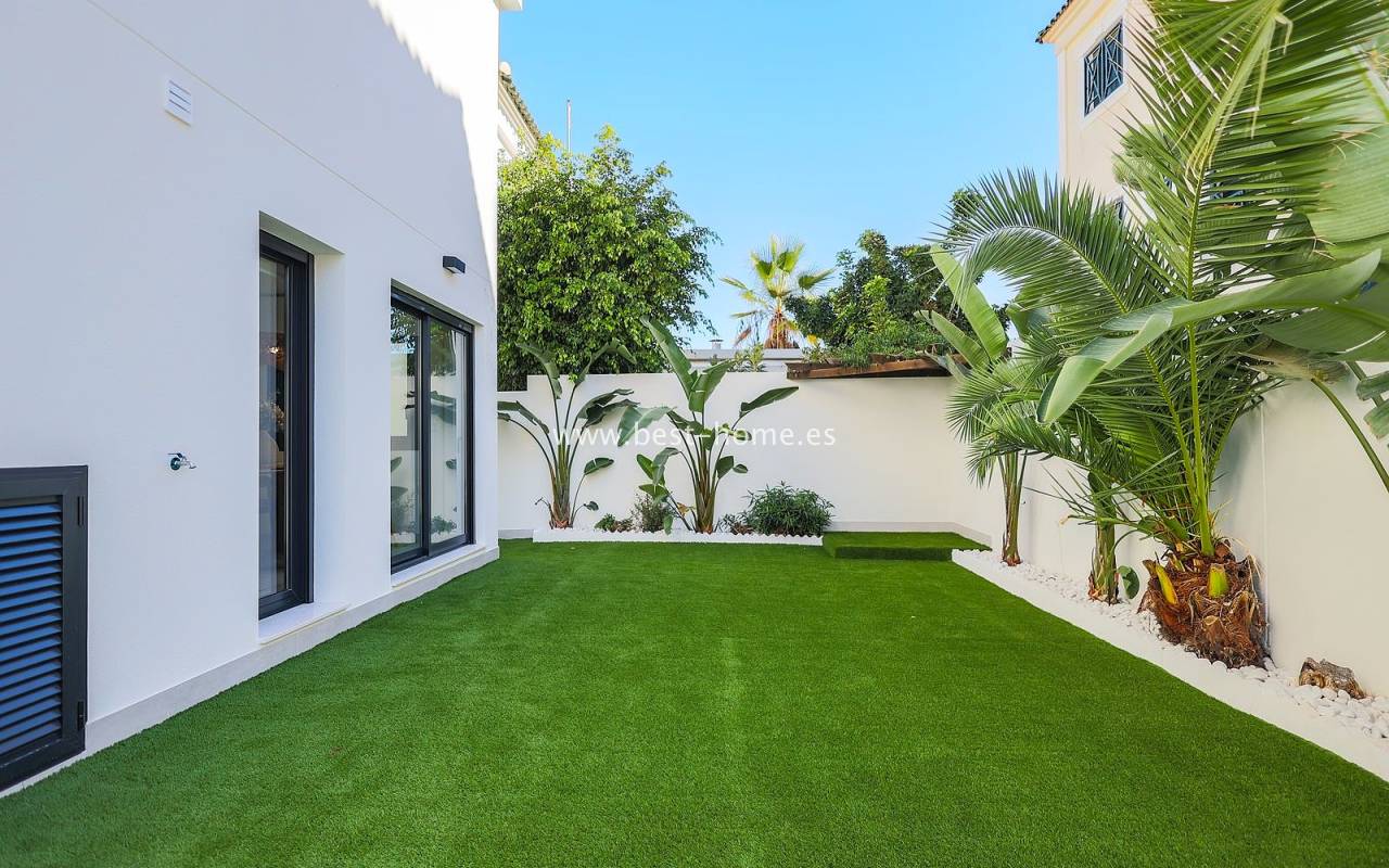 This renovated villa is located near the quiet Villamartin neighborhood. The property comprises three bedrooms, two bathrooms, and a furnished kitchen with a dining area and living room. The price includes furniture, appliances, central air conditioning, electric blinds, and a private pool.