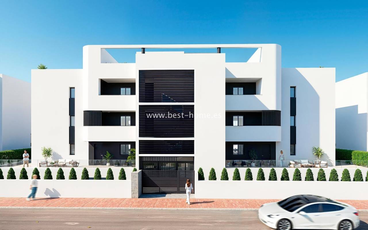 This new, attractive development is being built in a prime location, just one coastline from the golf course. The gated community will feature four blocks of spacious apartments and villas. The two-story building offers apartments with two bedrooms, two bathrooms, and a furnished kitchen with a bar, connected to the dining area and living room. All rooms will have access to a 24 m² terrace. The price includes kitchen units (hood, cooktop), pre-installation of central air conditioning, electric exterior blinds, finished bathrooms, and a parking space. A swimming pool and communal gardens are available for residents. Prices start from €299,000.