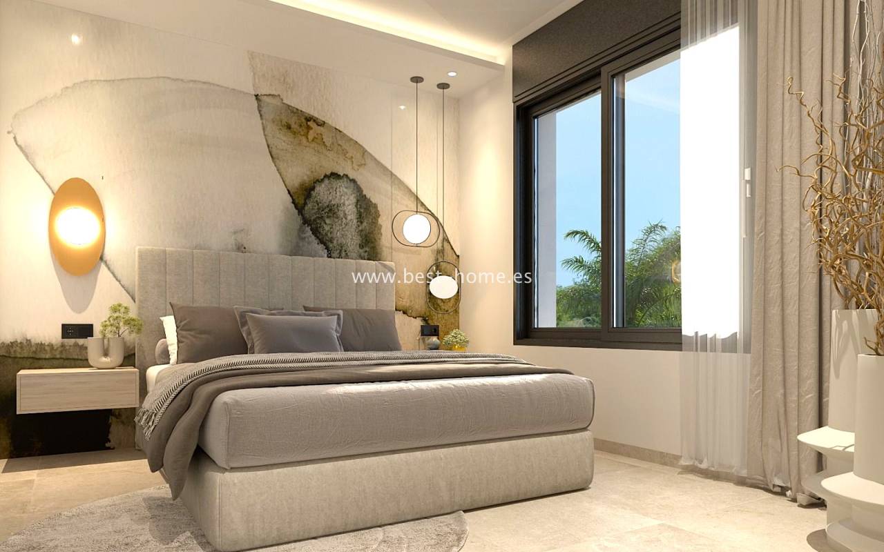 This new, intimate development of eight villas (two detached and six semi-detached) is being built in a quiet location in Villamartin. Each ground floor property will feature an entrance hallway, a toilet, a fitted kitchen with an island and dining area on one side, and a spacious living room on the other. These rooms will have access to the garden. The first floor will feature three large bedrooms with fitted wardrobes and two bathrooms with double sinks. High-quality finishes, a beautiful combination of natural stone and wood, include kitchen units, fully equipped bathrooms with underfloor heating, electric blinds, an alarm system, pre-installed air conditioning, and a private swimming pool with fountains. Possibility of creating a basement or roof terrace. The plots are 300 m². Prices range from €559,000 to €589,000.