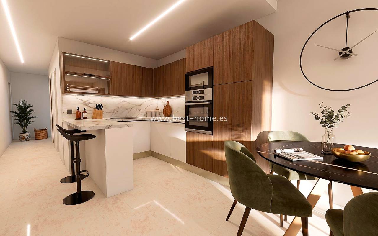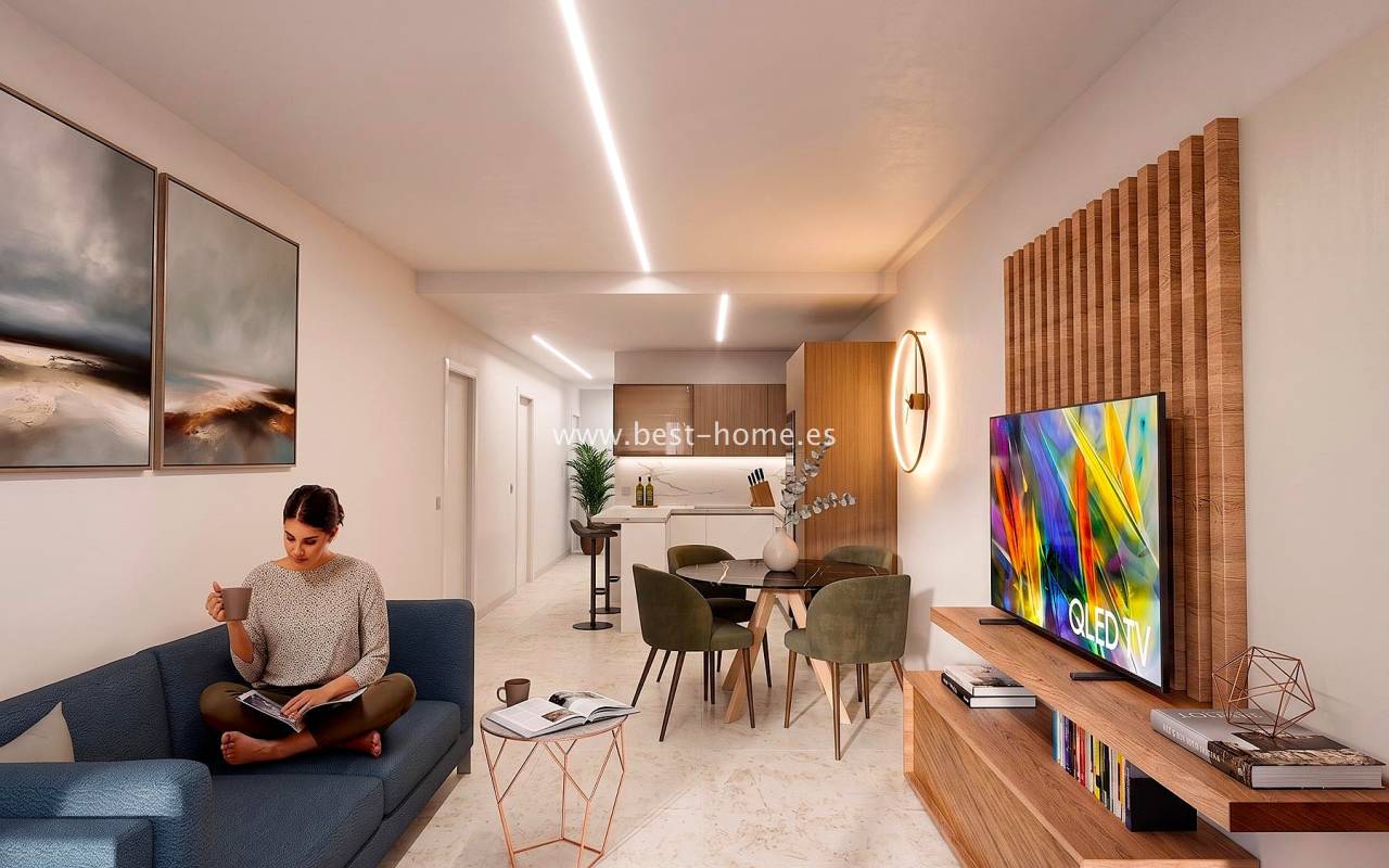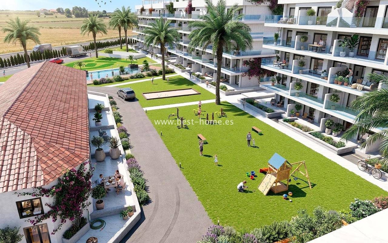 This new development is being built in a quiet location in El Raso. Spacious apartments with 3 bedrooms, 2 bathrooms, a fitted kitchen with a bar, and a utility room are available. The master bedroom and living room open onto a terrace overlooking the communal areas. The price includes appliances, central air conditioning, electric blinds, full LED lighting, complete bathrooms, furnishings with dishes, and a parking space and storage unit in the basement. Within the gated community, you'll find a communal swimming pool, gym, children's playground, boules court, and spa.