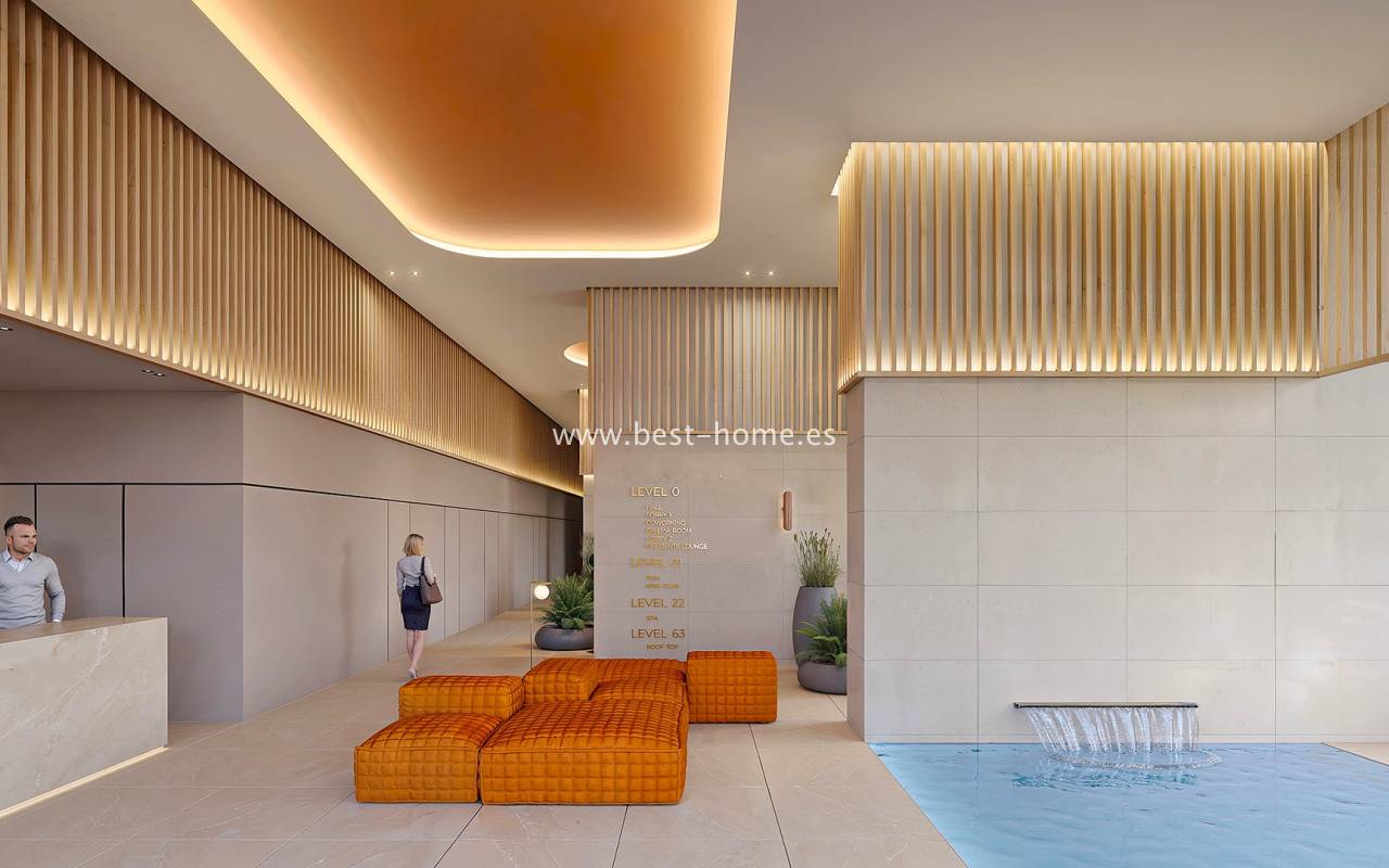 Communal areas will include large adult swimming pools, a heated pool, a children's pool with a play area, a jacuzzi and chill-out area, a café, and areas for playing billiards and darts. Family-friendly amenities include a cinema, lobby, a children's club room with indoor and outdoor spaces for events, and a video game room equipped with the latest technology. Tennis and paddle courts, as well as a multi-purpose sports field, will also be found on the 21st floor. Two fully equipped gyms, a yoga and pilates room, all with sea views, will be available. On the 22nd floor, there will be a spa area with three jacuzzis, a heated swimming pool, a relaxation and massage area, heated loungers, a Finnish sauna, a Turkish bath, and sensational showers, all surrounded by greenery. Residents on the 63rd, top floor will have a terrace (250 m²) with a bar, areas for relaxing and meeting friends, stools, and fantastic panoramic views of the sea and mountains. There will also be an area with telescopes for stargazing.