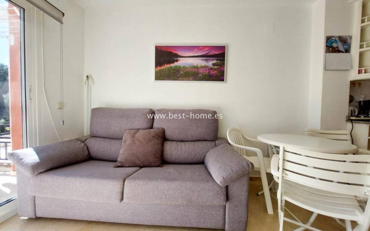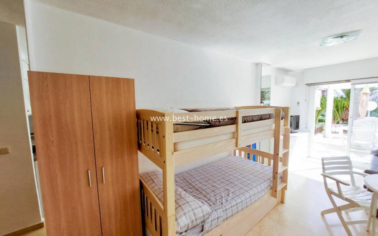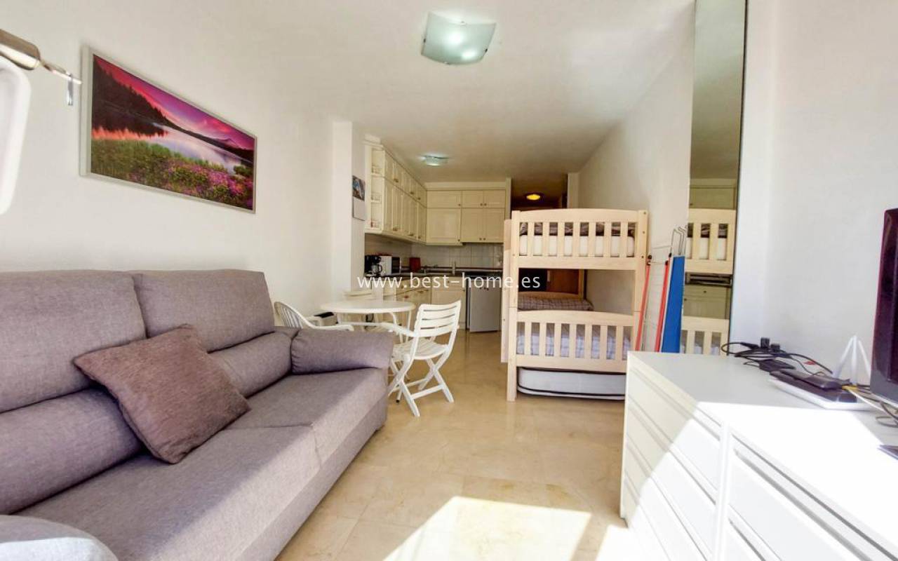 Studio na pięknym pełnym zieleni osiedlu z basenem dla mieszkańców. Nieruchomość posiada pokój z kuchnią, łazienkę i duży słoneczny taras z widokiem na części wspólne. Studio sprzedawane jest z pełnym umeblowaniem.