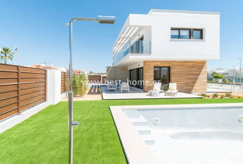Super oferta! Parterowa willa na polu golfowym La Finca. Dostępny dom będzie posiadał 119 m2 powierzchni, który będzie stał na działce o powierzchni 434 m2. Dodatkowo na ogrodzonym terenie znajdziemy prywatny ogród z tarasem o powierzchni 46 m2 i solarium o powierzchni ok 61 m2. Nowoczesna willa z zachowanymi najnowszych technologi budownictwa posiadać będzie jasny salon z jadalnią, gdzie na podwójnej wysokości sufit daje uczucie przestrzeni i wpuszcza mnóstwo naturalnego światła, dużą otwartą do salonu kuchnię, która sprzęt AGD wraz z szafki bedzie miała ukryte i zasłanięte meblościaną. W tej nieruchomości odnajdziemy trzy sypialnie z wbudowanymi szafami oraz dwie łazienki. Willa będzie miała zamontowaną pre-instalację klimatyzacji ciepło/zimno i pełny wyposażony system alarmowy z kamerą zewnętrzna i wewnętrzną. Dom bedzie posiadał duży narożny ogród z basenem o wymiarach 8x3m oraz system ciepłej wody zasilany aerotermią i dostęp do prywatnego parkingu.