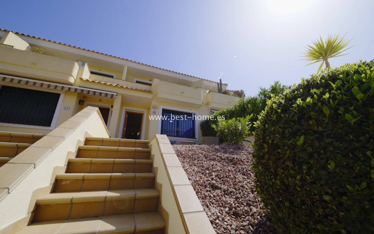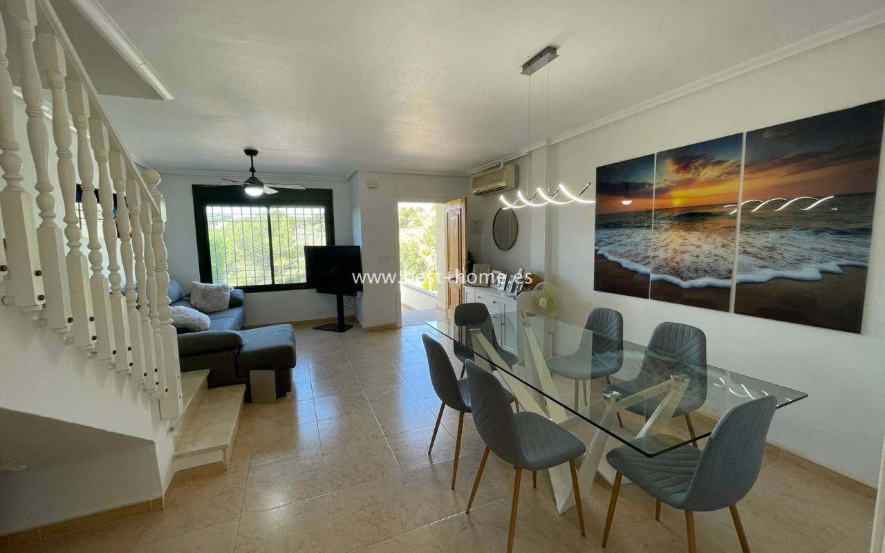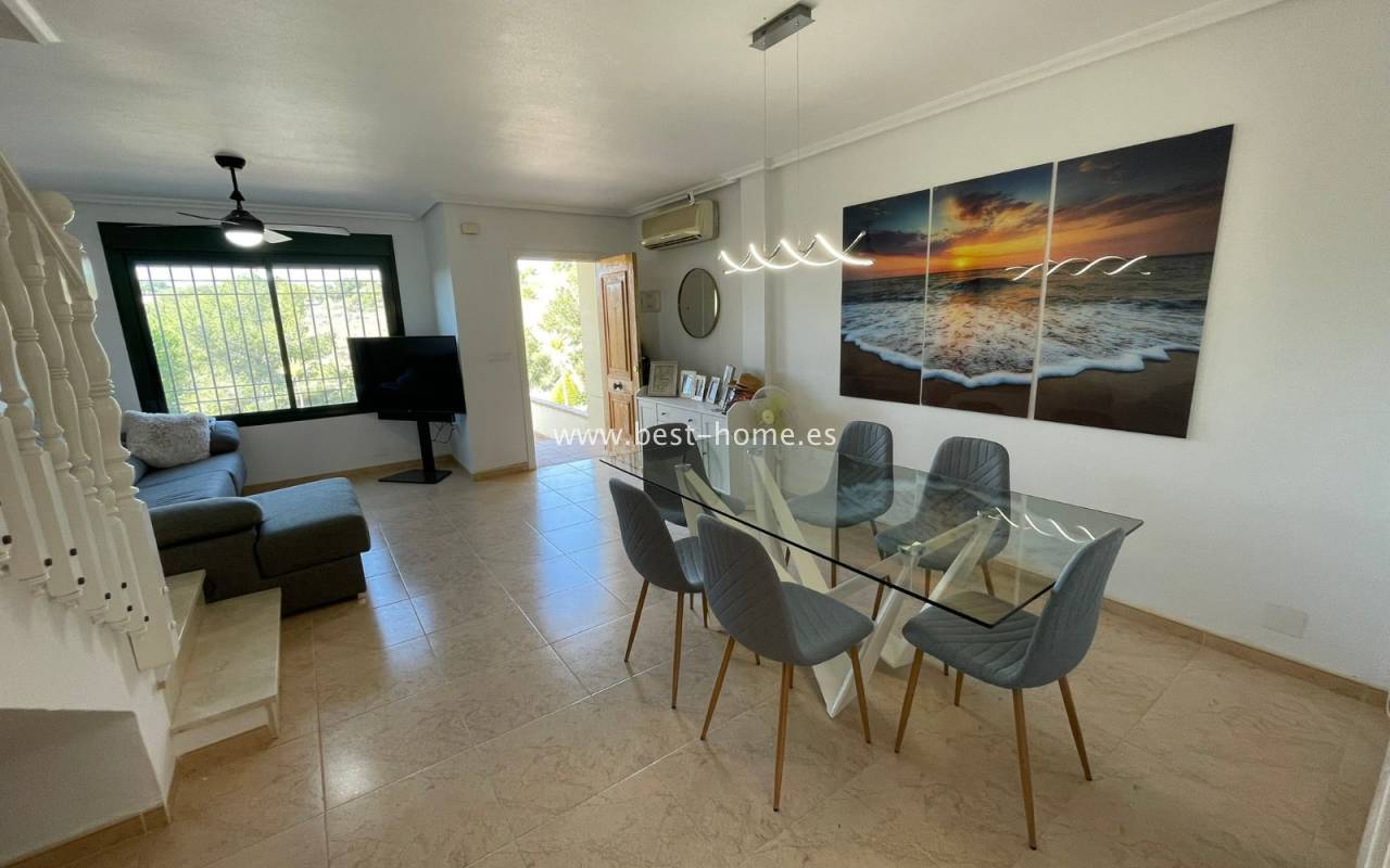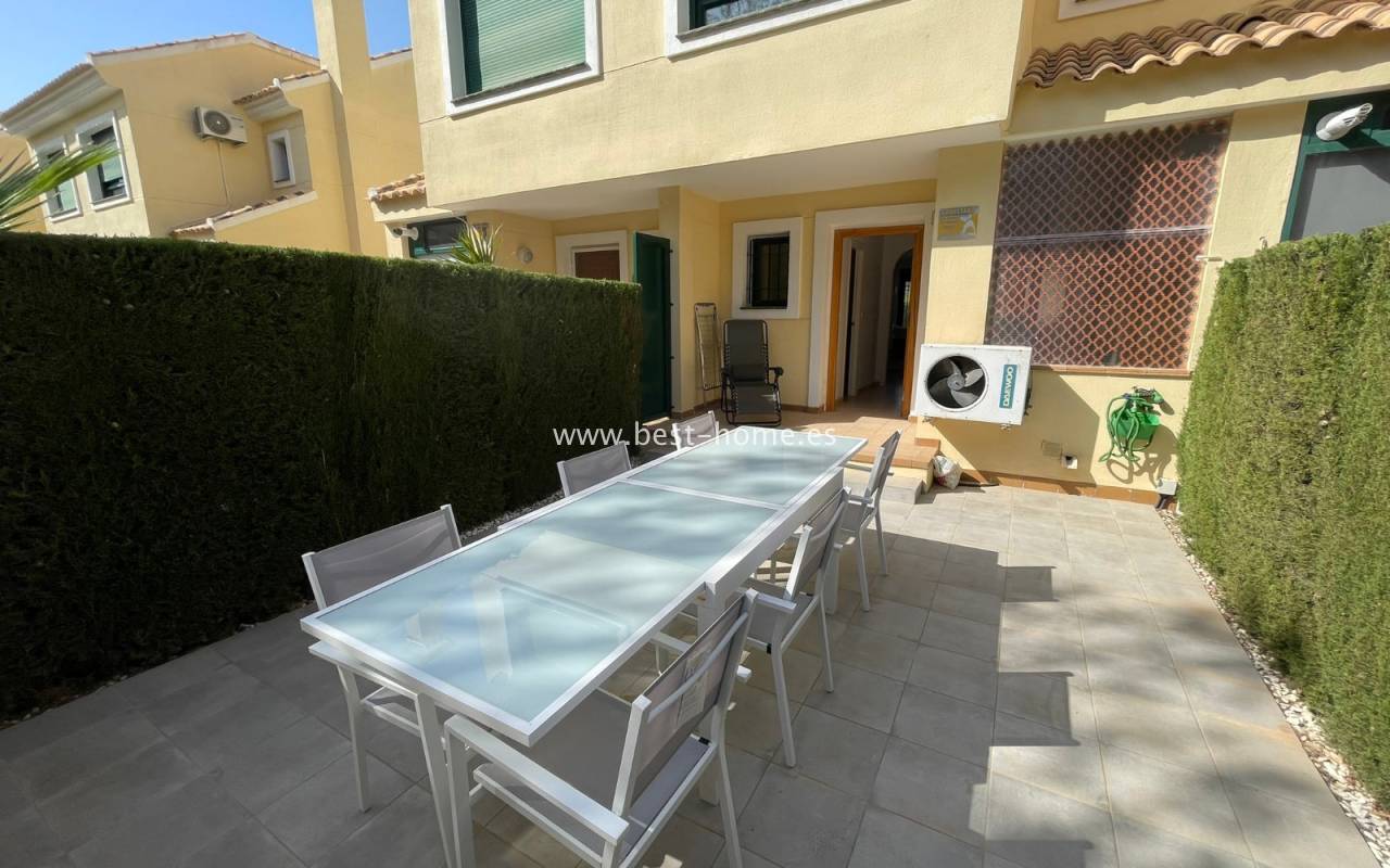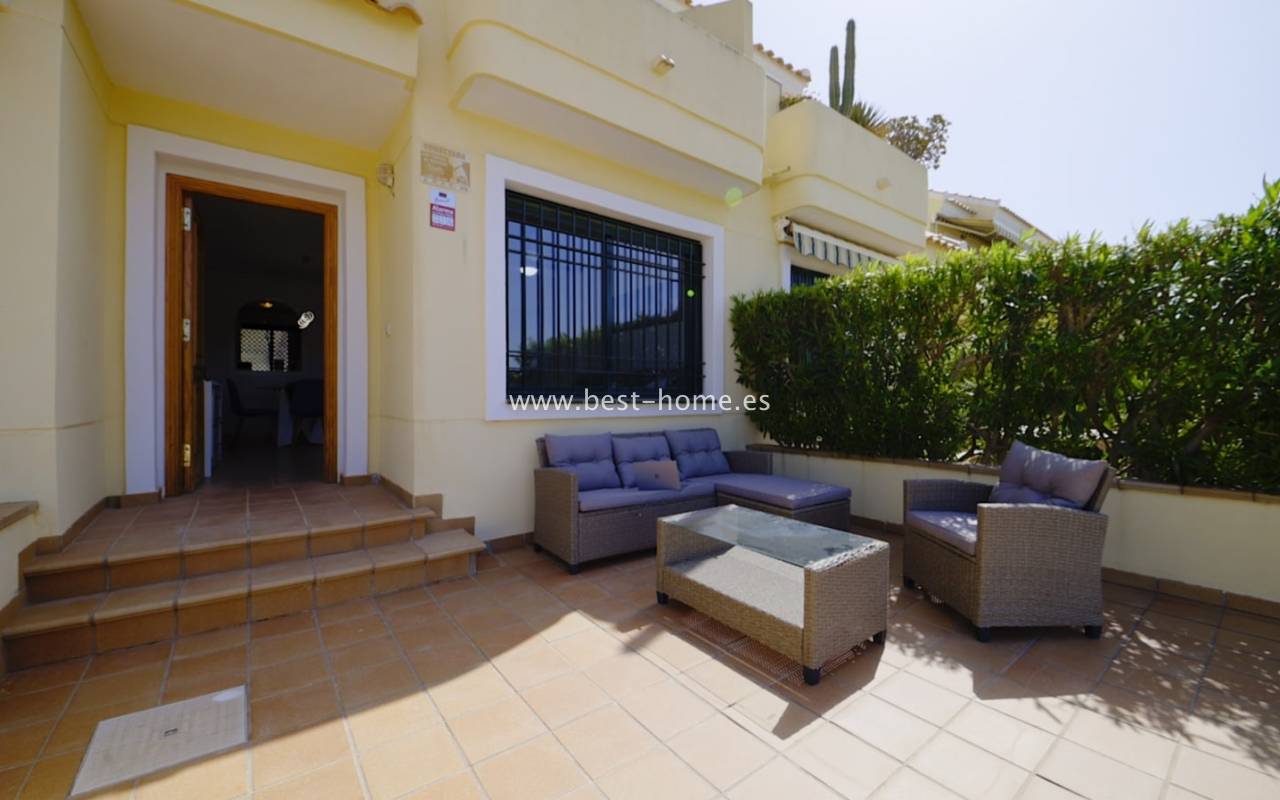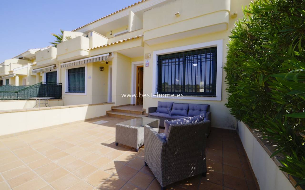 Fantastyczny dom szeregowy położony na jednej z najbardziej prestiżowych urbanizacji na Orihuela Costa – Campoamor Golf. Nieruchomość jest zwrócony na południowy zachód i oferuje otwarty widok na zielony teren Rambla de la Glea, znajdujący się naprzeciwko. Wejście do posesji prowadzi przez uroczy ogródek, a przestronny, podniesiony taras frontowy nasłoneczniony przez cały dzień zapewnia idealne warunki do wypoczynku, posiłków na świeżym powietrzu i spotkań z przyjaciółmi w promieniach hiszpańskiego słońca. Wewnątrz znajdują się dwie przestronne sypialnie i dwie pełne łazienki (jedna zlokalizowana na parterze). Przez taras zewnętrzny wejdziemy na duży, jasny salon połączony z jadalnią, dodatkowo znajdziemy pełną wyposażoną kuchnię wyposażoną w sprzęt AGD i przylega do niej pomieszczenie gospodarcze z pralką i bojlerem. Korytarz oddzielą kuchnię od łazienki na parterze (z prysznicem typu walk-in, toaletą i umywalką z szafką) oraz prowadzi na tylny ogród. Duży stół dla sześciu osób, klimatyczne oświetlenie i kameralna atmosfera sprawiają, że to doskonałe miejsce na wieczorne chwile przy kieliszku hiszpańskiego Rioja. Na piętrze znajdują się dwie duże sypialnie, obie z przestronnymi szafami w zabudowie na całej wysokości ściany. Główna łazienka oferuje wannę z prysznicem, bidet, toaletę oraz umywalkę z szafką. Sypialnia od strony ogrodu wychodzi na tylną część posesji, natomiast ta z przodu ma wyjście na prywatny taras przez duże przeszklone drzwi balkonowe – to idealne miejsce na poranną kawę z widokiem na Rambla. Z tego tarasu prowadzą schody na prywatne solarium na dachu, gdzie można ustawić leżaki i cieszyć się słońcem przez cały dzień. Nieruchomość jest sprzedawana w pełni umeblowana, a przed budynkiem znajduje się wiele miejsc parkingowych. Do dyspozycji mieszkańców jest kilka basenów wspólnych, otoczonych zadbanymi terenami zielonymi. Plaże Campoamor i Cabo Roig oddalone są zaledwie o 7 minut jazdy samochodem. W najbliższej okolicy znajduje się wiele punktów rozrywki, w tym centrum handlowo-rozrywkowe La Fuente (kilka minut spacerem), słynne Villamartin Plaza i La Zenia Boulevard oraz liczne bary i restauracje.
