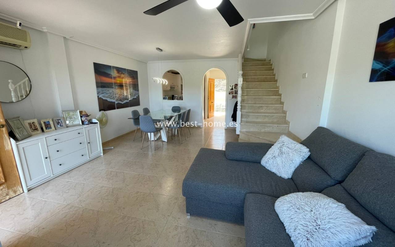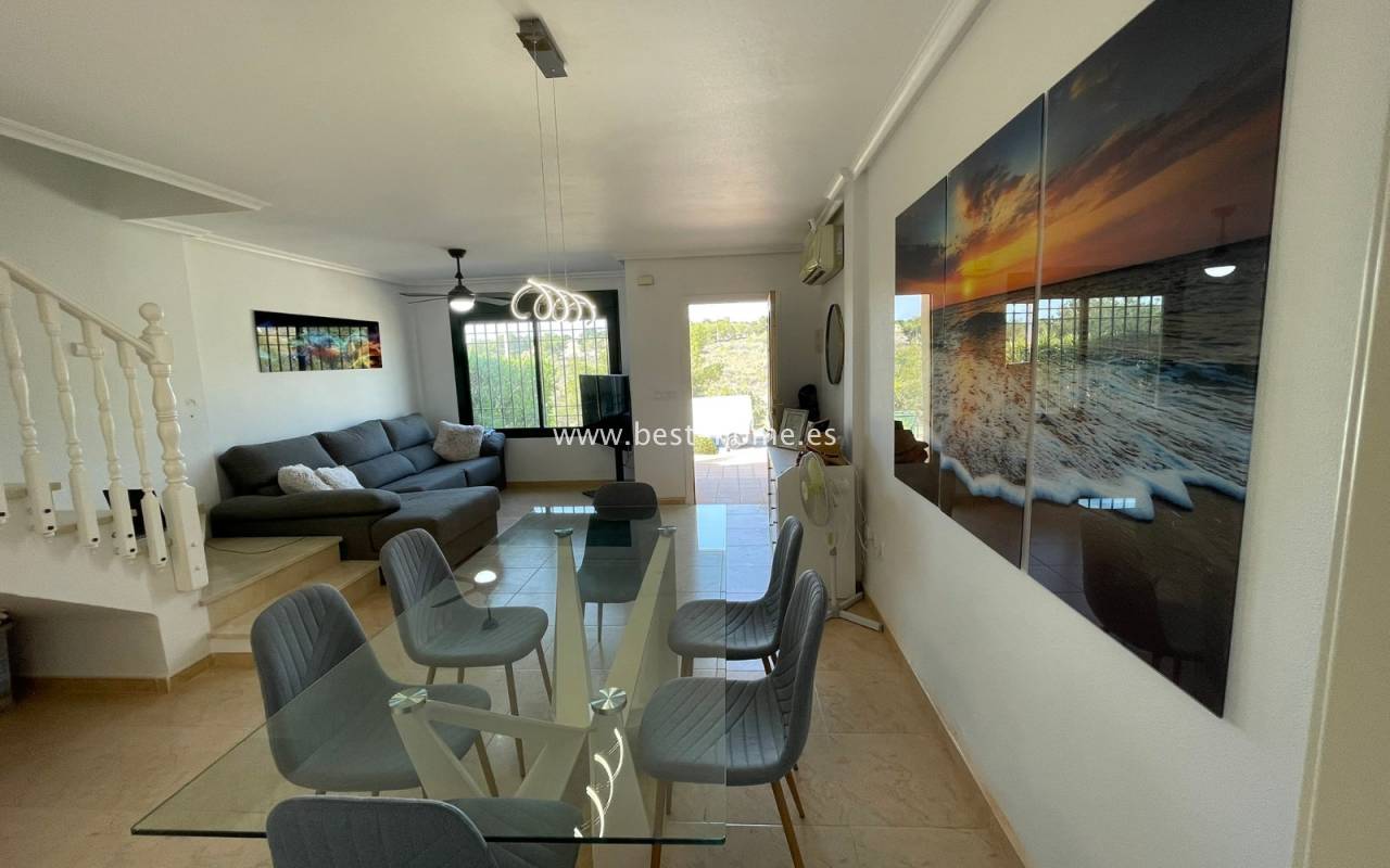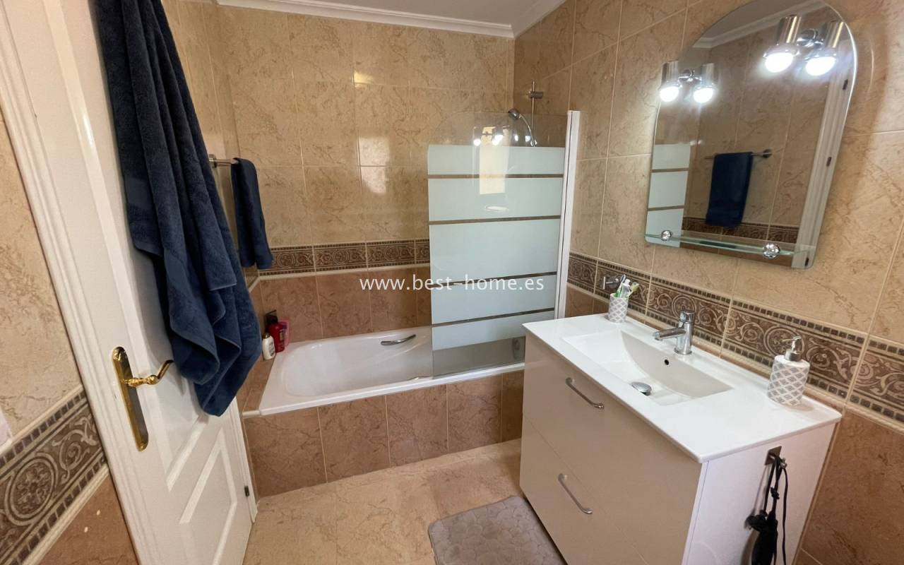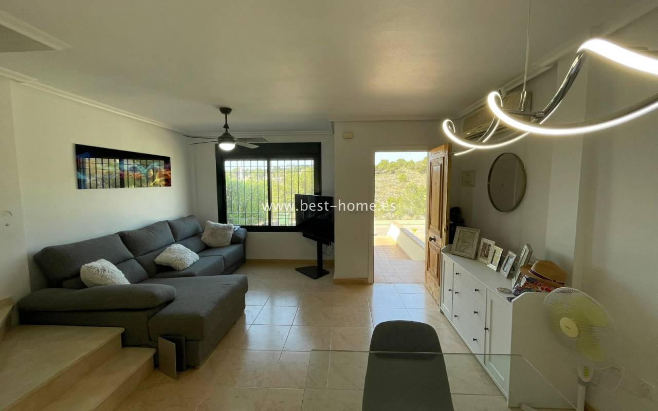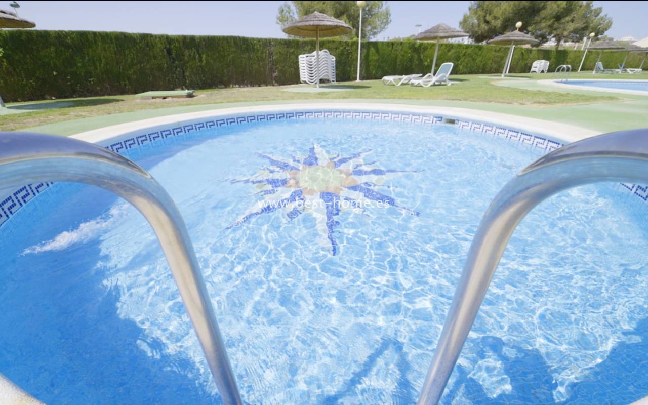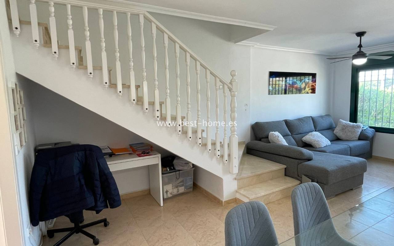 Fantastyczny dom szeregowy położony na jednej z najbardziej prestiżowych urbanizacji na Orihuela Costa – Campoamor Golf. Nieruchomość jest zwrócony na południowy zachód i oferuje otwarty widok na zielony teren Rambla de la Glea, znajdujący się naprzeciwko. Wejście do posesji prowadzi przez uroczy ogródek, a przestronny, podniesiony taras frontowy nasłoneczniony przez cały dzień zapewnia idealne warunki do wypoczynku, posiłków na świeżym powietrzu i spotkań z przyjaciółmi w promieniach hiszpańskiego słońca. Wewnątrz znajdują się dwie przestronne sypialnie i dwie pełne łazienki (jedna zlokalizowana na parterze). Przez taras zewnętrzny wejdziemy na duży, jasny salon połączony z jadalnią, dodatkowo znajdziemy pełną wyposażoną kuchnię wyposażoną w sprzęt AGD i przylega do niej pomieszczenie gospodarcze z pralką i bojlerem. Korytarz oddzielą kuchnię od łazienki na parterze (z prysznicem typu walk-in, toaletą i umywalką z szafką) oraz prowadzi na tylny ogród. Duży stół dla sześciu osób, klimatyczne oświetlenie i kameralna atmosfera sprawiają, że to doskonałe miejsce na wieczorne chwile przy kieliszku hiszpańskiego Rioja. Na piętrze znajdują się dwie duże sypialnie, obie z przestronnymi szafami w zabudowie na całej wysokości ściany. Główna łazienka oferuje wannę z prysznicem, bidet, toaletę oraz umywalkę z szafką. Sypialnia od strony ogrodu wychodzi na tylną część posesji, natomiast ta z przodu ma wyjście na prywatny taras przez duże przeszklone drzwi balkonowe – to idealne miejsce na poranną kawę z widokiem na Rambla. Z tego tarasu prowadzą schody na prywatne solarium na dachu, gdzie można ustawić leżaki i cieszyć się słońcem przez cały dzień. Nieruchomość jest sprzedawana w pełni umeblowana, a przed budynkiem znajduje się wiele miejsc parkingowych. Do dyspozycji mieszkańców jest kilka basenów wspólnych, otoczonych zadbanymi terenami zielonymi. Plaże Campoamor i Cabo Roig oddalone są zaledwie o 7 minut jazdy samochodem. W najbliższej okolicy znajduje się wiele punktów rozrywki, w tym centrum handlowo-rozrywkowe La Fuente (kilka minut spacerem), słynne Villamartin Plaza i La Zenia Boulevard oraz liczne bary i restauracje.