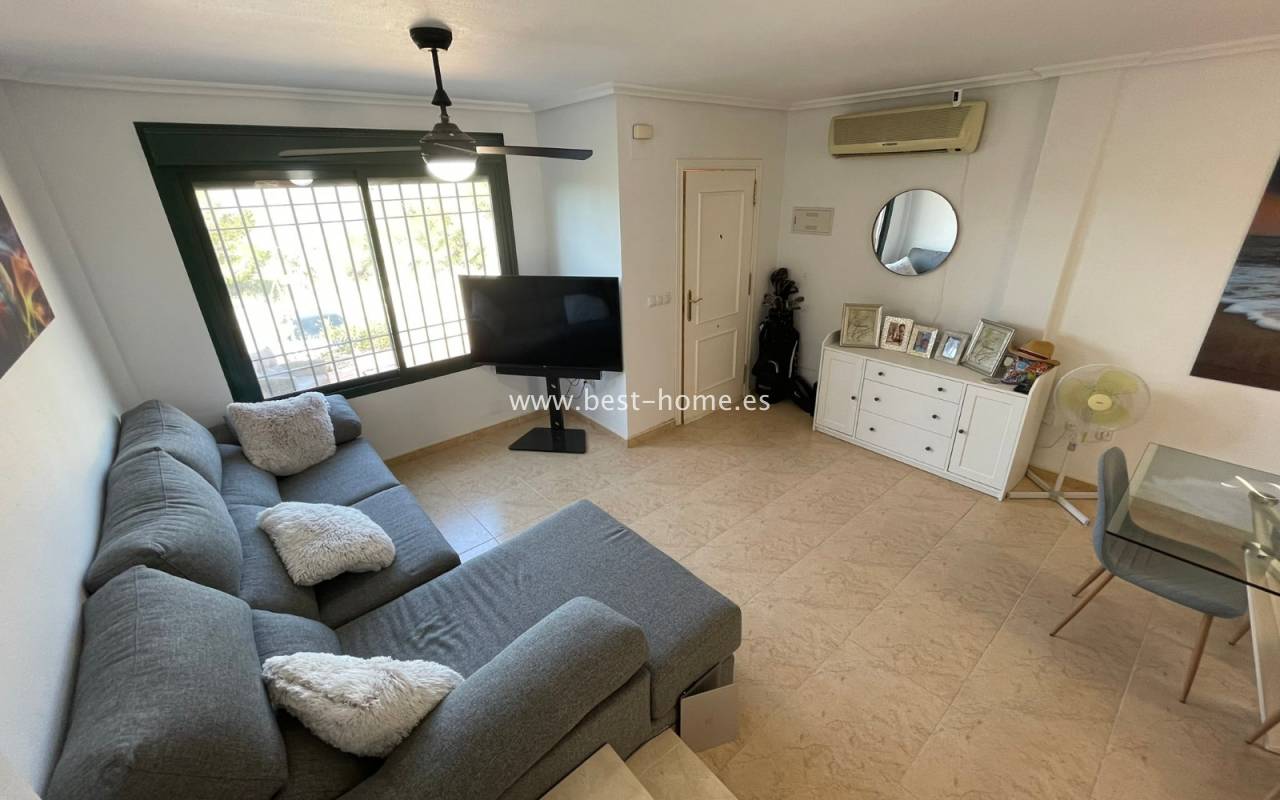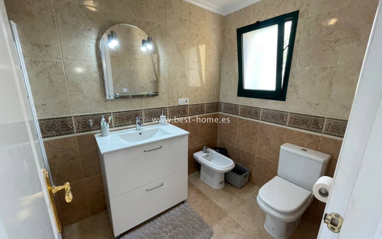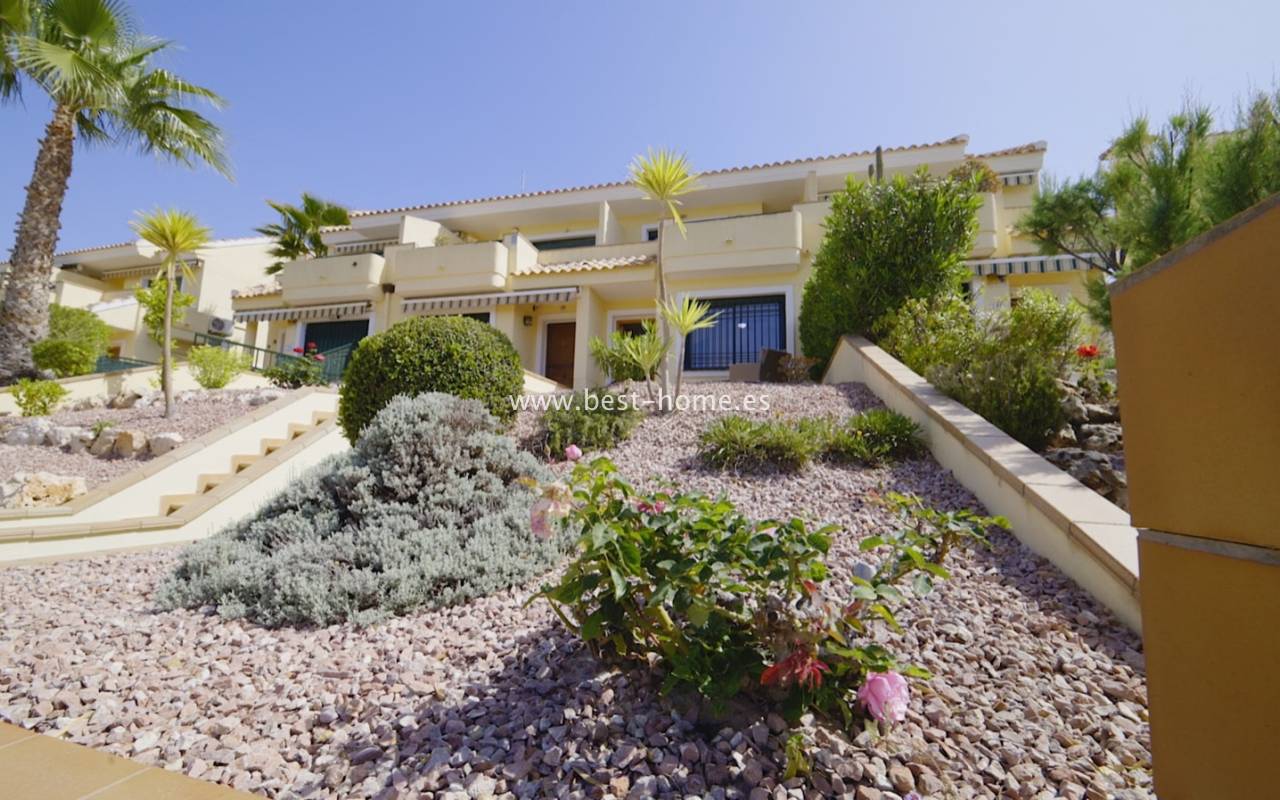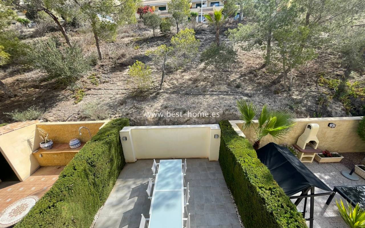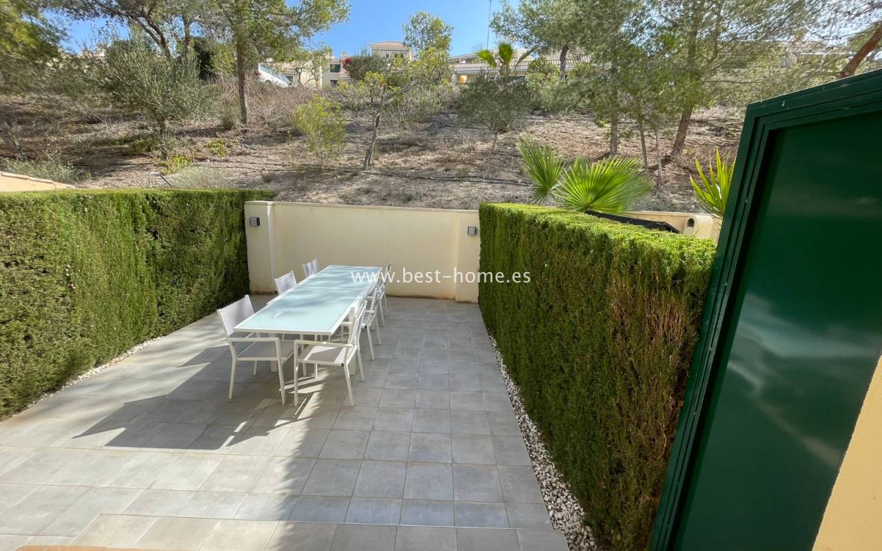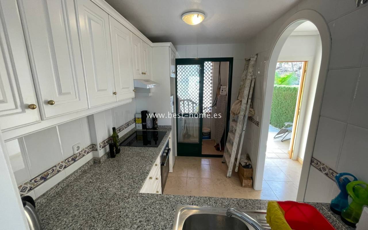 Fantastyczny dom szeregowy położony na jednej z najbardziej prestiżowych urbanizacji na Orihuela Costa – Campoamor Golf. Nieruchomość jest zwrócony na południowy zachód i oferuje otwarty widok na zielony teren Rambla de la Glea, znajdujący się naprzeciwko. Wejście do posesji prowadzi przez uroczy ogródek, a przestronny, podniesiony taras frontowy nasłoneczniony przez cały dzień zapewnia idealne warunki do wypoczynku, posiłków na świeżym powietrzu i spotkań z przyjaciółmi w promieniach hiszpańskiego słońca. Wewnątrz znajdują się dwie przestronne sypialnie i dwie pełne łazienki (jedna zlokalizowana na parterze). Przez taras zewnętrzny wejdziemy na duży, jasny salon połączony z jadalnią, dodatkowo znajdziemy pełną wyposażoną kuchnię wyposażoną w sprzęt AGD i przylega do niej pomieszczenie gospodarcze z pralką i bojlerem. Korytarz oddzielą kuchnię od łazienki na parterze (z prysznicem typu walk-in, toaletą i umywalką z szafką) oraz prowadzi na tylny ogród. Duży stół dla sześciu osób, klimatyczne oświetlenie i kameralna atmosfera sprawiają, że to doskonałe miejsce na wieczorne chwile przy kieliszku hiszpańskiego Rioja. Na piętrze znajdują się dwie duże sypialnie, obie z przestronnymi szafami w zabudowie na całej wysokości ściany. Główna łazienka oferuje wannę z prysznicem, bidet, toaletę oraz umywalkę z szafką. Sypialnia od strony ogrodu wychodzi na tylną część posesji, natomiast ta z przodu ma wyjście na prywatny taras przez duże przeszklone drzwi balkonowe – to idealne miejsce na poranną kawę z widokiem na Rambla. Z tego tarasu prowadzą schody na prywatne solarium na dachu, gdzie można ustawić leżaki i cieszyć się słońcem przez cały dzień. Nieruchomość jest sprzedawana w pełni umeblowana, a przed budynkiem znajduje się wiele miejsc parkingowych. Do dyspozycji mieszkańców jest kilka basenów wspólnych, otoczonych zadbanymi terenami zielonymi. Plaże Campoamor i Cabo Roig oddalone są zaledwie o 7 minut jazdy samochodem. W najbliższej okolicy znajduje się wiele punktów rozrywki, w tym centrum handlowo-rozrywkowe La Fuente (kilka minut spacerem), słynne Villamartin Plaza i La Zenia Boulevard oraz liczne bary i restauracje.