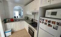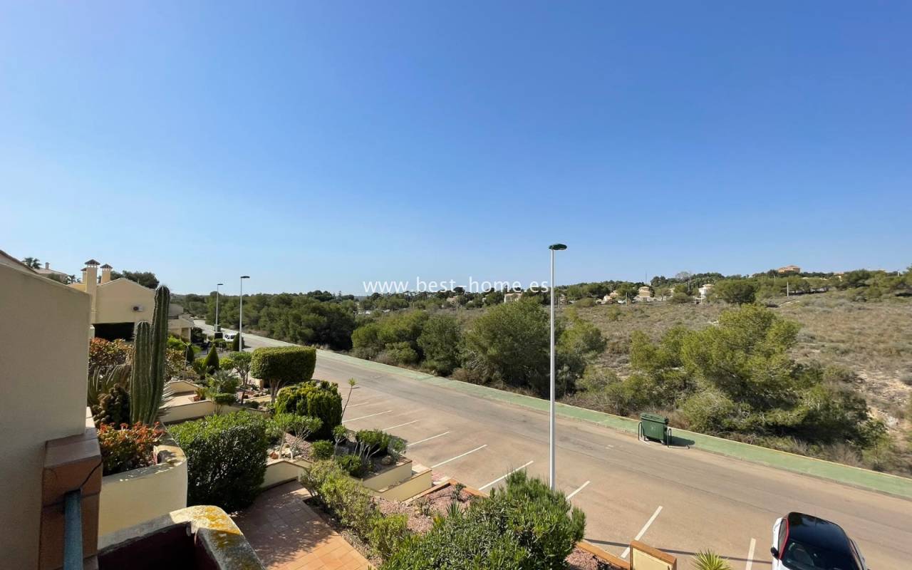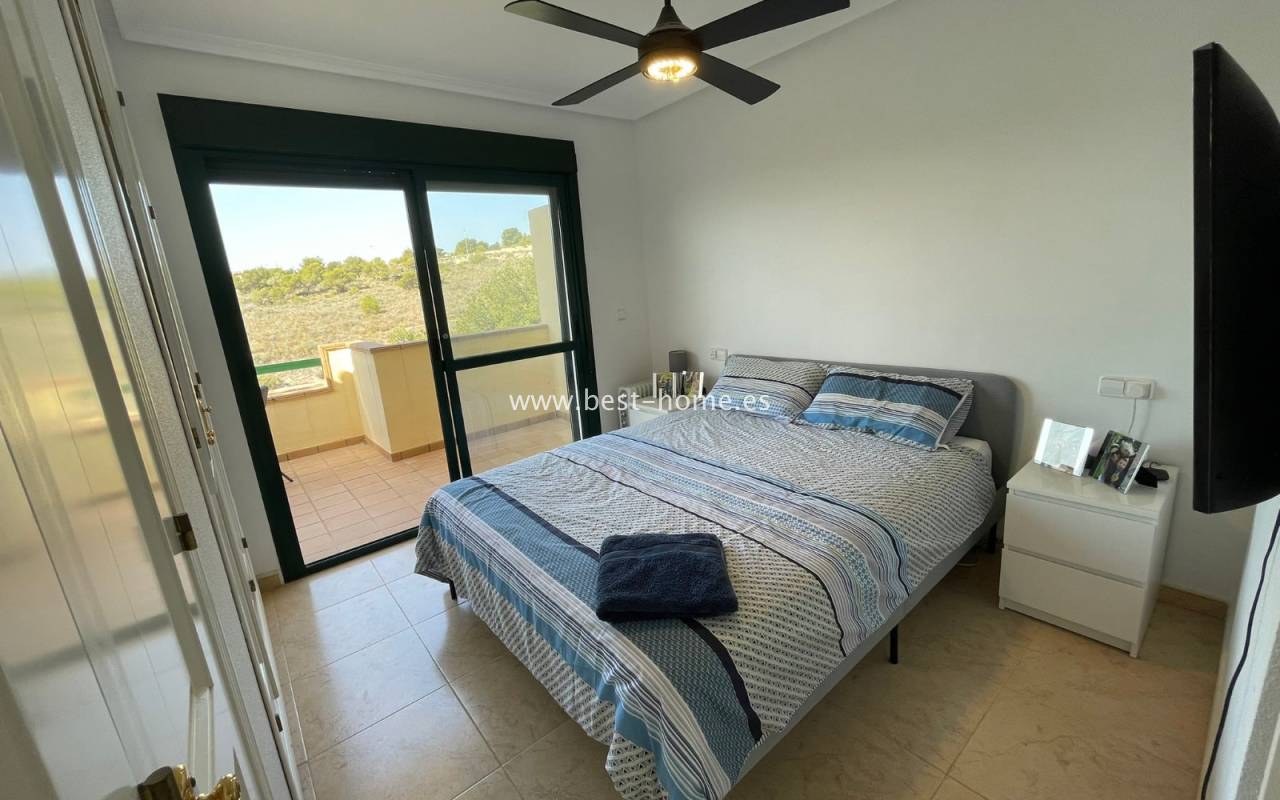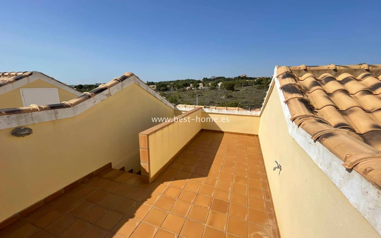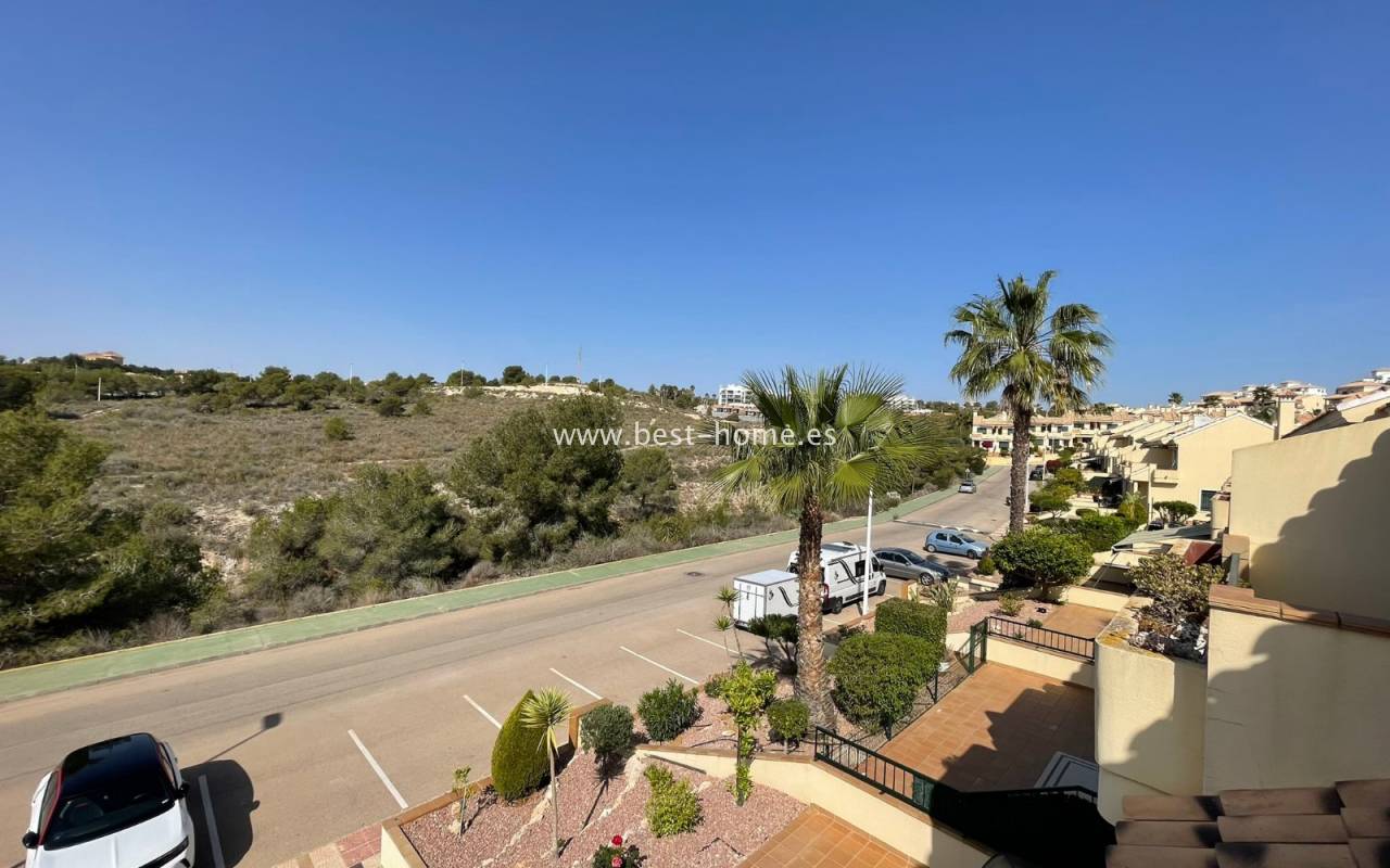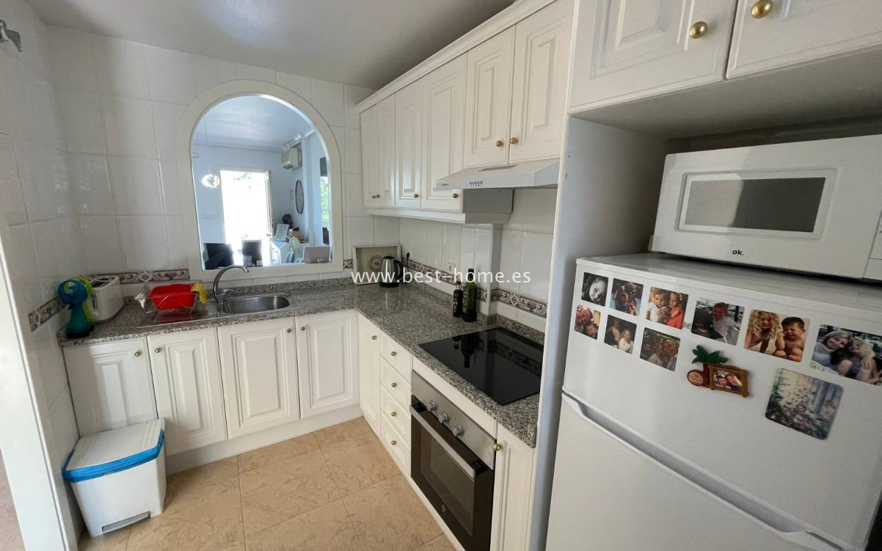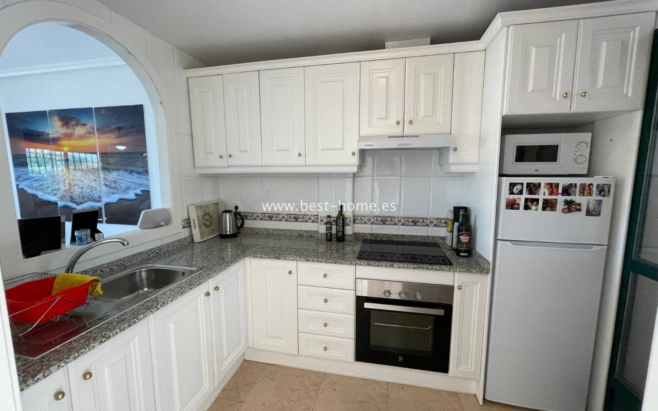 Fantastyczny dom szeregowy położony na jednej z najbardziej prestiżowych urbanizacji na Orihuela Costa – Campoamor Golf. Nieruchomość jest zwrócony na południowy zachód i oferuje otwarty widok na zielony teren Rambla de la Glea, znajdujący się naprzeciwko. Wejście do posesji prowadzi przez uroczy ogródek, a przestronny, podniesiony taras frontowy nasłoneczniony przez cały dzień zapewnia idealne warunki do wypoczynku, posiłków na świeżym powietrzu i spotkań z przyjaciółmi w promieniach hiszpańskiego słońca. Wewnątrz znajdują się dwie przestronne sypialnie i dwie pełne łazienki (jedna zlokalizowana na parterze). Przez taras zewnętrzny wejdziemy na duży, jasny salon połączony z jadalnią, dodatkowo znajdziemy pełną wyposażoną kuchnię wyposażoną w sprzęt AGD i przylega do niej pomieszczenie gospodarcze z pralką i bojlerem. Korytarz oddzielą kuchnię od łazienki na parterze (z prysznicem typu walk-in, toaletą i umywalką z szafką) oraz prowadzi na tylny ogród. Duży stół dla sześciu osób, klimatyczne oświetlenie i kameralna atmosfera sprawiają, że to doskonałe miejsce na wieczorne chwile przy kieliszku hiszpańskiego Rioja. Na piętrze znajdują się dwie duże sypialnie, obie z przestronnymi szafami w zabudowie na całej wysokości ściany. Główna łazienka oferuje wannę z prysznicem, bidet, toaletę oraz umywalkę z szafką. Sypialnia od strony ogrodu wychodzi na tylną część posesji, natomiast ta z przodu ma wyjście na prywatny taras przez duże przeszklone drzwi balkonowe – to idealne miejsce na poranną kawę z widokiem na Rambla. Z tego tarasu prowadzą schody na prywatne solarium na dachu, gdzie można ustawić leżaki i cieszyć się słońcem przez cały dzień. Nieruchomość jest sprzedawana w pełni umeblowana, a przed budynkiem znajduje się wiele miejsc parkingowych. Do dyspozycji mieszkańców jest kilka basenów wspólnych, otoczonych zadbanymi terenami zielonymi. Plaże Campoamor i Cabo Roig oddalone są zaledwie o 7 minut jazdy samochodem. W najbliższej okolicy znajduje się wiele punktów rozrywki, w tym centrum handlowo-rozrywkowe La Fuente (kilka minut spacerem), słynne Villamartin Plaza i La Zenia Boulevard oraz liczne bary i restauracje.