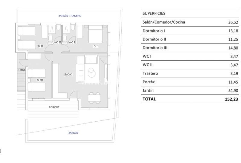 Nowe atrakcyjne osiedle budowane jest w spokojnym, hiszpańskim miasteczku San Miguel de Salinas. Na zamkniętym osiedlu dostępne są przestronne bungalowy na parterze z trzema sypialniami, dwoma łazienkami, umeblowaną połączoną z salonem i jadalnią. Z salonu i głównej sypialni będzie wyjście na taras (11 m2) i do prywatnego ogrodu (54 m2). W cenie zabudowa kuchenna (okap, płyta w cenie), wykończone łazienki i pre-isntalcja klimatyzacji. Dwa baseny na terenie osiedla.