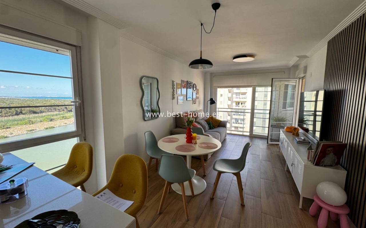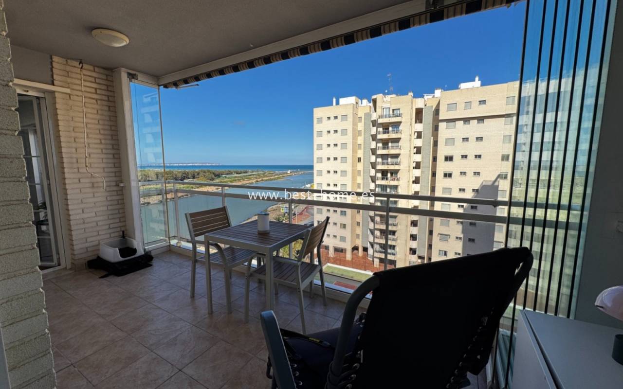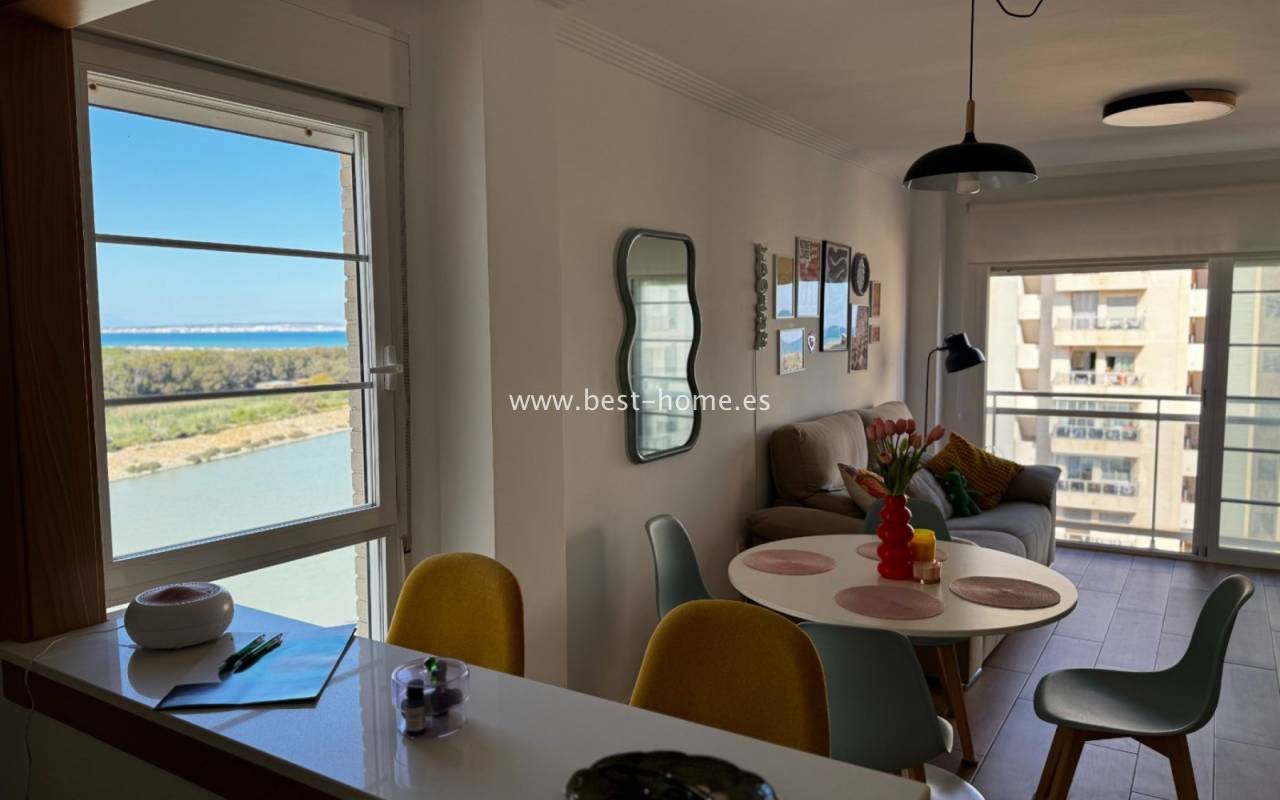 Fantastyczny apartament na 7 pietrze z widokiem na morze i rzekę, z basenem osiedlowym, placem zabaw i miejscem garażowym w miejscowości Guardamar del Segura. Posiada jasny salon z wyjściem na słoneczny taras, z którego rozciąga się piękny widok na morze, las piniowy, rzekę. Dodatkowo w apartamencie znajdziemy dwie dwuosobowe sypialnie, kuchnię w stylu amerykańskim wyposażona w sprzęt AGD, łazienkę. W cenie apartamentu jest miejsce parkingowe w garażu podziemnym. Na terenie osiedla znajuje sie basen i plac zabaw przeznaczony dla mieszkańców. Idealne miejsce dla osób, które szukaja ciszy, spokoju i pięknego hiszpańskiego miasta.