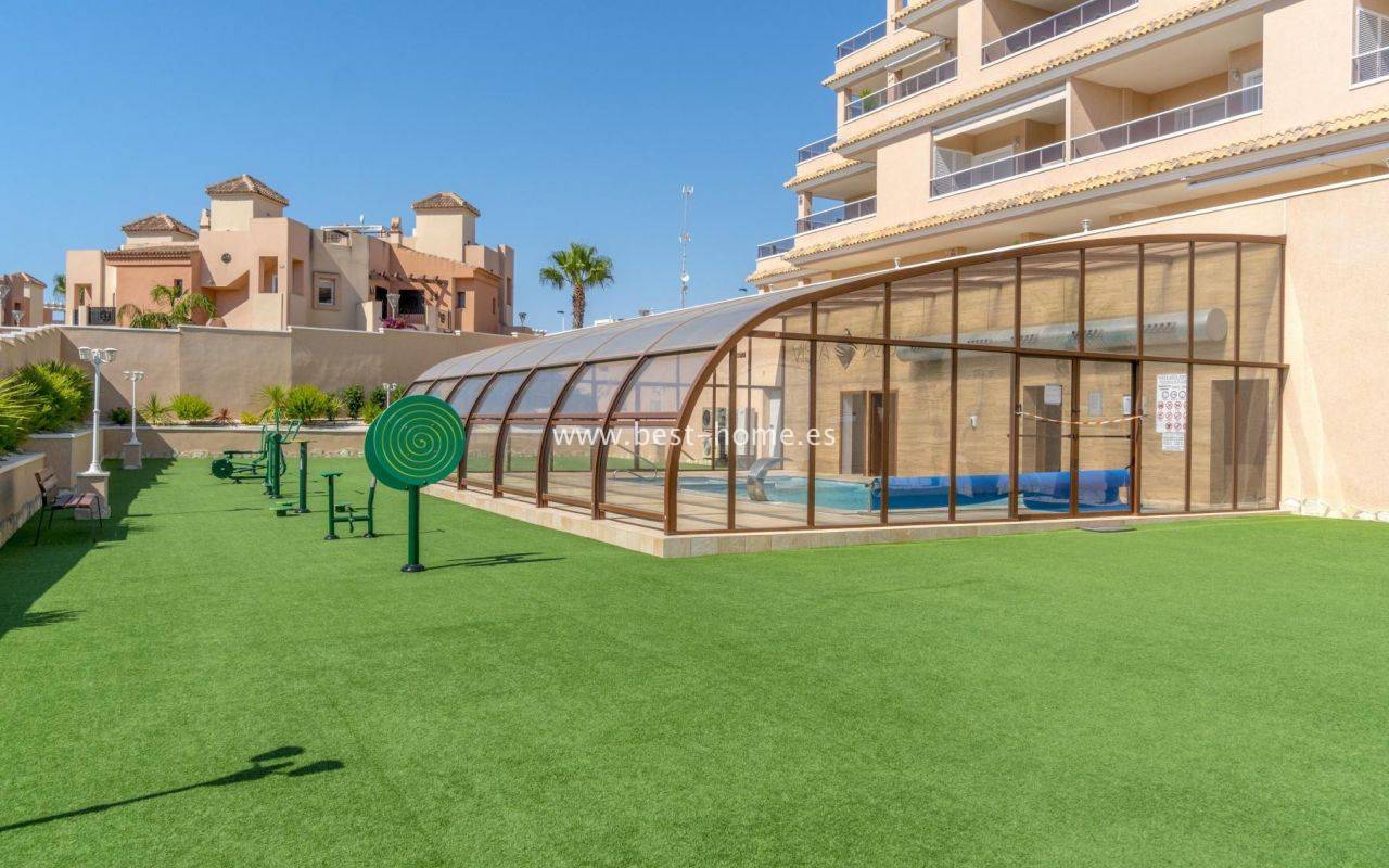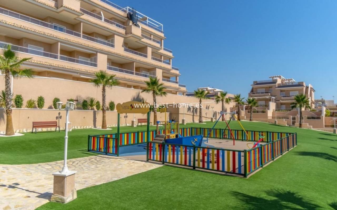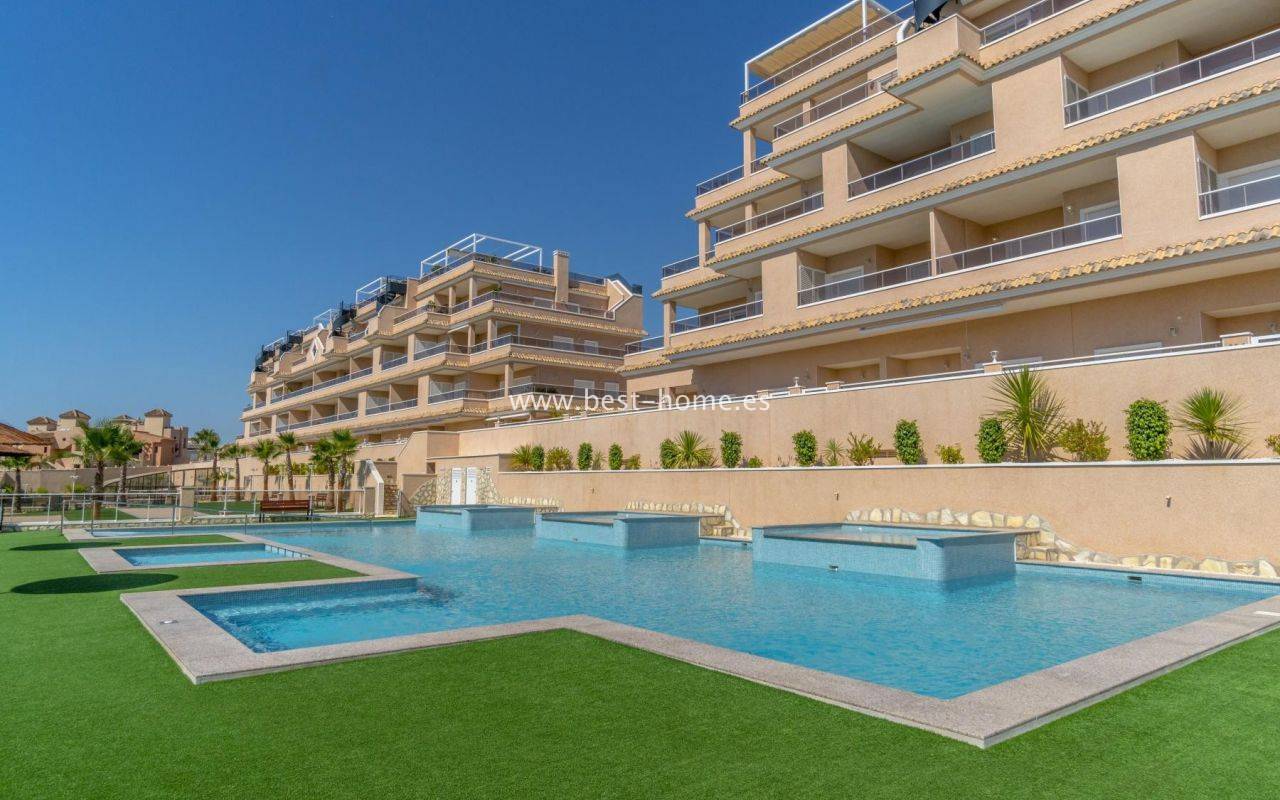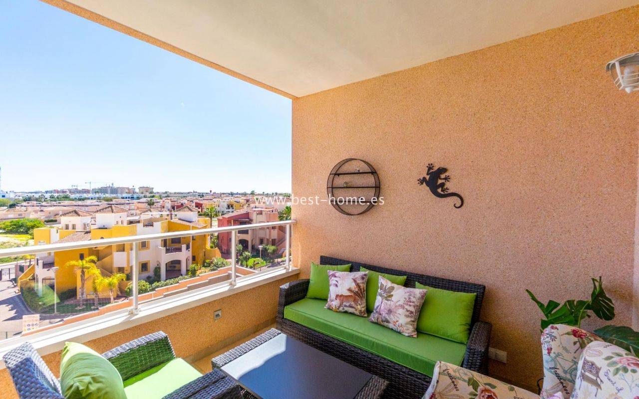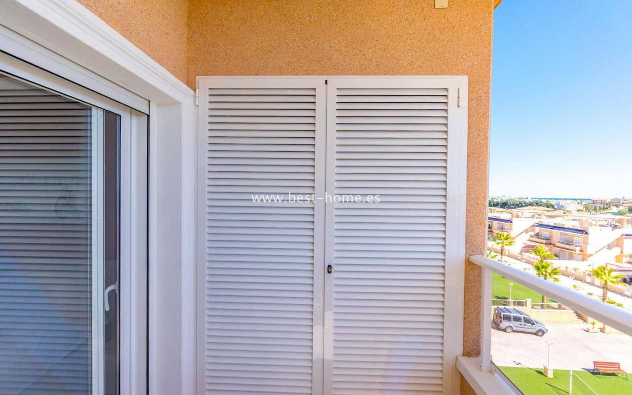 Atrakcyjny apartament położony jest na zamkniętym osiedlu w Punta Prima. Nieruchomość jest na 2 piętrze, składa się z dwóch sypialni, dwóch łazienek, umeblowanej kuchni kuchni połączonej z jadalnią i salonem. Z salonu i głównej sypialni jest wyjście na taras, z którego jest otwarty widok na osiedle i morze. W cenie umeblowanie, sprzęt AGD, centralna klimatyzacja, podgrzewane podłogi w łazienkach oraz miejsce parkingowe. Na terenie osiedla są dwa baseny, w tym jeden z podgrzewaną wodą, sauna, plac zabaw dla dzieci i boisko do gry w bule.