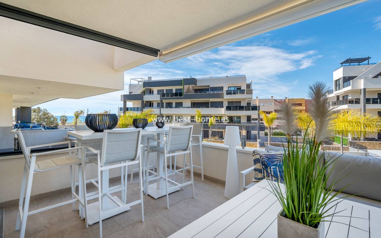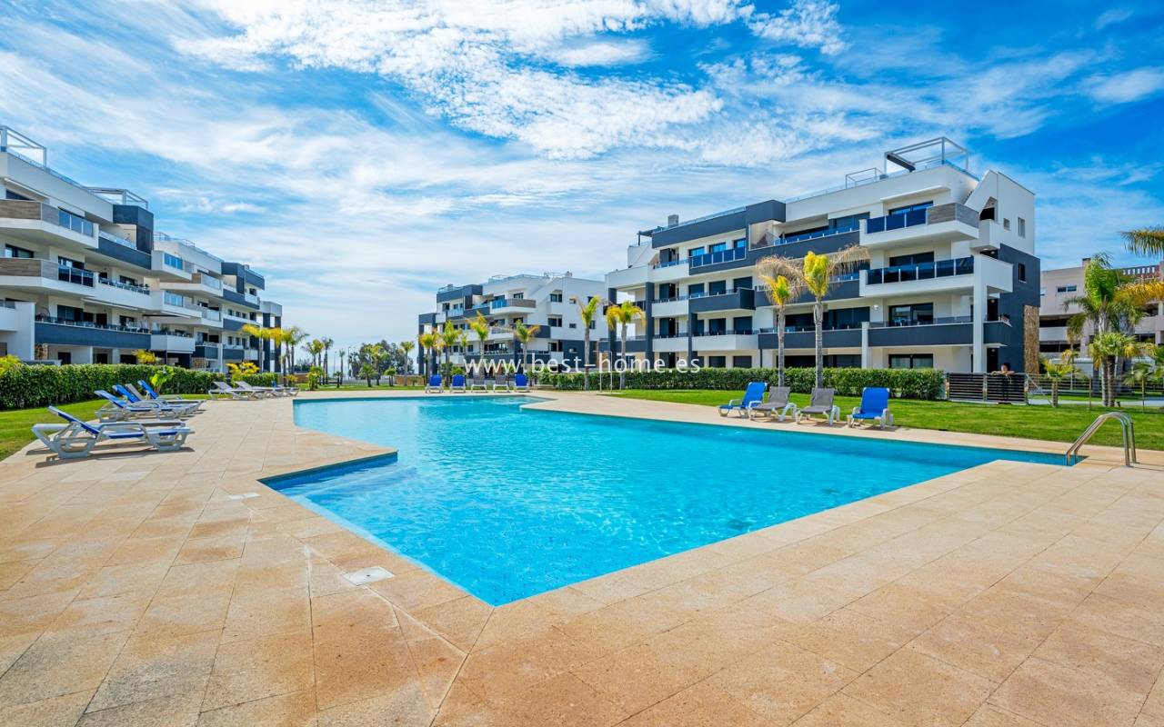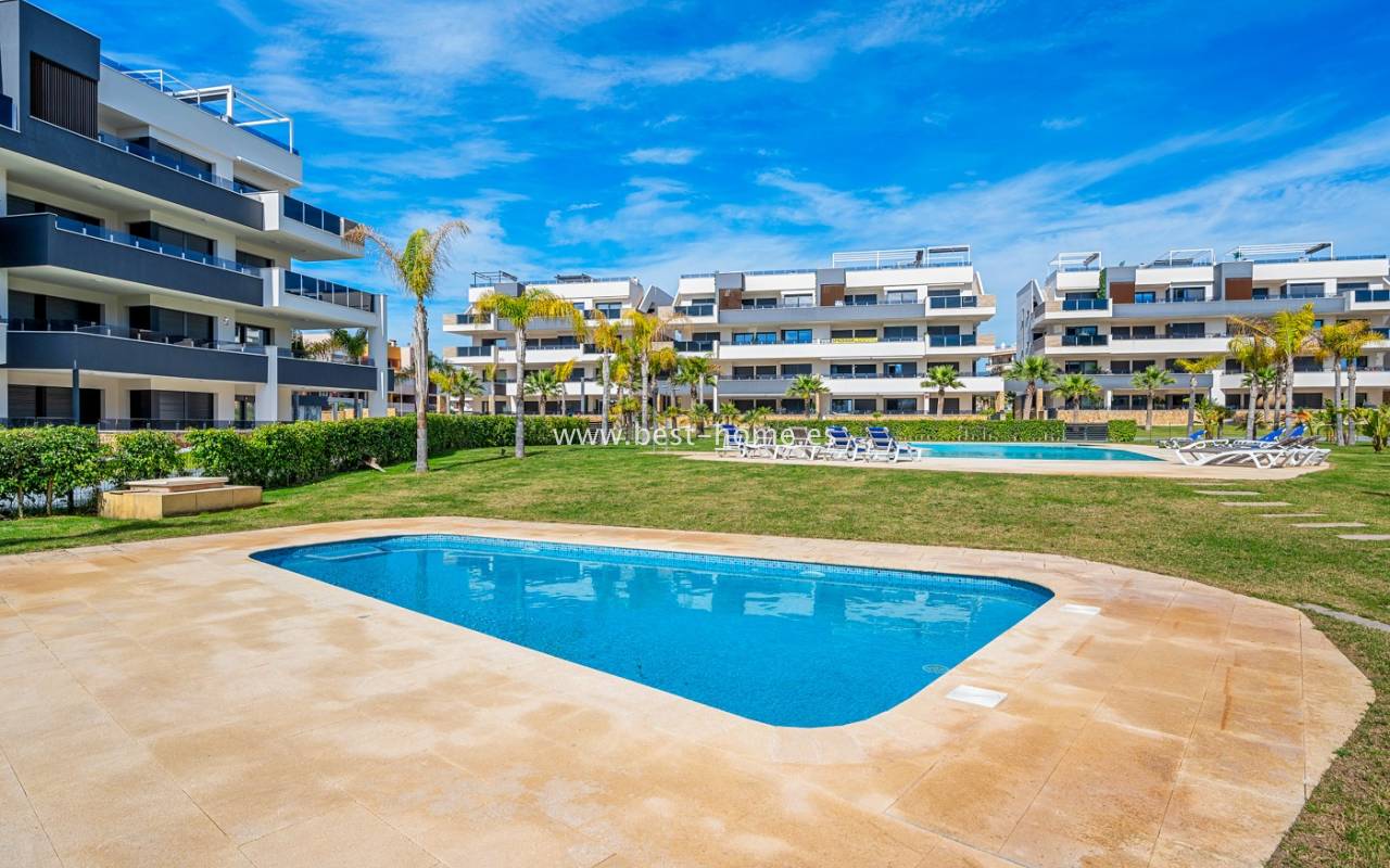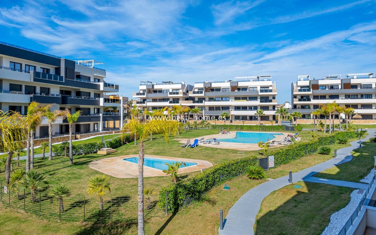 Apartament na 1 piętrze z widokiem na morze na nowo wybudowanym prestiżowym osiedlu w Playa Flamenca, Orihuela Costa. W kompleksie osiedla znajduja sie dwa duże baseny, jacuzzi, sauna, siłownia, plac zabaw dla dzieci, boisko do gry w bule i pięknie zagospodarowane tereny zielone — wszystko zaprojektowane z myślą o komforcie, relaksie i jakości życia. Apartament posiada jasny salon, dwie 2 osobowe sypialanie, dwie łazienki i kuchnie wyposaóżna w sprzet AGD. Mieszkanie jest bardzo nowoczense, przykuwa uwagę. Mieszkanie wyposażone jest w klimatyzacje i sprzedawane wraz z meblami. Dodatkowo w cenie znajdziemy prywatne miejsce parkingowe i pomieszczenie gospodarcze. Apartament znajduje się zaledwie 10 minut od nagradzanych plaż Orihuela Costa, popularnego centrum handlowego La Zenia Boulevard i prestiżowego pola golfowego Villamartin.