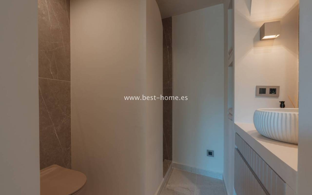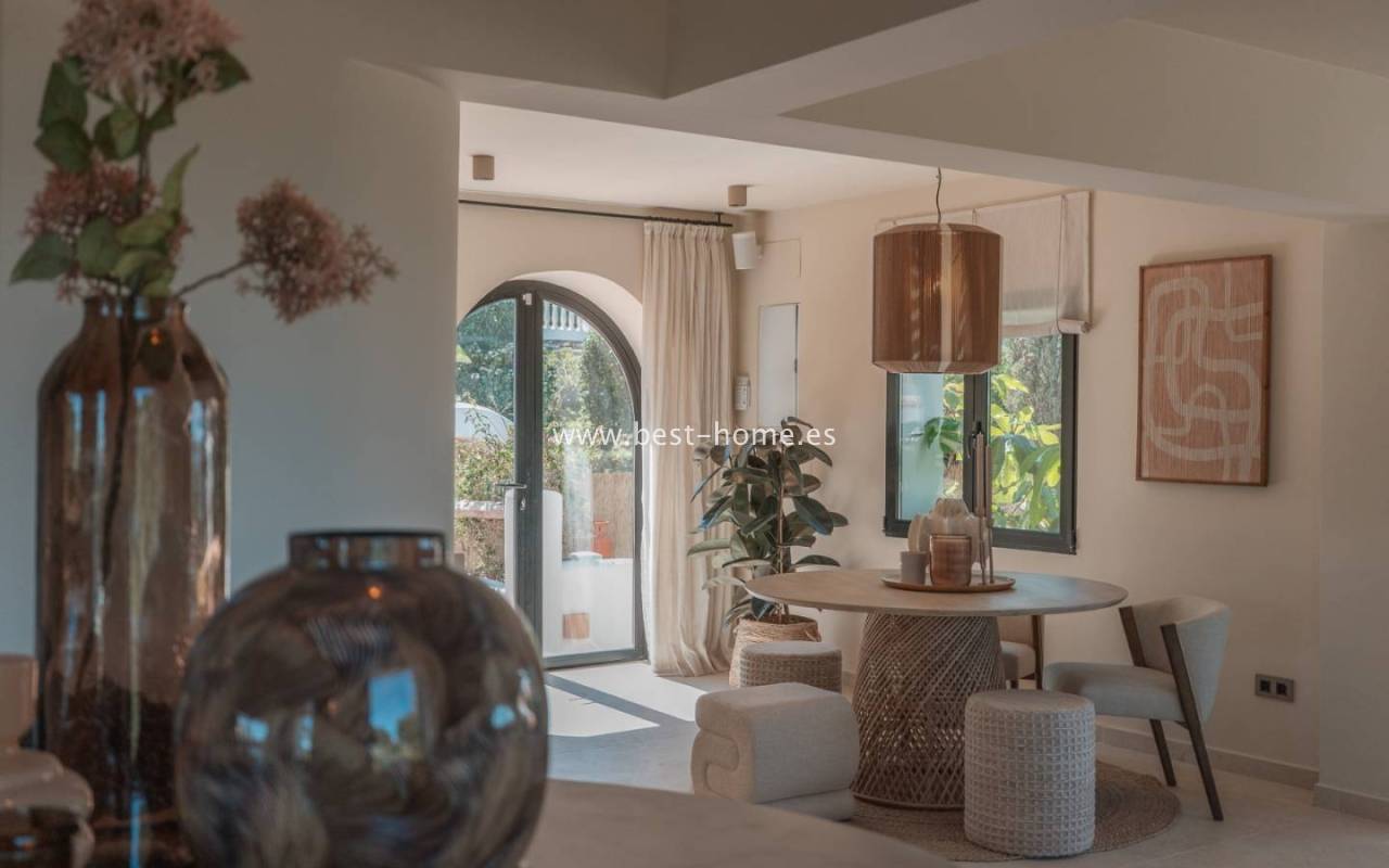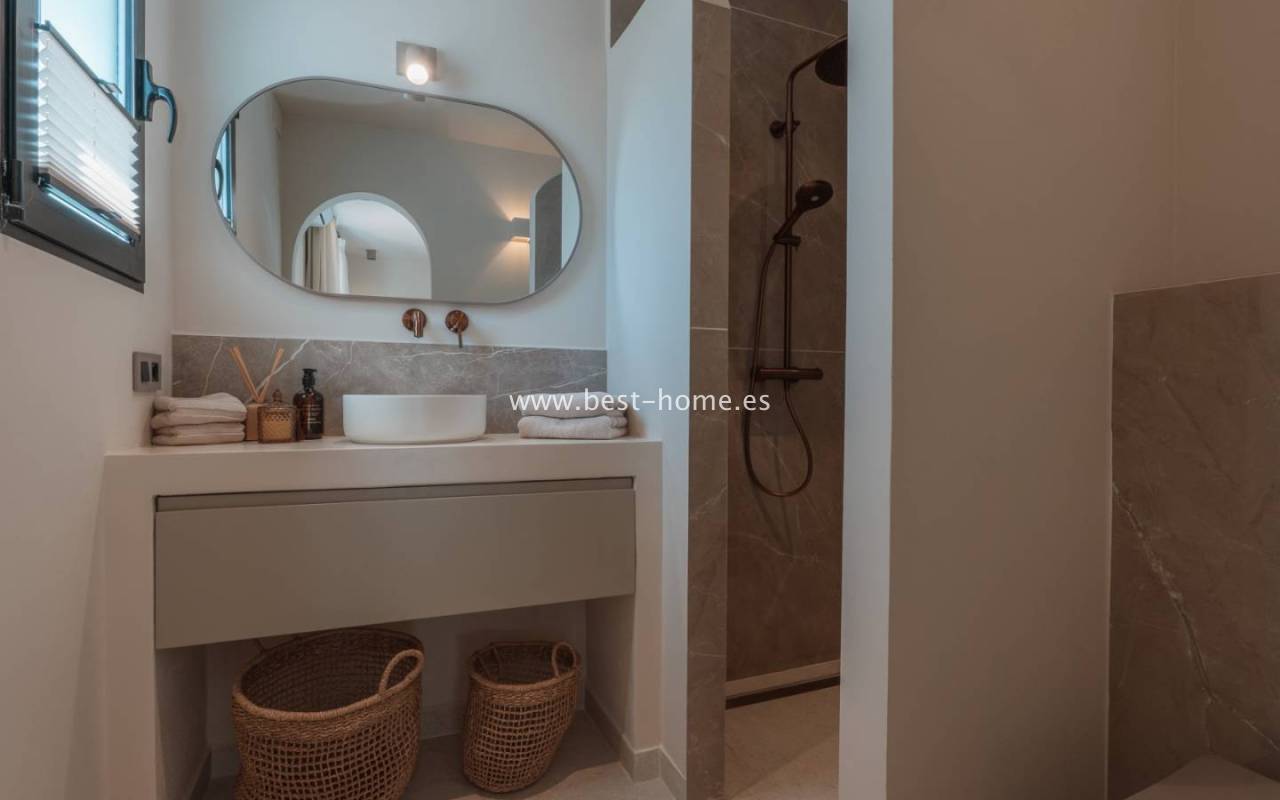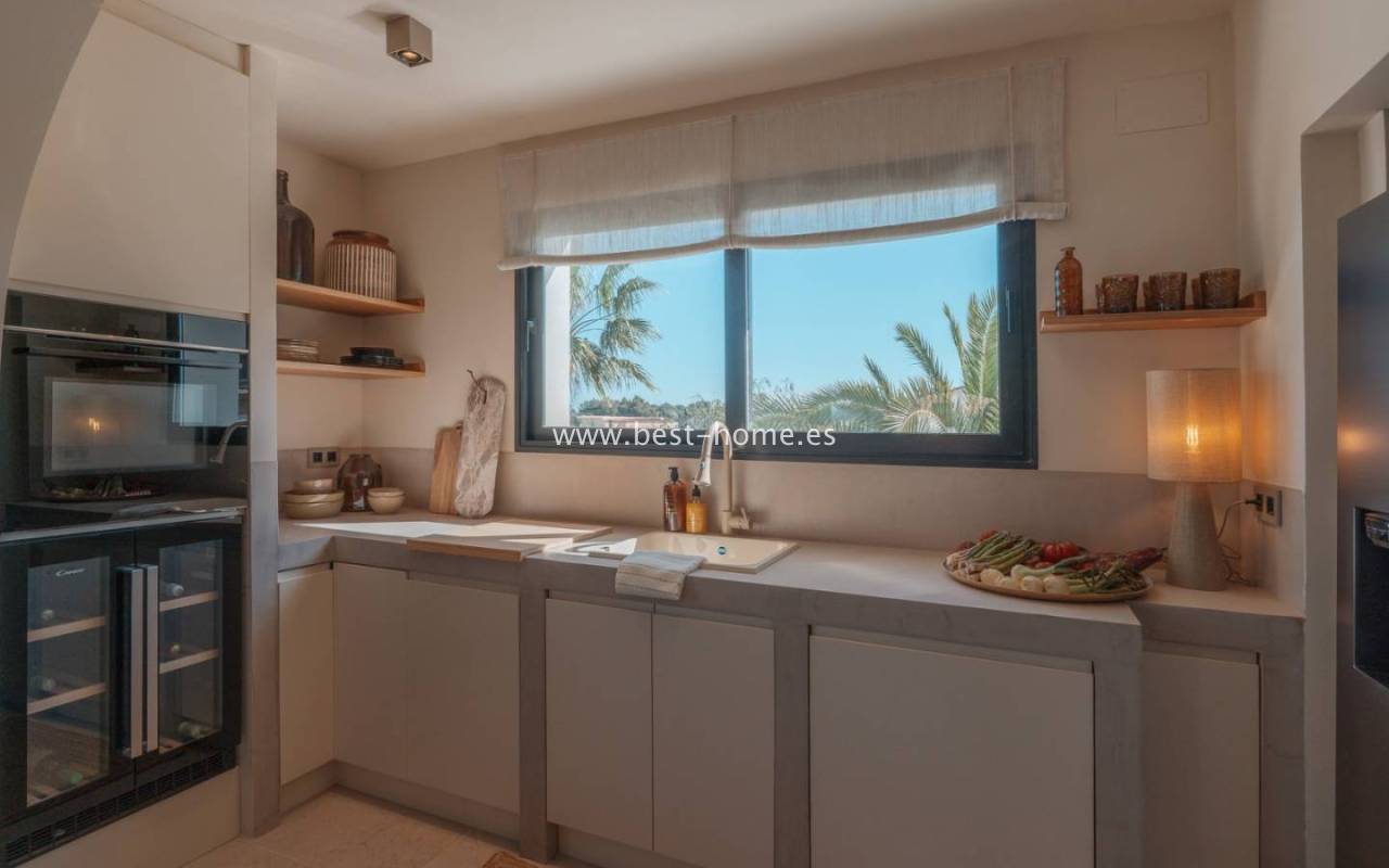 Wnętrze domu oferuje przestronny, jasny salon z dużymi oknami, który łączy się z kuchnią poprzez 4-metrową wyspę. Kuchnia wyposażona jest w wysokiej klasy wbudowane sprzęty AGD. Willa posiada 4 sypialnie z łazienkami, wszystkie z dostępem do prywatnego tarasu, oddzielną toaletę i pomieszczenie gospodarcze.