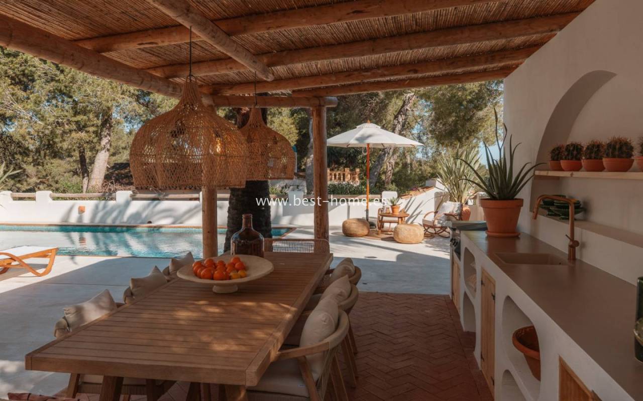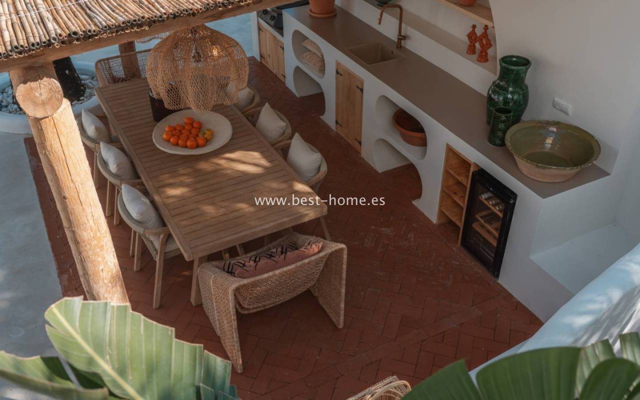 Na zewnątrz znajduje się duży ogród otaczający prywatny basen, a także zadaszona kuchnia na świeżym powietrzu, idealna na przyjęcia. Nieruchomość dysponuje także podwójnym parkingiem z wiatą, automatyką domową, panelami słonecznymi, światłowodami z ulepszonym Wi-Fi, systemem dźwiękowym Sonos, systemem alarmowym z kamerami, systemem nawadniającym oraz wykonanymi na zamówienie szafami i łóżkami. Nieruchomość sprzedawana z pełnym wyposażeniem, gotowa do zamieszkania.