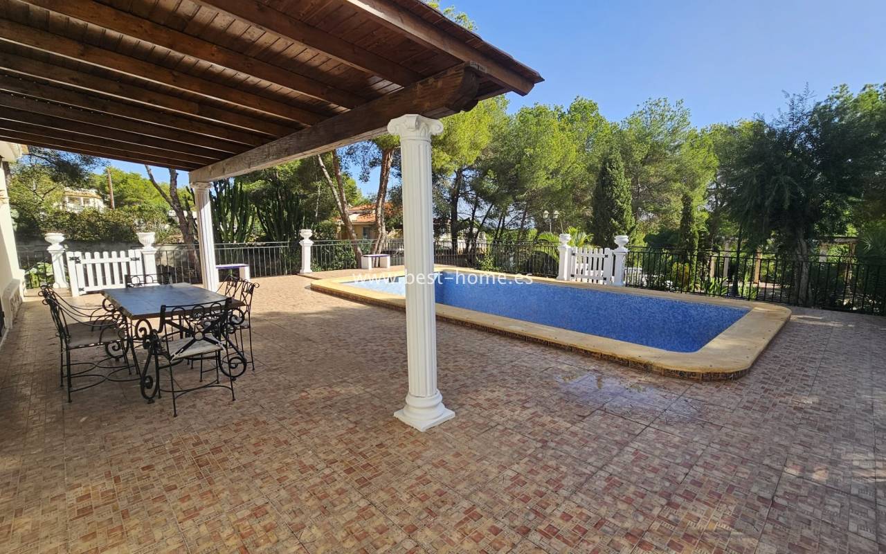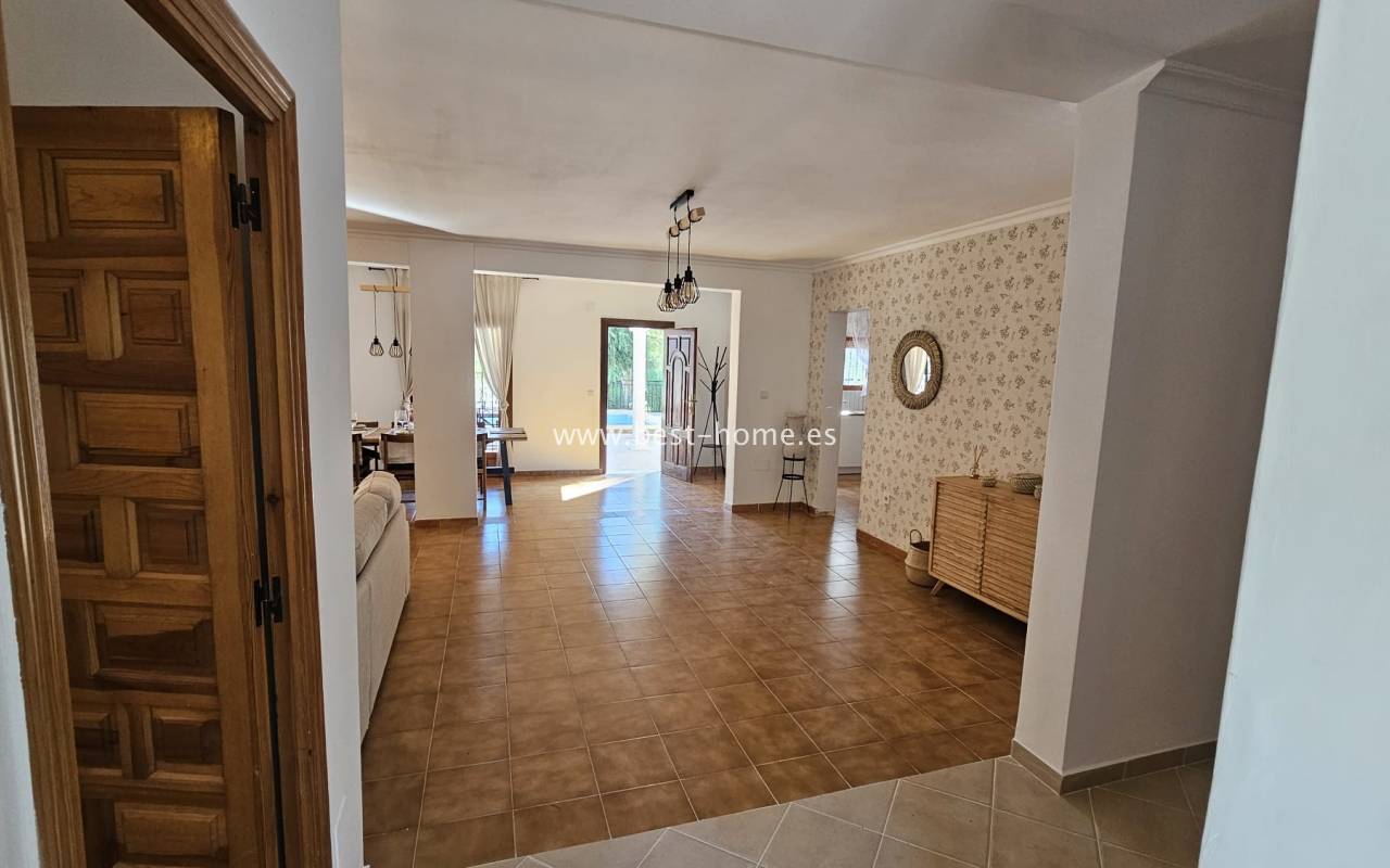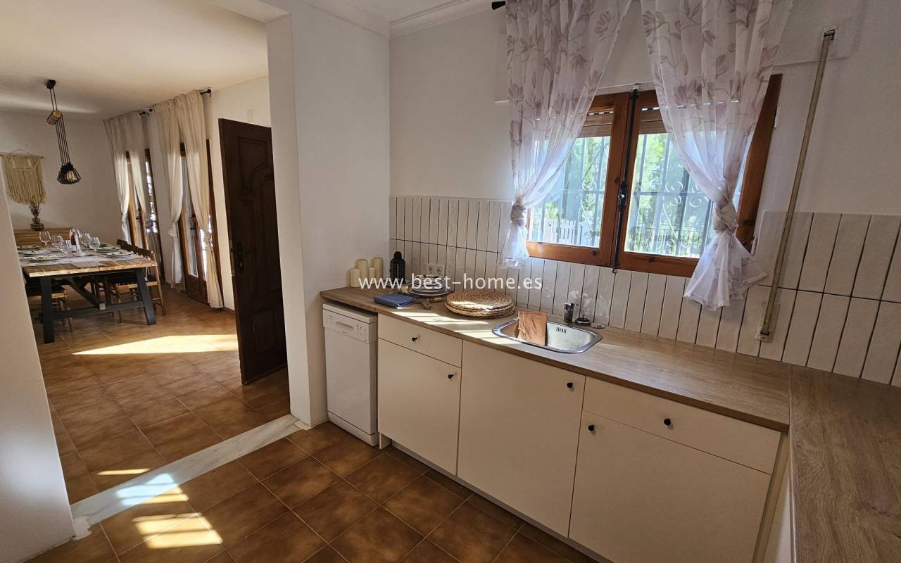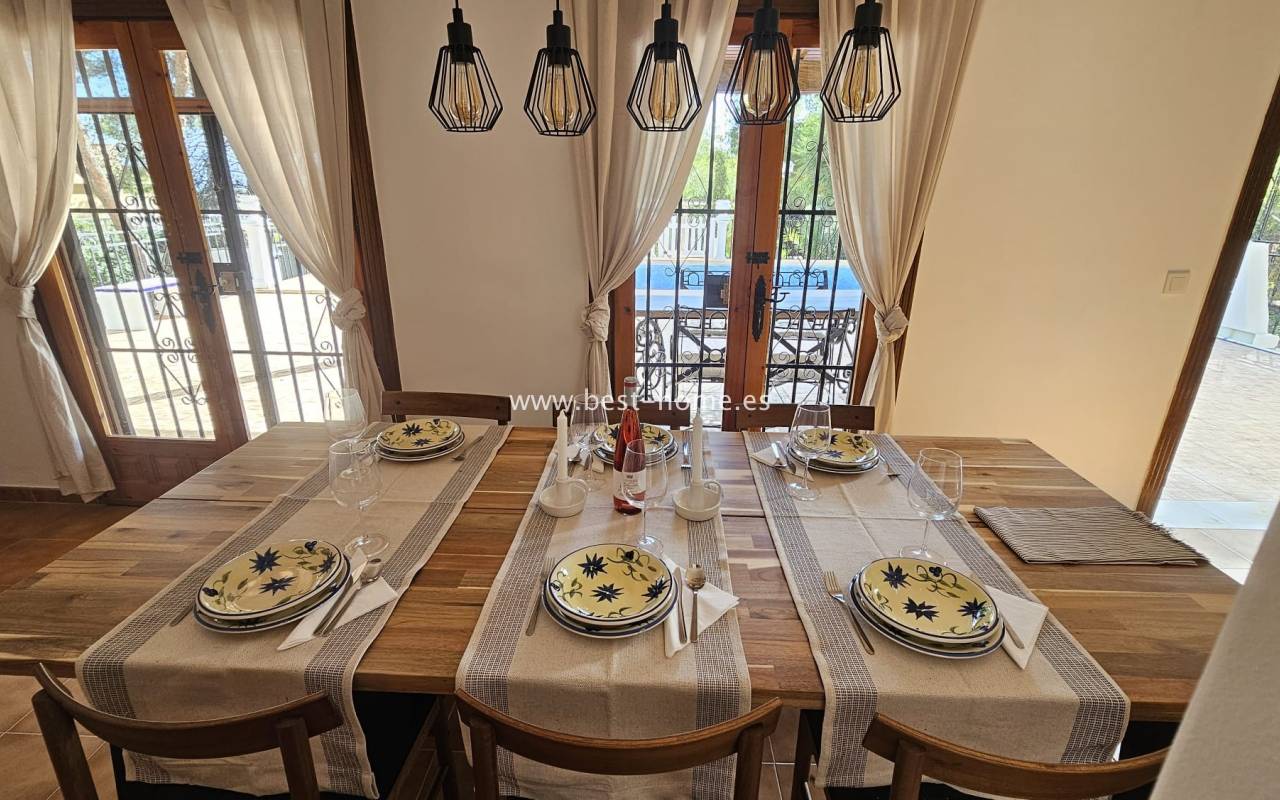 Parterowa willa posiada przestronny i jasny salon z jadalnią i kominkiem, oddzielną, w pełni wyposażoną kuchnię z pomieszczeniem gospodarczym, trzy sypialnie i dwie łazienki. Sypialnia małżeńska posiada łazienkę en-suite i dużą garderobę. Na zewnątrz odnajdziemy wspaniały ogród z dojrzałą roślinnością, mnóstwo zakątków do wypoczynku, duży prywatny basen, a także miejsca parkingowe.