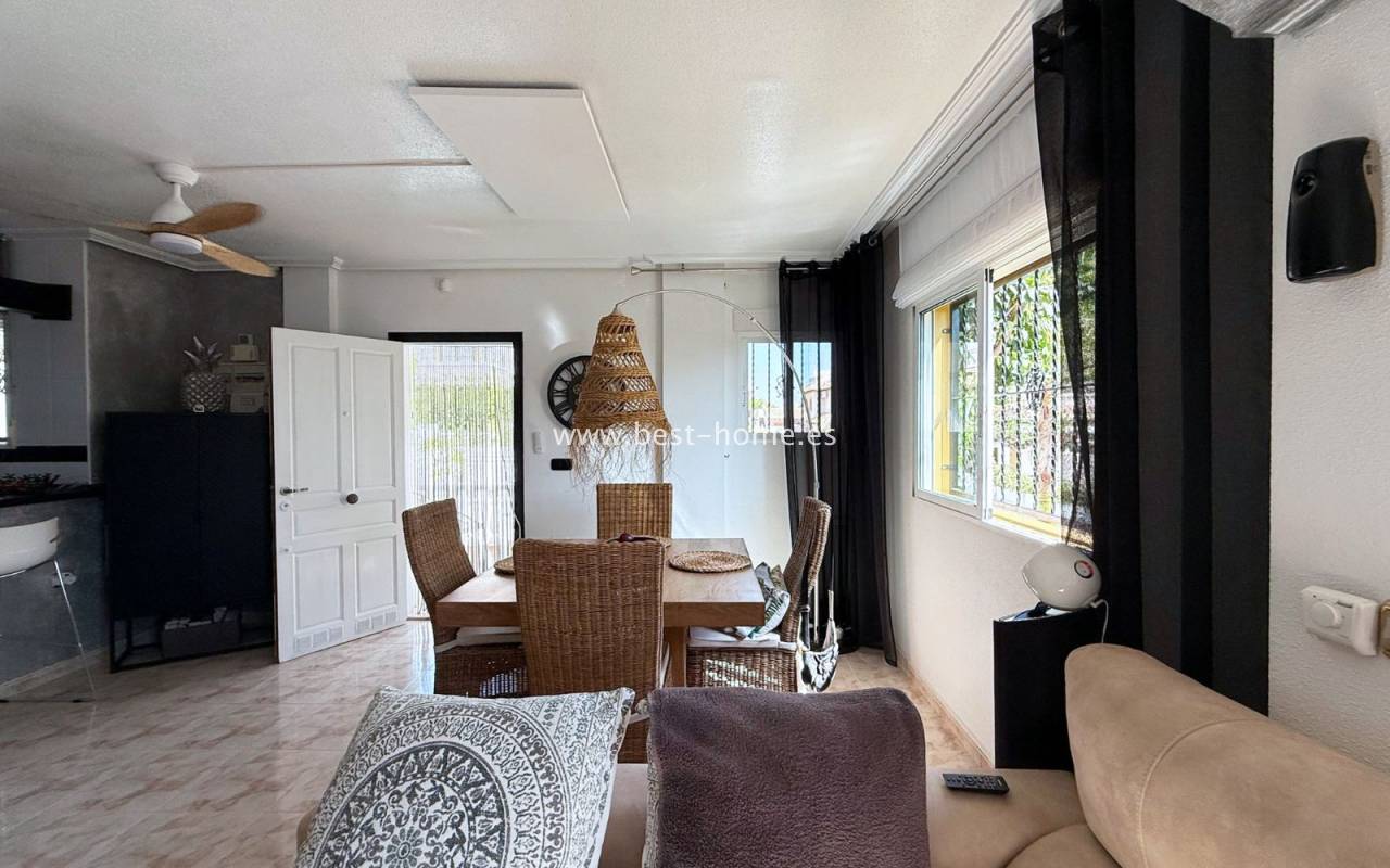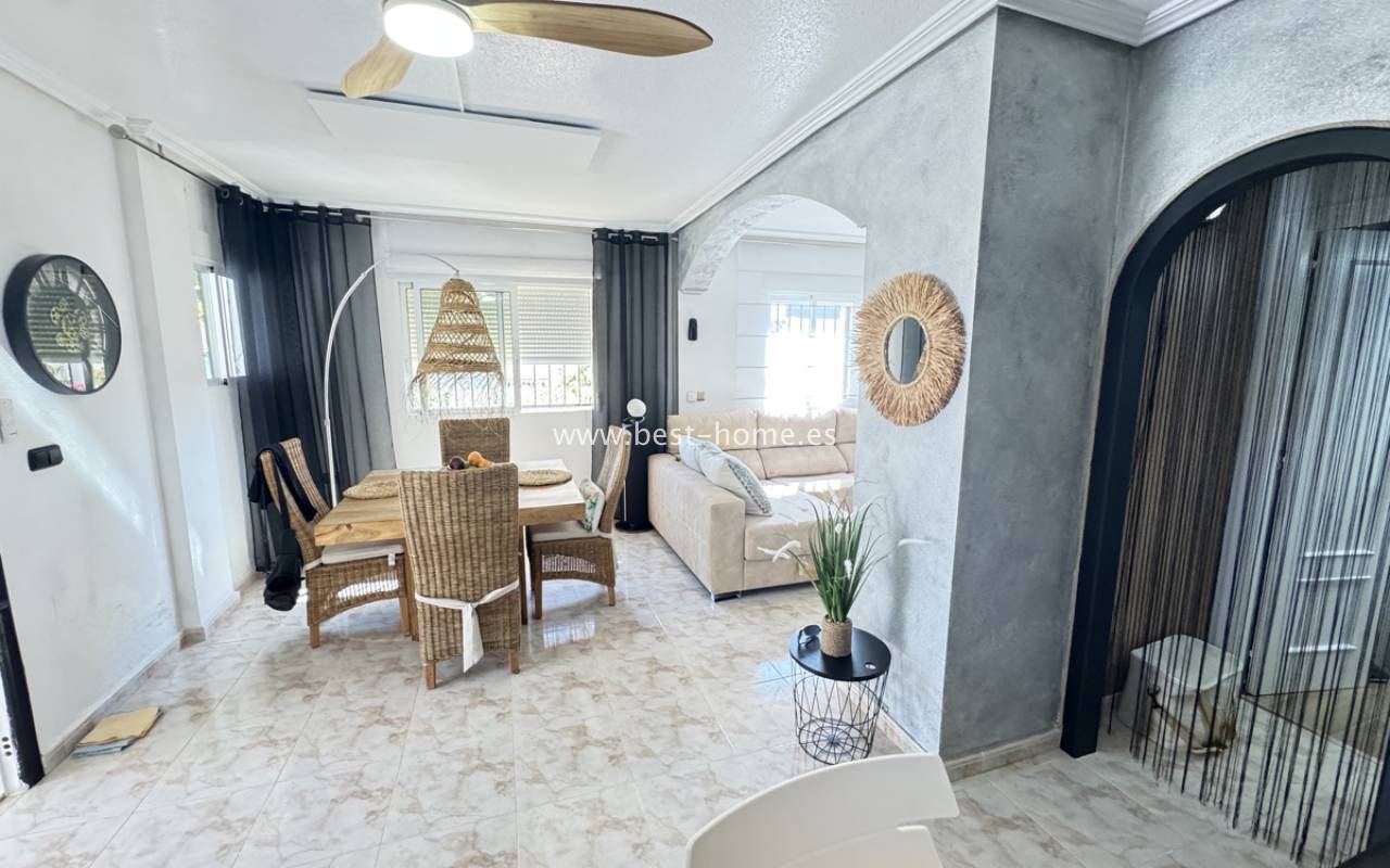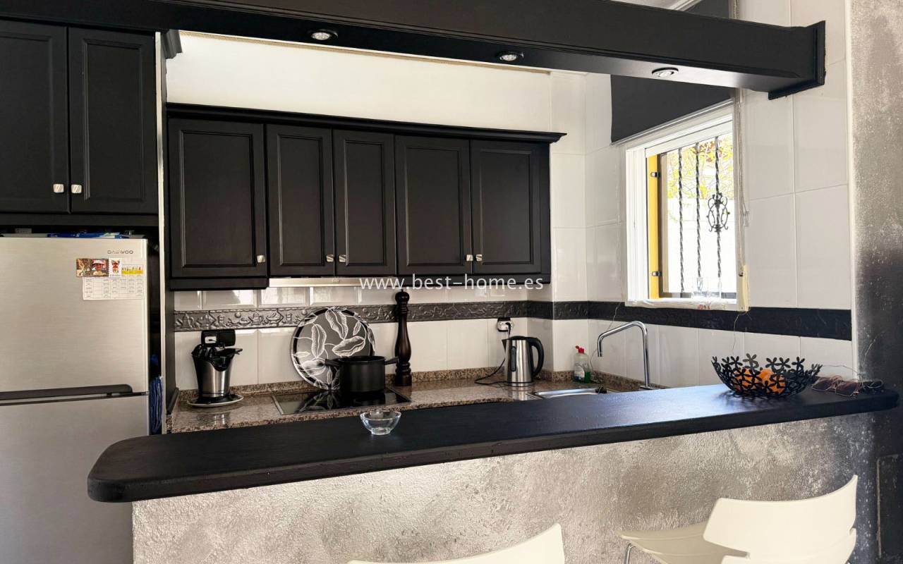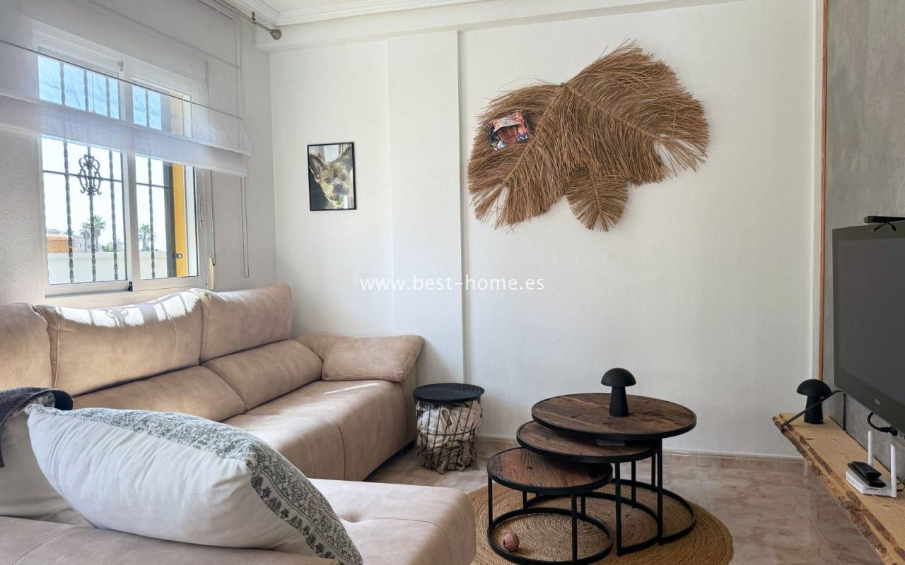 Ten dom w zabudowie szeregowej usytuowany jest na narożnej działce o powierzchni 230 m², co daje poczucie przestrzeni i większej prywatności. Do dyspozycji właścicieli jest prywatny basen, stanowiący doskonałe miejsce do relaksu i spędzania wolnego czasu w słoneczne dni. Na parterze znajduje się przytulny salon połączony z kuchnią oraz toaleta, tworzące wygodną strefę dzienną. Piętro obejmuje dwie sypialnie, łazienkę oraz taras, z którego można korzystać o każdej porze dnia. Dodatkowym atutem jest solarium na dachu, skąd rozpościerają się piękne widoki na okolicę i gdzie można cieszyć się hiszpańskim klimatem w pełnej prywatności. Nieruchomość położona jest w spokojnym, kameralnym osiedlu w Villamartin, w bliskiej odległości zarówno od miasta, jak i od plaży, co sprawia, że lokalizacja łączy w sobie ciszę codziennego życia z łatwym dostępem do wszystkich atrakcji i udogodnień.