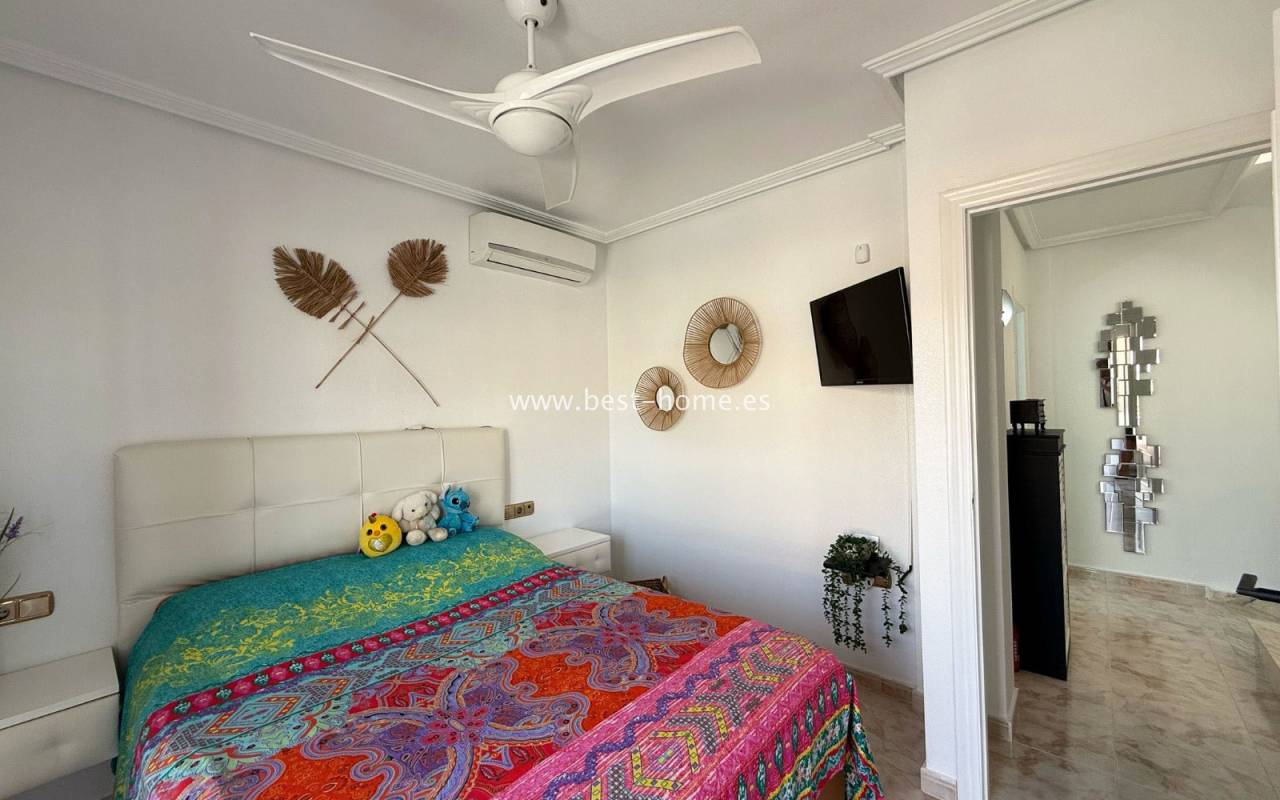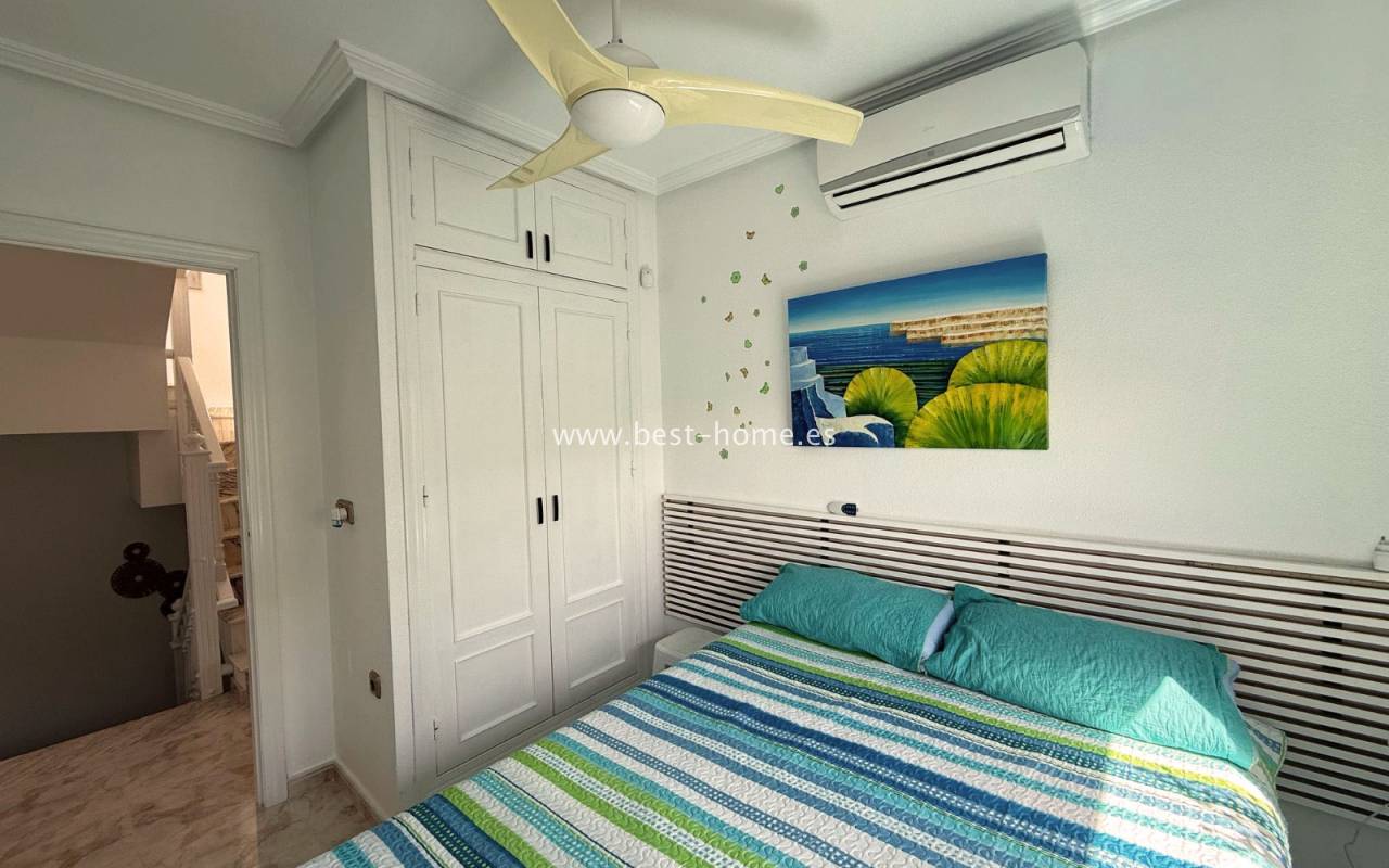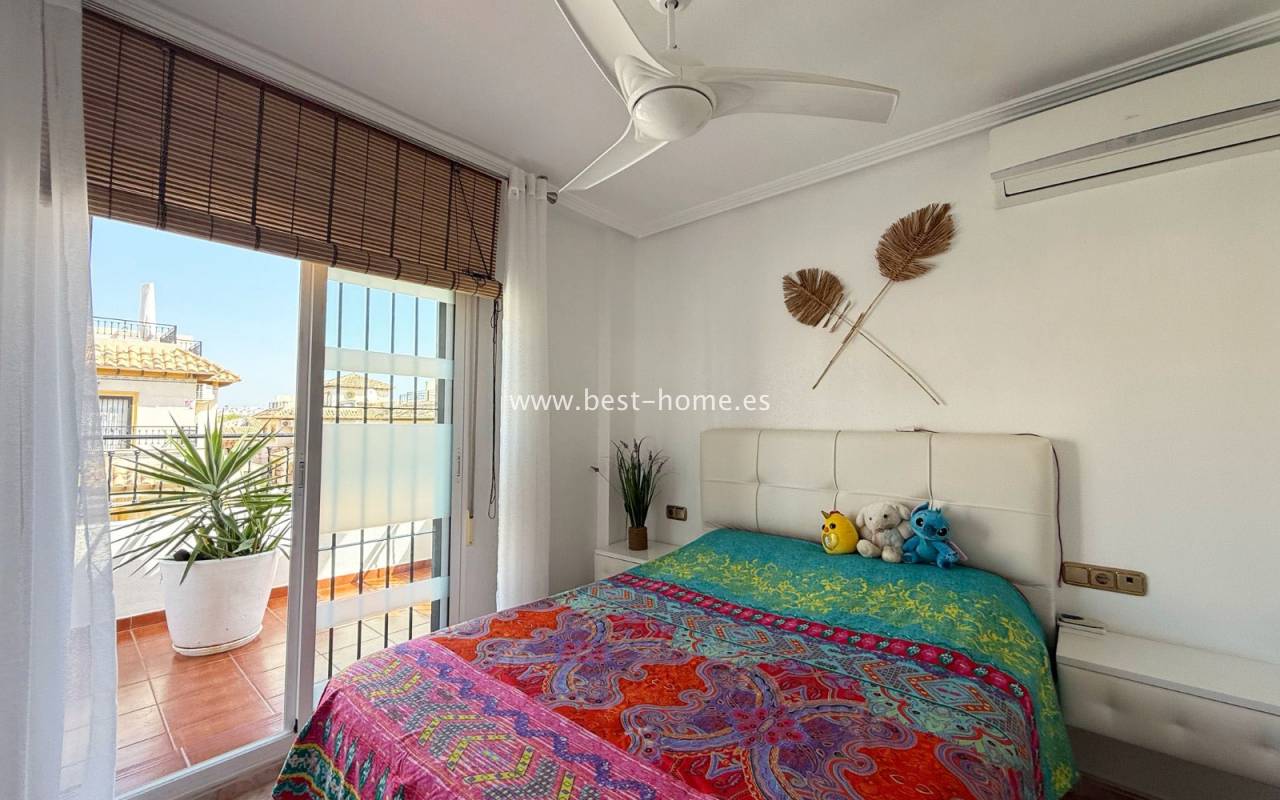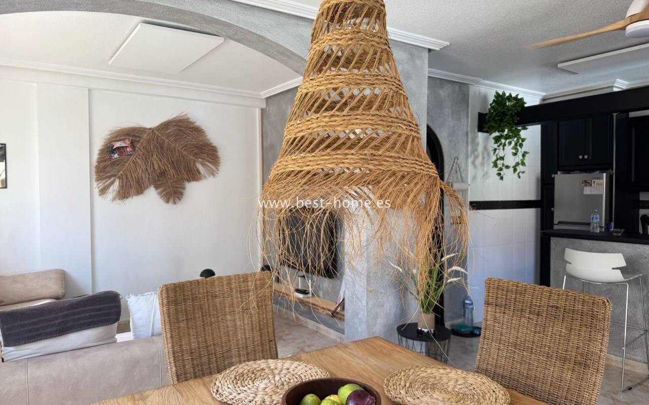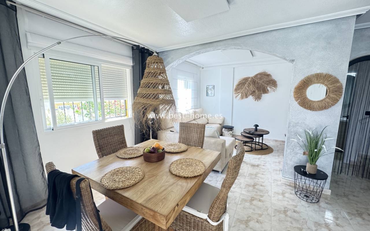 Ten dom w zabudowie szeregowej usytuowany jest na narożnej działce o powierzchni 230 m², co daje poczucie przestrzeni i większej prywatności. Do dyspozycji właścicieli jest prywatny basen, stanowiący doskonałe miejsce do relaksu i spędzania wolnego czasu w słoneczne dni. Na parterze znajduje się przytulny salon połączony z kuchnią oraz toaleta, tworzące wygodną strefę dzienną. Piętro obejmuje dwie sypialnie, łazienkę oraz taras, z którego można korzystać o każdej porze dnia. Dodatkowym atutem jest solarium na dachu, skąd rozpościerają się piękne widoki na okolicę i gdzie można cieszyć się hiszpańskim klimatem w pełnej prywatności. Nieruchomość położona jest w spokojnym, kameralnym osiedlu w Villamartin, w bliskiej odległości zarówno od miasta, jak i od plaży, co sprawia, że lokalizacja łączy w sobie ciszę codziennego życia z łatwym dostępem do wszystkich atrakcji i udogodnień.