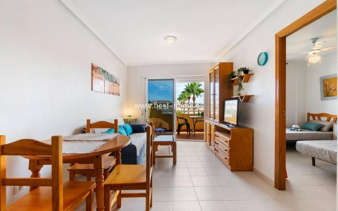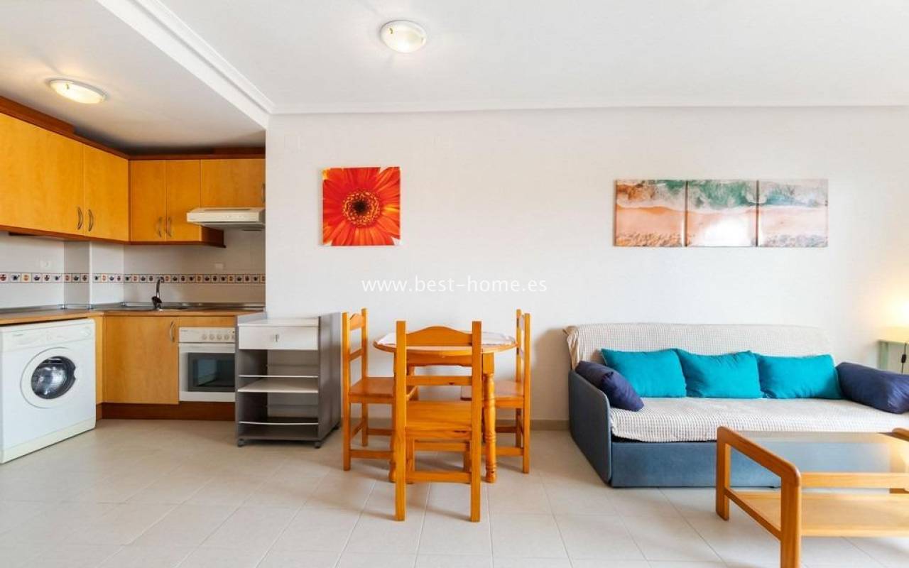 Apartament położony jest w 1 linii brzegowej od fantastycznych dwóch plaż: playa de la Glea y playa Aguamarina. Nieruchomość jest na 3 piętrze, składa się z umeblowanej kuchni połączonej z salonem, jednej sypialnia i łazienki. Z salonu jest wyjście na taras, z którego mamy ładny widok na okolicę i morze. W cenie umeblowanie, sprzęt AGD i miejsce parkingowe w podziemiach budynku. Bezpośrednie zejście z osiedla do plaży. Idealny apartament na wakacje lub pod wynajem.