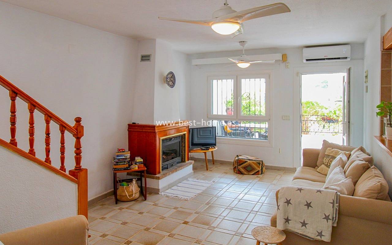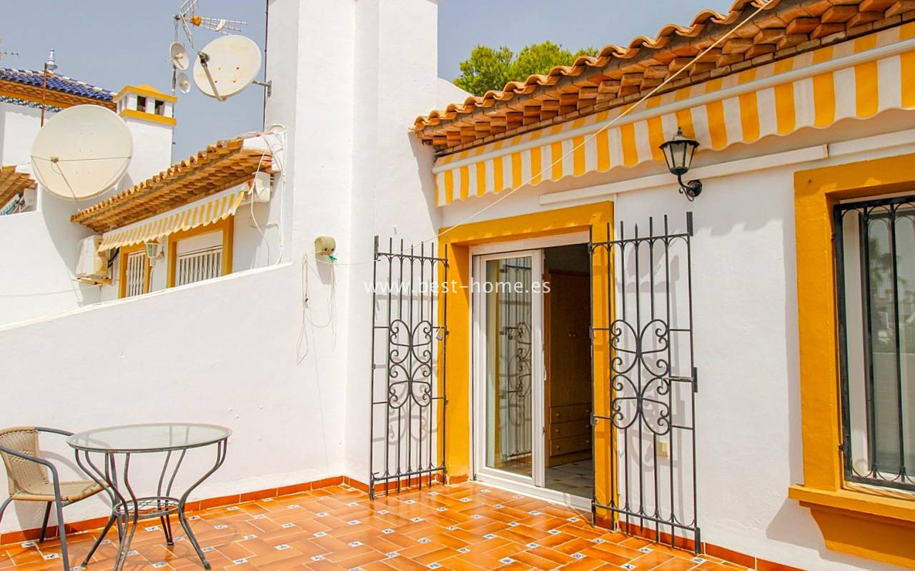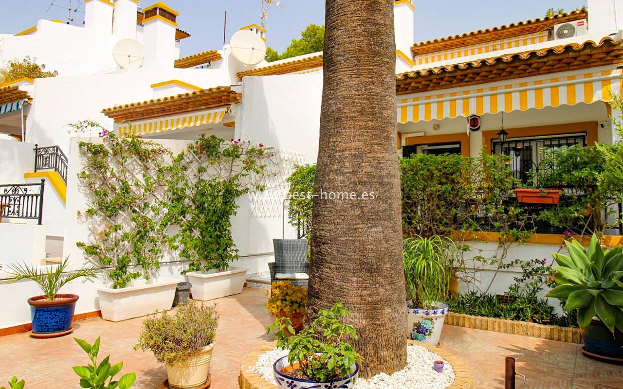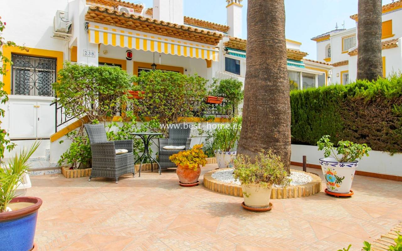 Dom szeregowy położony jest w pięknej, spokojnej i pełnej zieleni urbanizacji Valencia w Villamrtin. Nieruchomość posiada przedni ogródek z palmą, podniesiony taras wejściowy, następnie jest salon z kominkiem, umeblowana kuchnia z pomieszczeniem gospodarczym, dwie sypialnie i wyremontowana łazienka. Z głównej sypialni jest wyjście na tylny taras/ogródek i wspaniały wspólny dziedziniec. Na piętrze odnajdziemy trzecią sypialnię z łazienka oraz taras. W cenie częściowe umeblowanie, sprzęt AGD i klimatyzacja. Do basenu jest zaledwie 50 m, a w pobliżu jest restauracja, korty tenisowe i miejsca do spacerowania. Nieruchomość posiada południową i północną orientację.