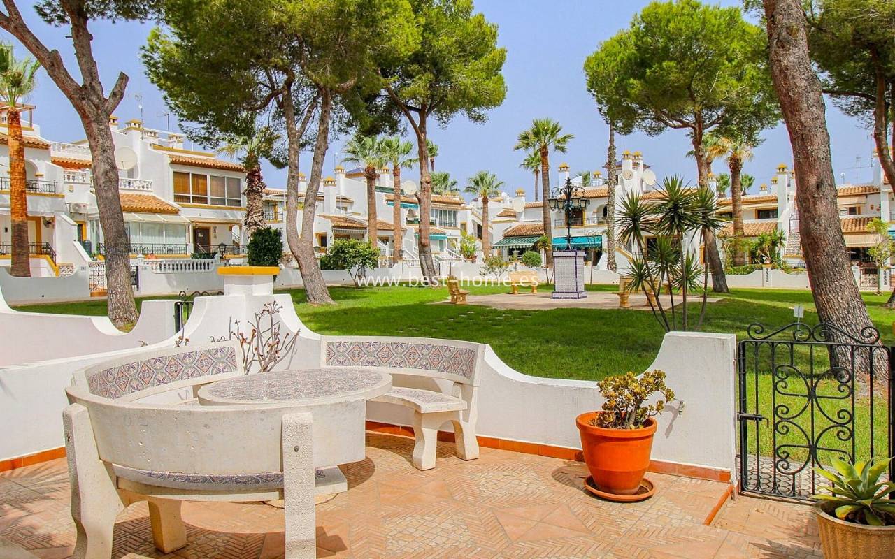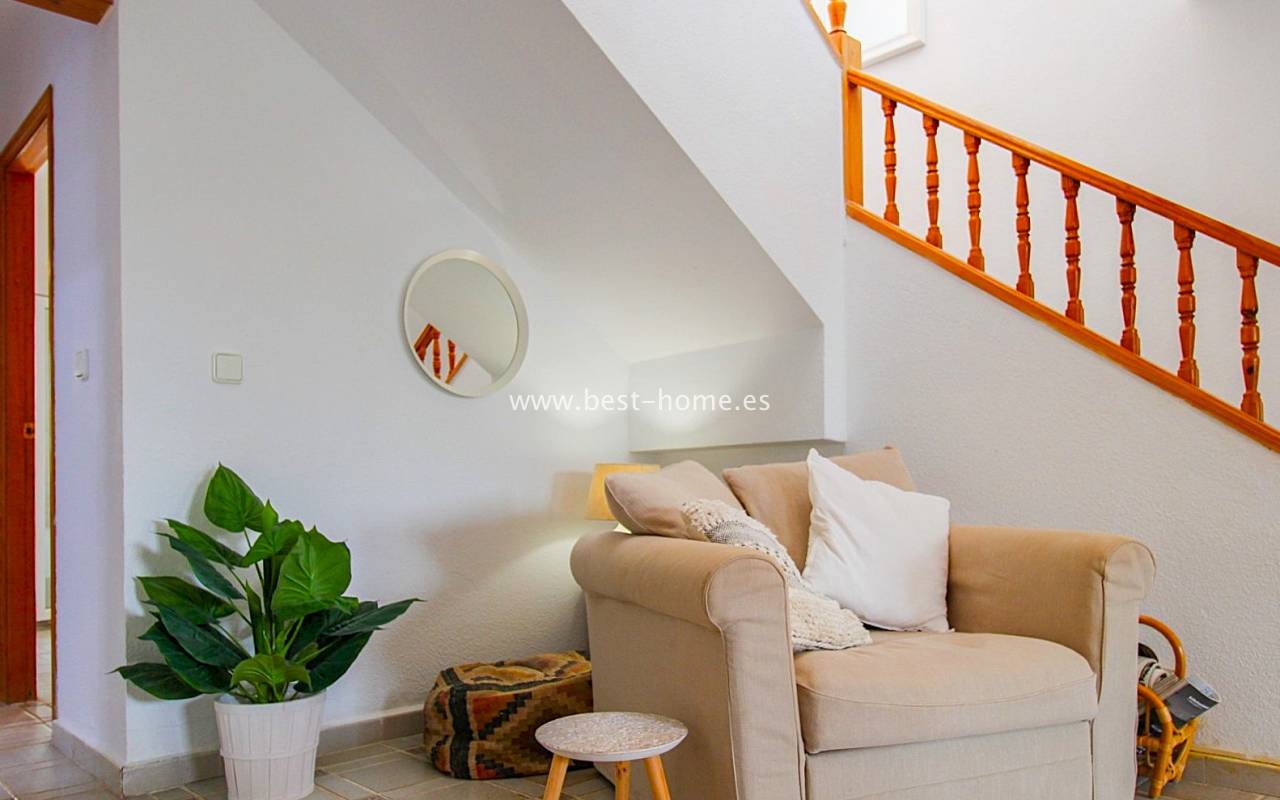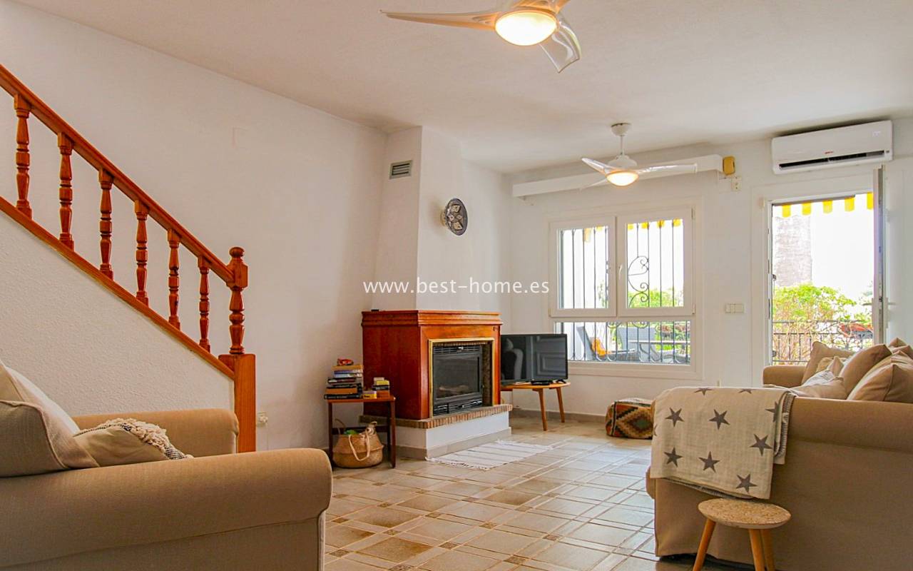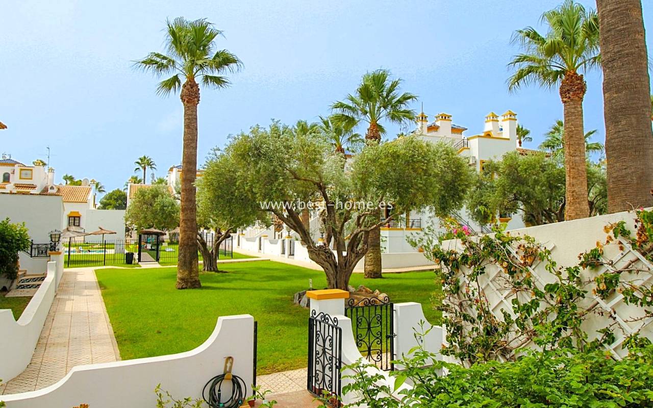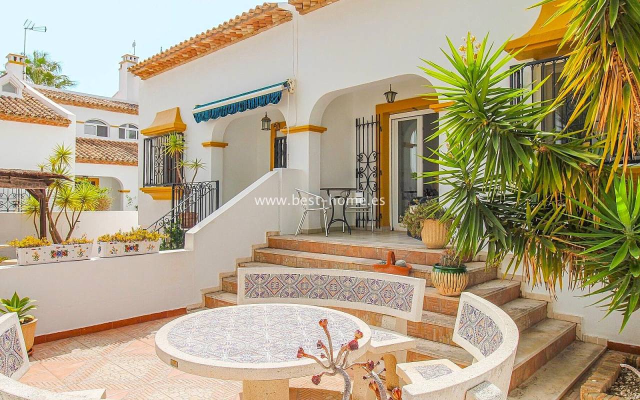 Dom szeregowy położony jest w pięknej, spokojnej i pełnej zieleni urbanizacji Valencia w Villamrtin. Nieruchomość posiada przedni ogródek z palmą, podniesiony taras wejściowy, następnie jest salon z kominkiem, umeblowana kuchnia z pomieszczeniem gospodarczym, dwie sypialnie i wyremontowana łazienka. Z głównej sypialni jest wyjście na tylny taras/ogródek i wspaniały wspólny dziedziniec. Na piętrze odnajdziemy trzecią sypialnię z łazienka oraz taras. W cenie częściowe umeblowanie, sprzęt AGD i klimatyzacja. Do basenu jest zaledwie 50 m, a w pobliżu jest restauracja, korty tenisowe i miejsca do spacerowania. Nieruchomość posiada południową i północną orientację.