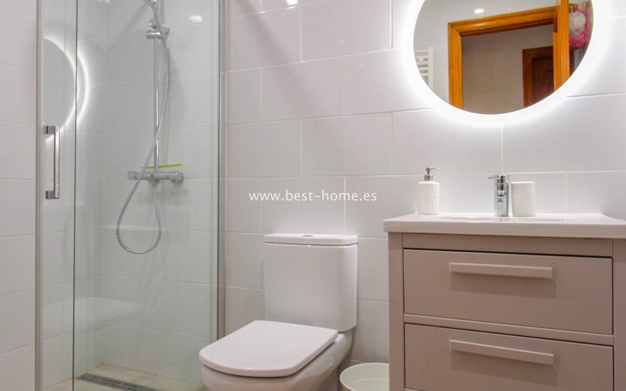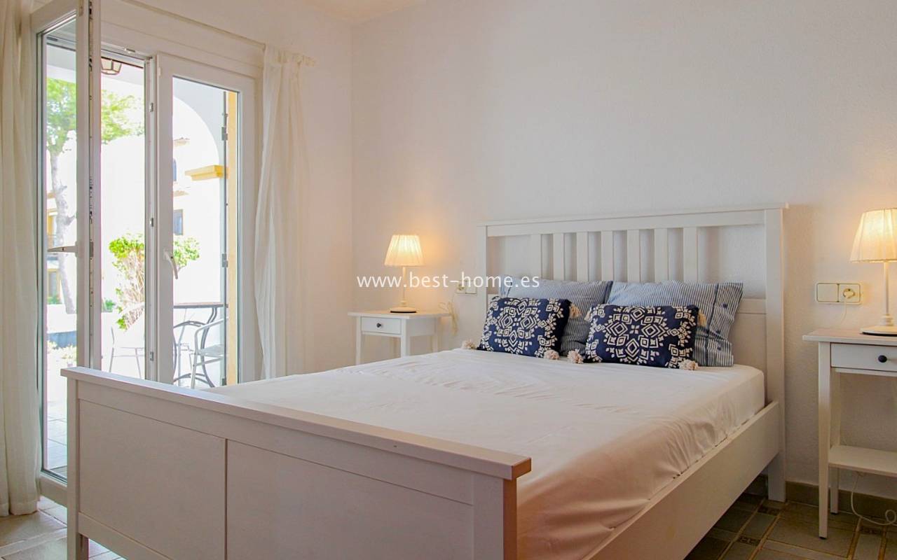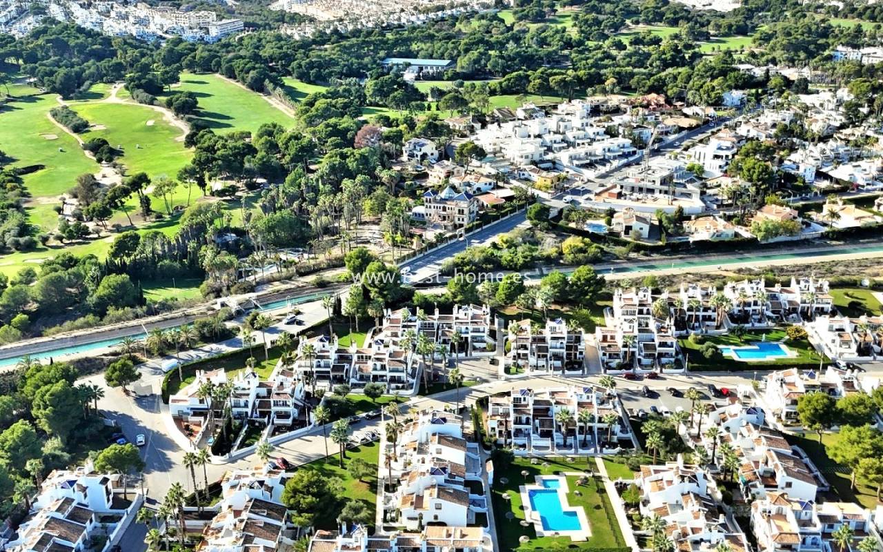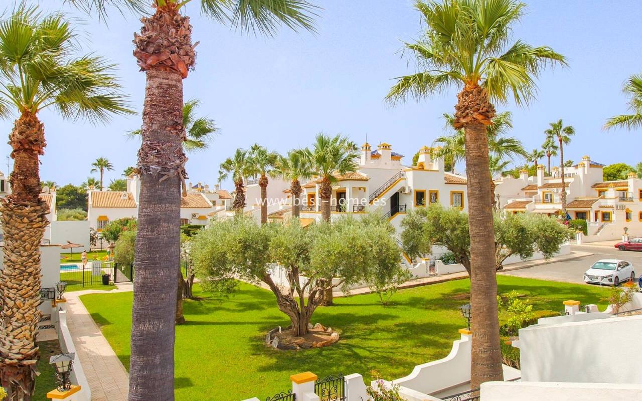 Dom szeregowy położony jest w pięknej, spokojnej i pełnej zieleni urbanizacji Valencia w Villamrtin. Nieruchomość posiada przedni ogródek z palmą, podniesiony taras wejściowy, następnie jest salon z kominkiem, umeblowana kuchnia z pomieszczeniem gospodarczym, dwie sypialnie i wyremontowana łazienka. Z głównej sypialni jest wyjście na tylny taras/ogródek i wspaniały wspólny dziedziniec. Na piętrze odnajdziemy trzecią sypialnię z łazienka oraz taras. W cenie częściowe umeblowanie, sprzęt AGD i klimatyzacja. Do basenu jest zaledwie 50 m, a w pobliżu jest restauracja, korty tenisowe i miejsca do spacerowania. Nieruchomość posiada południową i północną orientację.