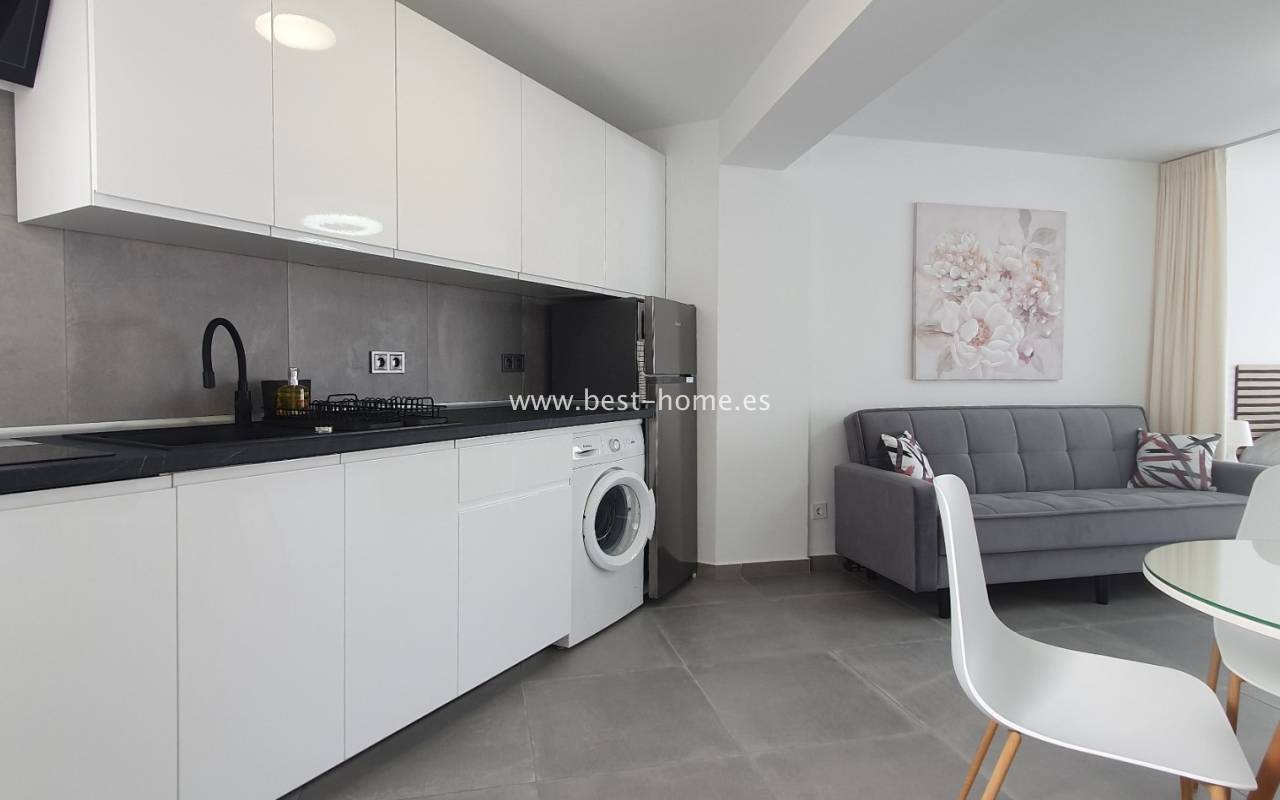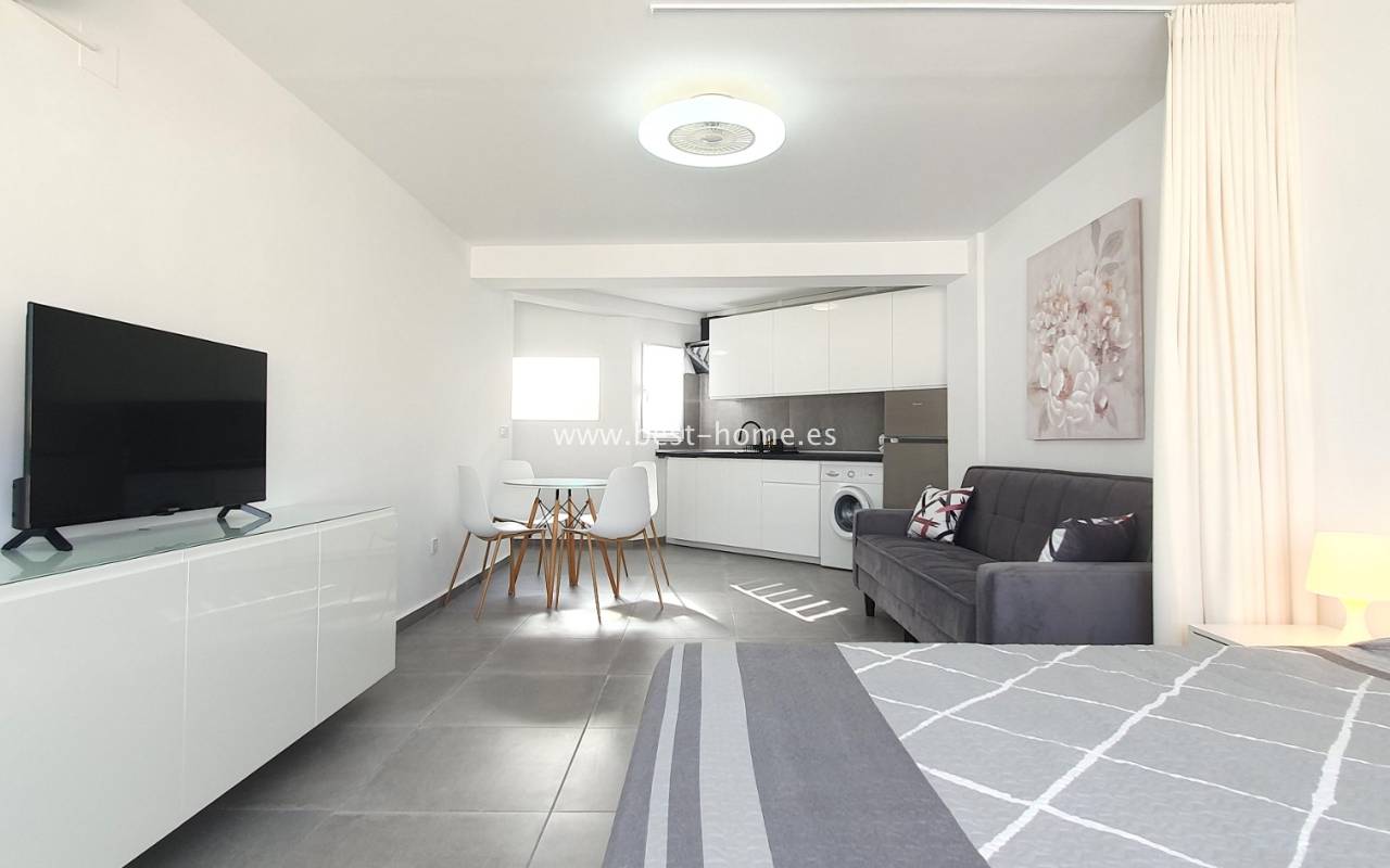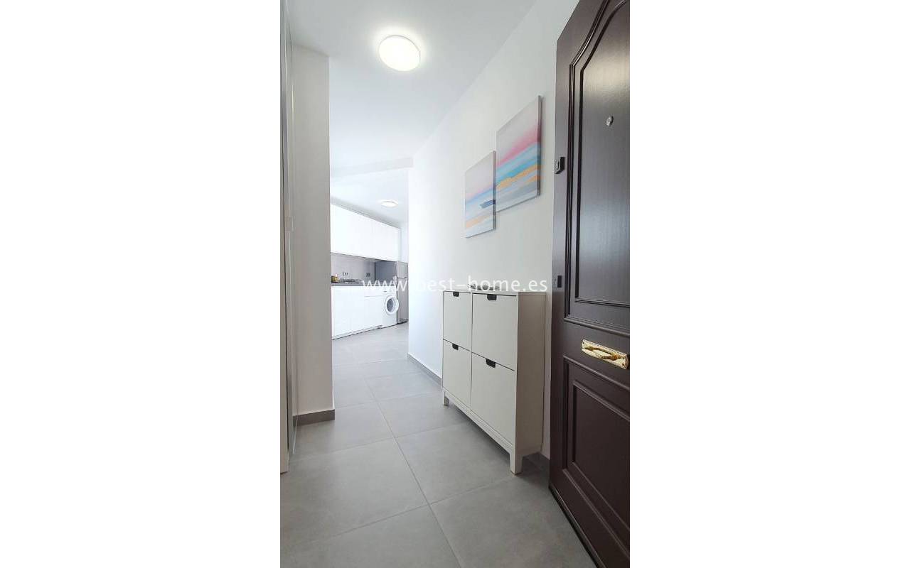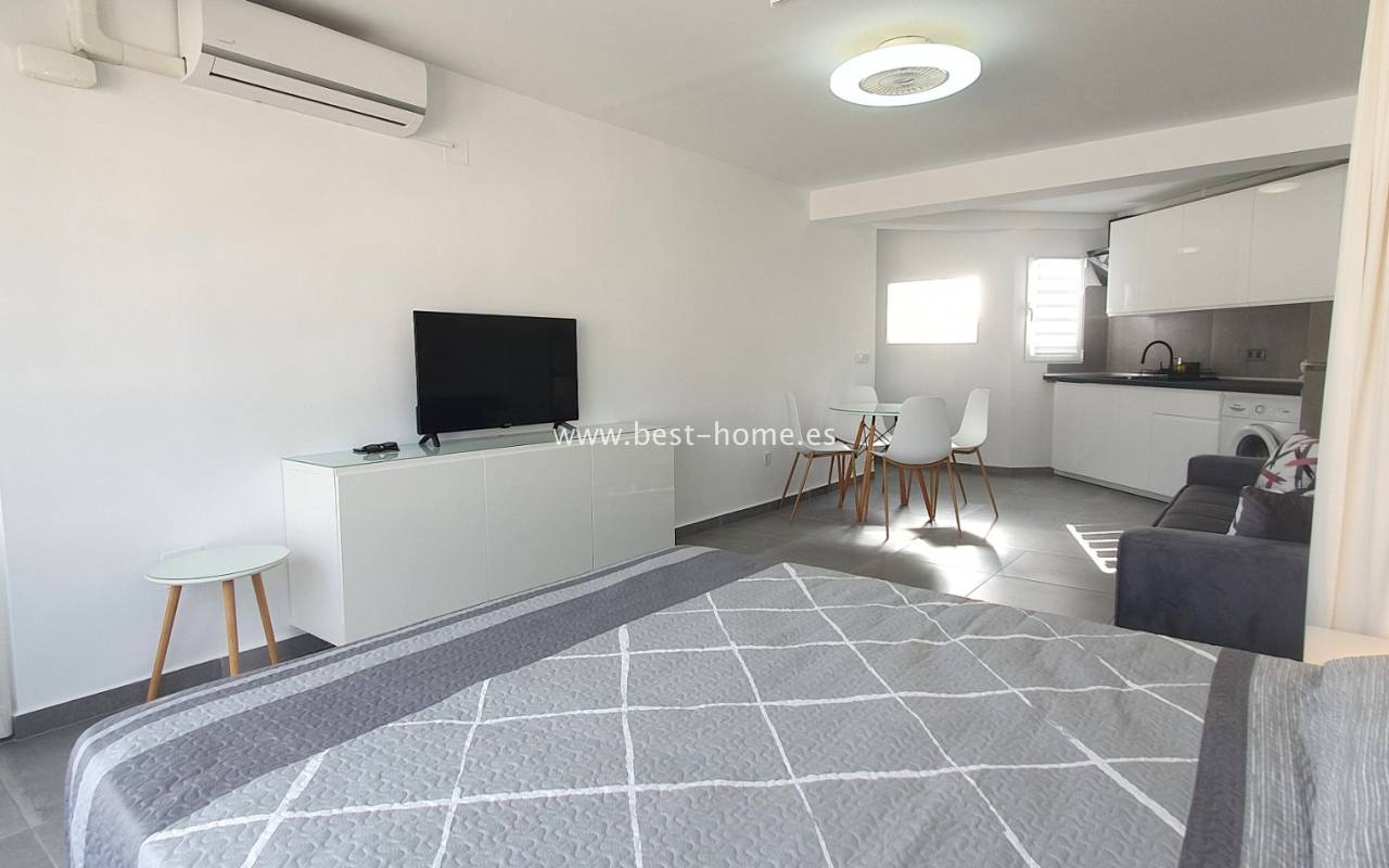 Kompletnie wyremontowana i bardzo przestronna kawalerka położona jest w 1 linii brzegowej od nadmorskiej promenady i plaży Los Locos. Nieruchomość jest na 7 najwyższym piętrze, składa się z korytarza wejściowego, gdzie odnajdziemy dwie szafy, łazienki z prysznicem, nowoczesnej kuchni/jadalni połączonej z salonem/sypialnią. Mieszkanie po kompletnym remoncie, ładnie i gustownie umeblowane, komfortowe dla 4 osób. W cenie umeblowanie, sprzęt AGD, pełne wyposażenie kuchni, pościele i ręczniki.