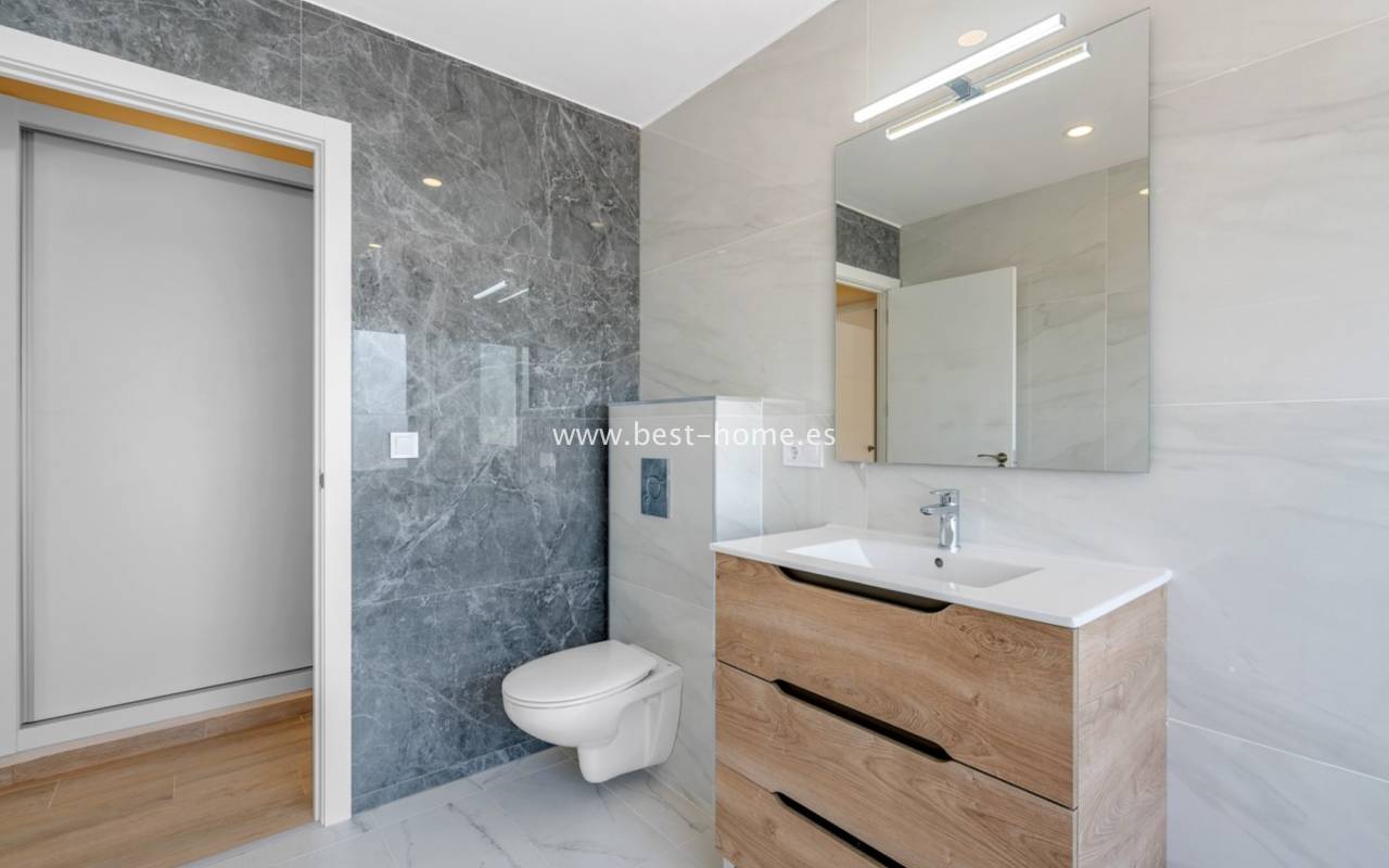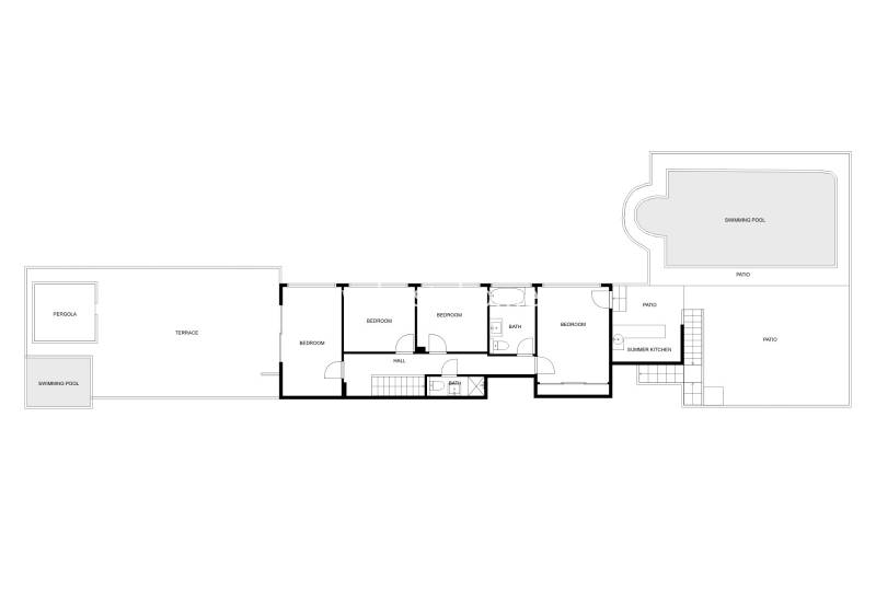 Na niższej kondygnacji znajdują się cztery przestronne sypialnie (dwie z bezpośrednim wyjściem do ogrodu), dwie w pełni wyposażone łazienki oraz duża strefa relaksu – idealna do odpoczynku i spędzania czasu z rodziną lub przyjaciółmi. Z tego poziomu wychodzi się bezpośrednio na taras z prywatnym basenem (36 m²), otoczonym słonecznym patio. Do dyspozycji jest też zadaszony bar z instalacją wodno-elektryczną, grill, tradycyjny piec do pizzy, drewniany ganek oraz łagodnie opadająca ścieżka przez ogród.