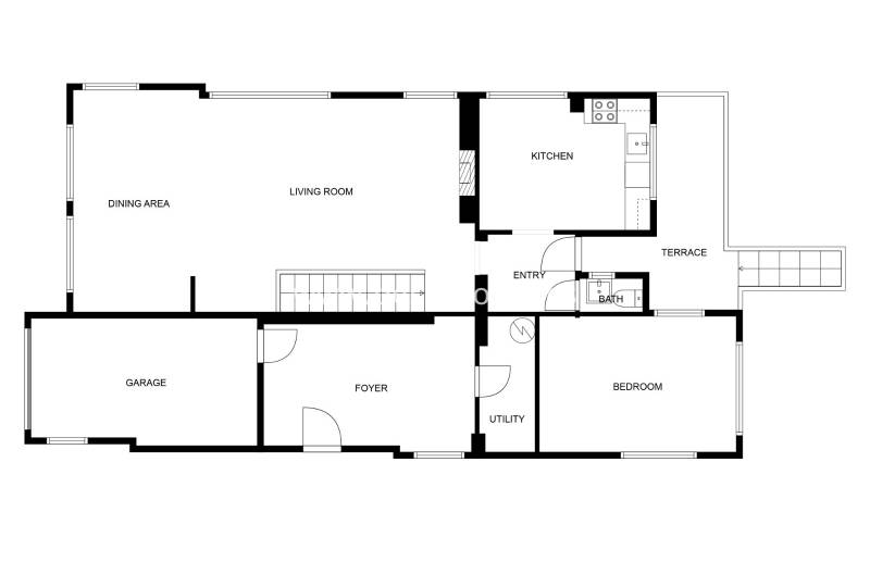 Na poziomie wejścia znajduje się przestronny salon z kominkiem i panoramicznym widokiem, oddzielna, w pełni wyposażona kuchnia, taras prowadzący do strefy wypoczynkowej z grillem i basenem, jedna sypialnia dwuosobowa oraz toaleta dla gości. Dodatkowo na tym poziomie mieści się reprezentacyjny hol, który może pełnić funkcję gabinetu, zamykany garaż oraz pomieszczenie gospodarcze z pralnią.