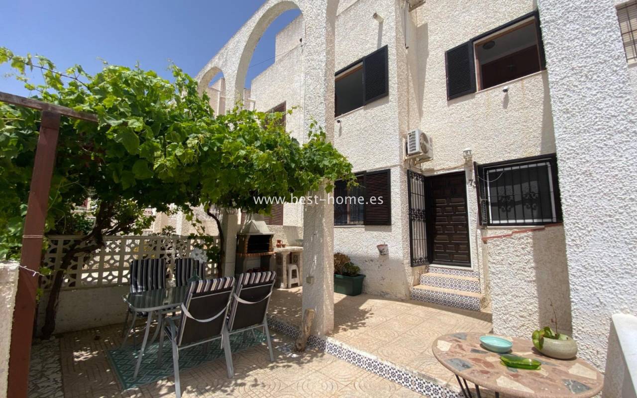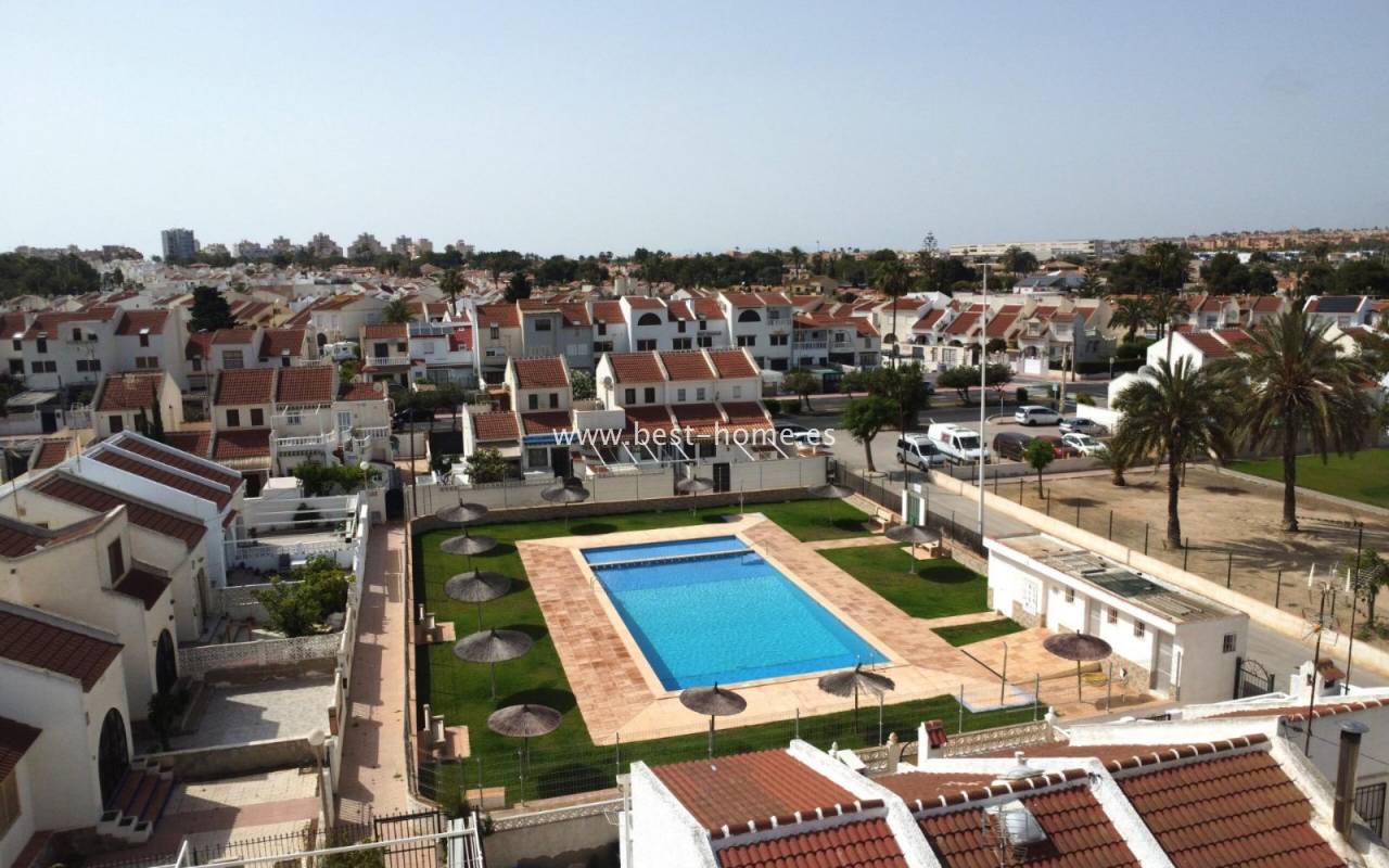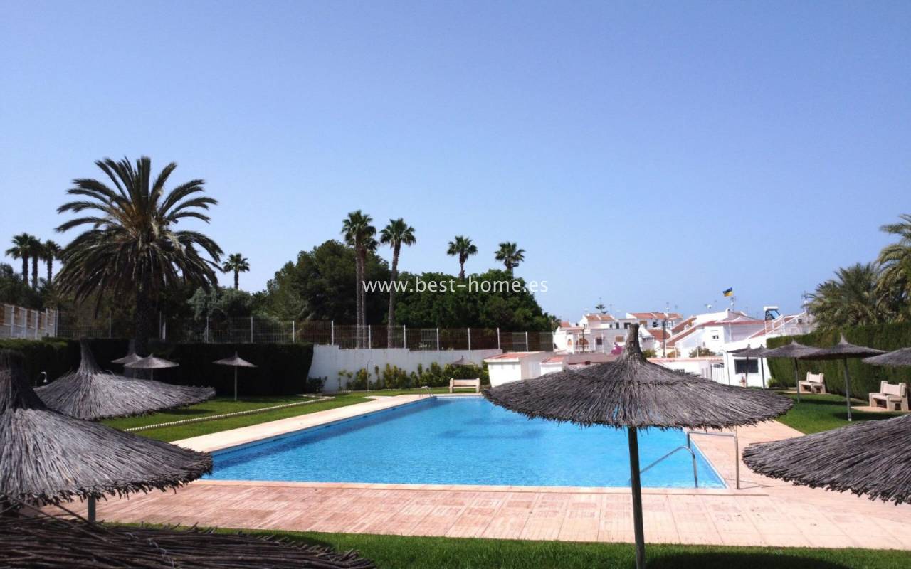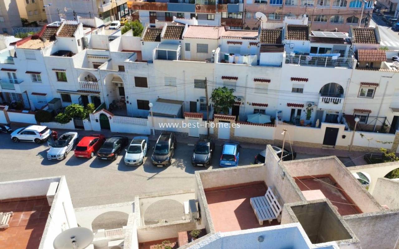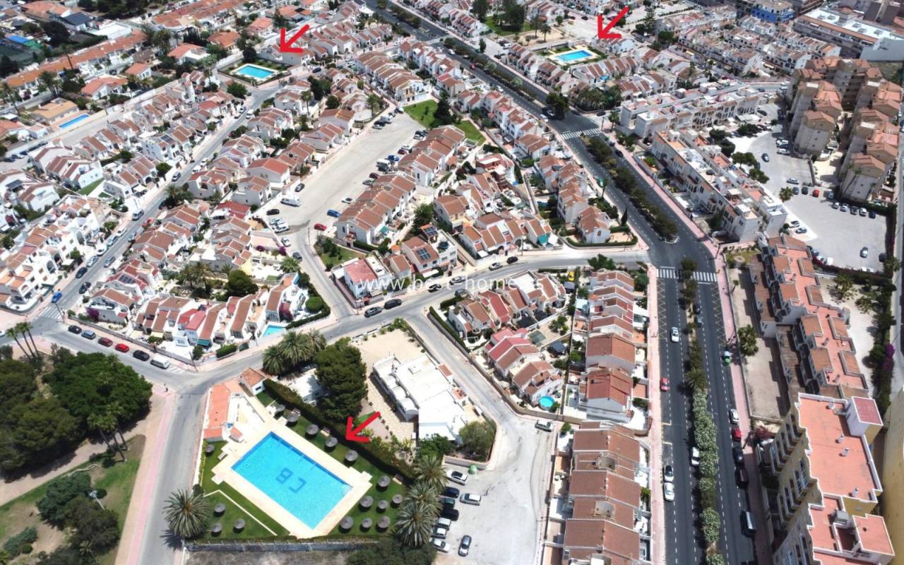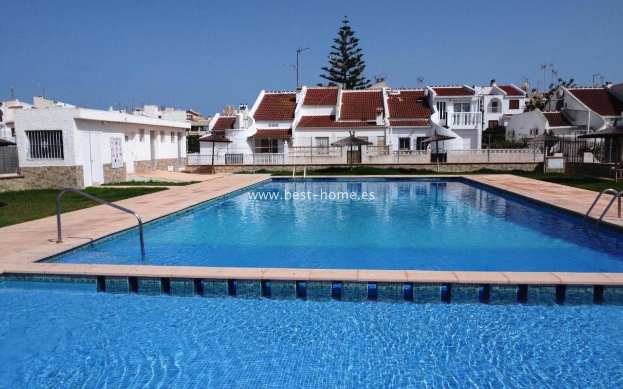 Bungalow 3 poziomowy z solarium, ogrodem i basenem osiedlowym oraz licencją turystyczną na presiżowym osiedlu Calas Blancas w Torrevieja. Przez ogród o powierzchni 15 m2 wchodzimy do środka, gdzie znajdziemy salon z jadalnią, małe pomieszczenie gospodarcze ( piwniczka ). Na 1 piętrze znajdziemy dużą pierwszą sypialnię z szafą i łazienkę typu e-suite z prysznicem, na 2 piętrze znajdziemy drugą sypialnię z łóżkiem piętrowym i wyjściem na malutki taras i toaletę. Na 3 piętrze znajdziemy słoneczne solariuum z widokiem bocznym na morze. Mieszkanie jest wyposażone w klimatyzację i sprzedawane wraz z meblami. Na terenie osiedla znajduje się basen przeznaczony dla mieszkańców. W pobliżu znajdziemy sklep spożywczy Consum, park, dużą ilośc barów, restauracji kawiarnii.