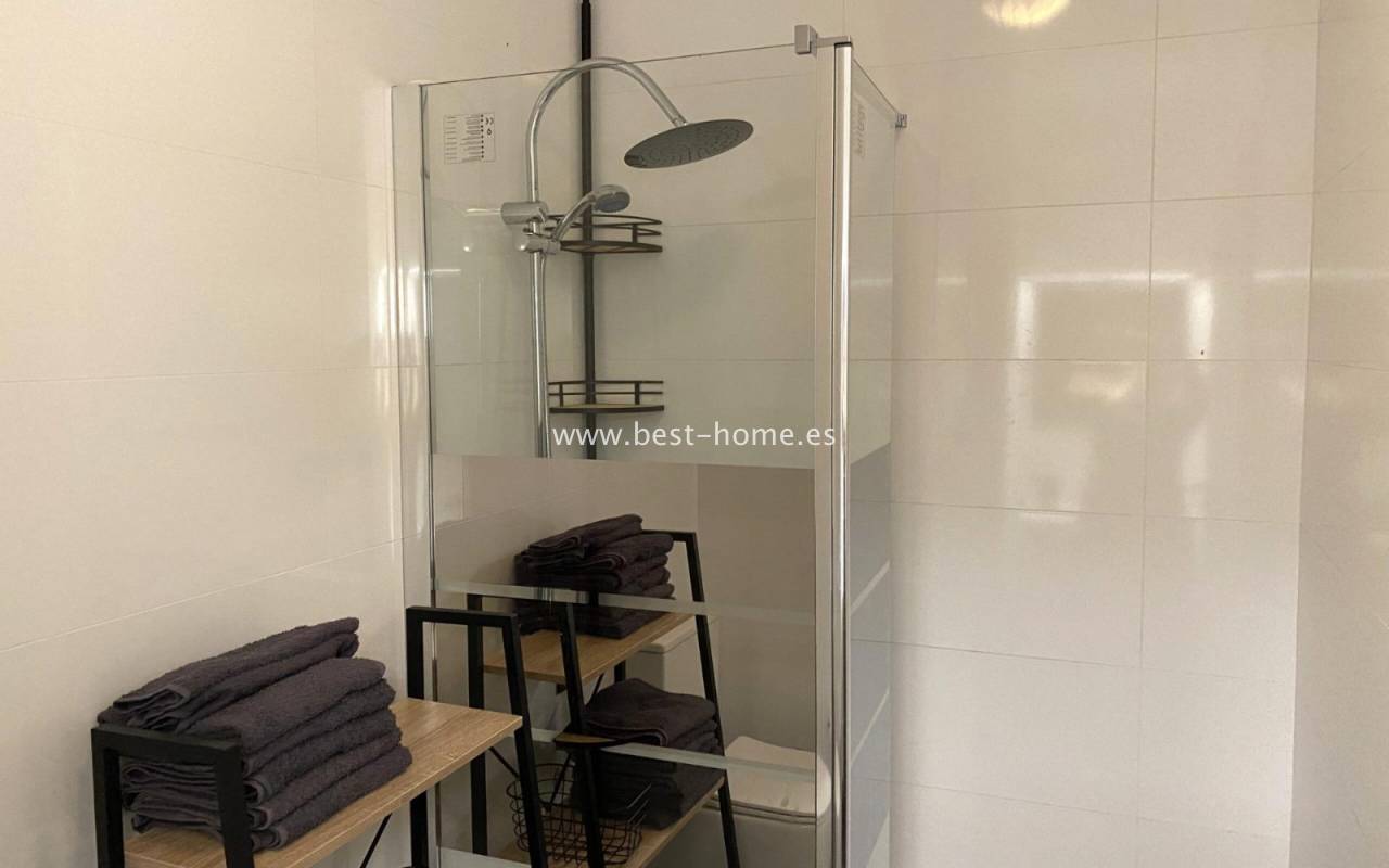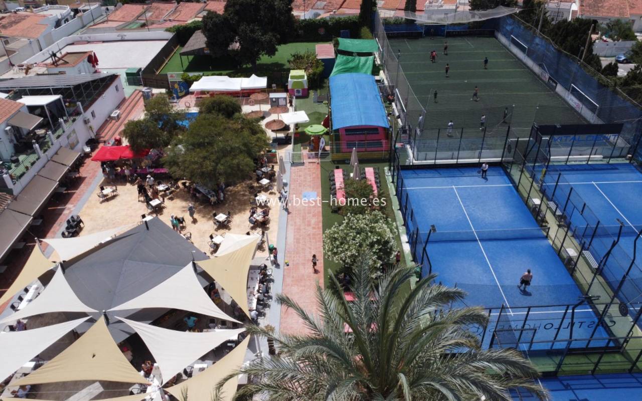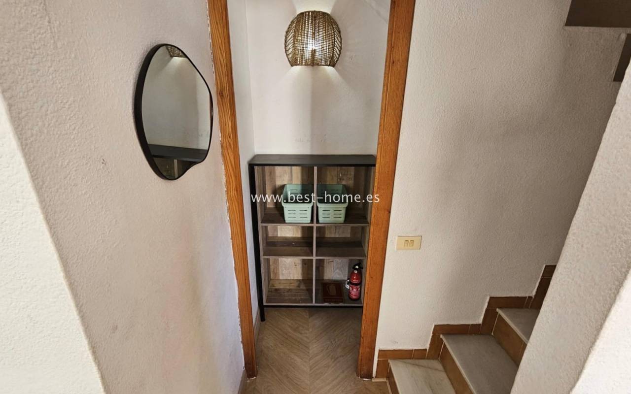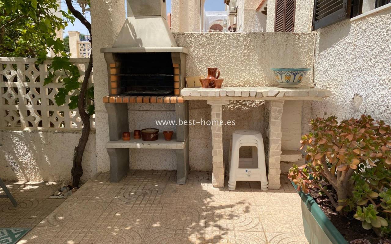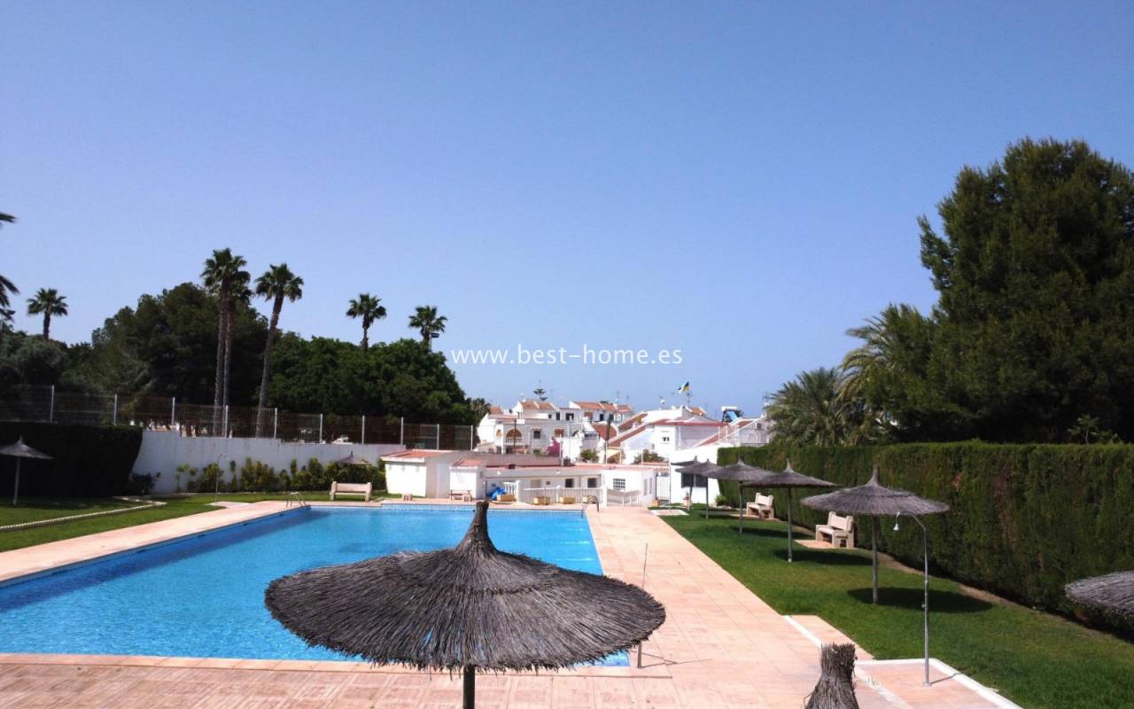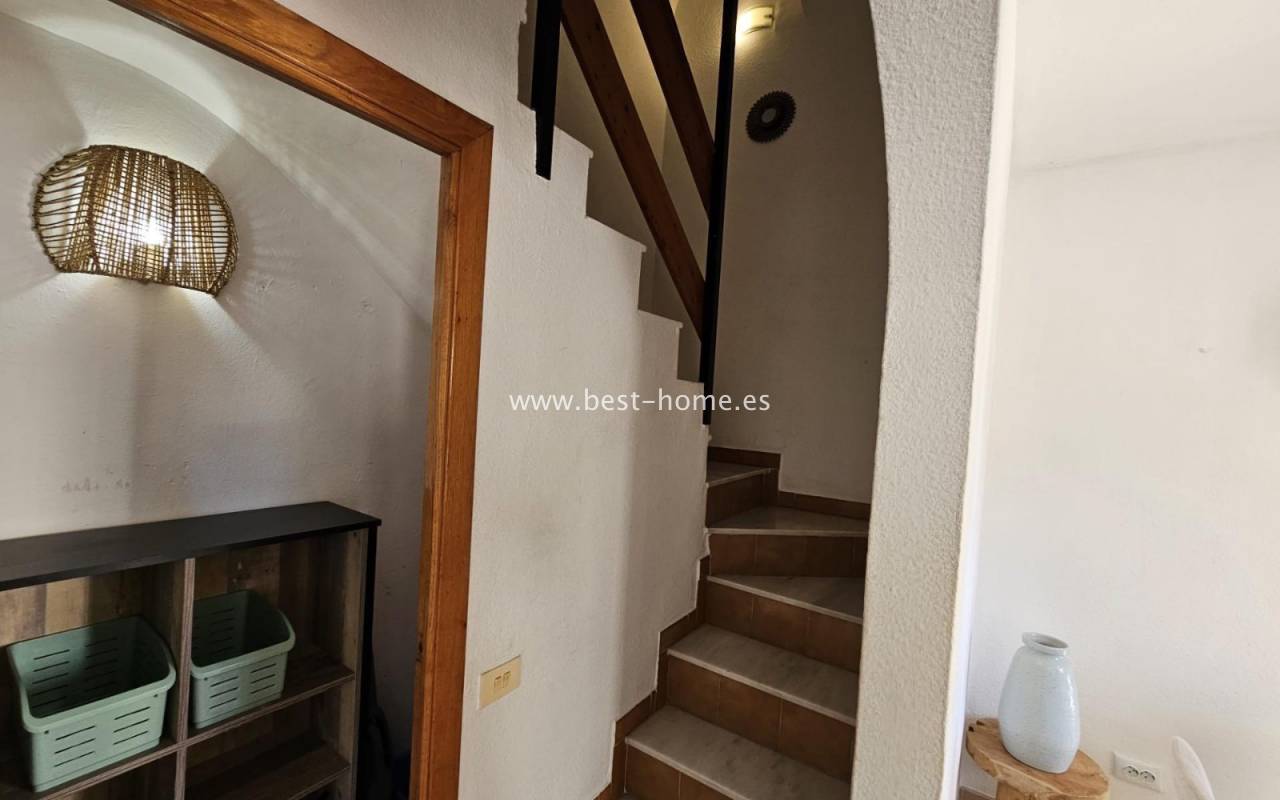 Bungalow 3 poziomowy z solarium, ogrodem i basenem osiedlowym oraz licencją turystyczną na presiżowym osiedlu Calas Blancas w Torrevieja. Przez ogród o powierzchni 15 m2 wchodzimy do środka, gdzie znajdziemy salon z jadalnią, małe pomieszczenie gospodarcze ( piwniczka ). Na 1 piętrze znajdziemy dużą pierwszą sypialnię z szafą i łazienkę typu e-suite z prysznicem, na 2 piętrze znajdziemy drugą sypialnię z łóżkiem piętrowym i wyjściem na malutki taras i toaletę. Na 3 piętrze znajdziemy słoneczne solariuum z widokiem bocznym na morze. Mieszkanie jest wyposażone w klimatyzację i sprzedawane wraz z meblami. Na terenie osiedla znajduje się basen przeznaczony dla mieszkańców. W pobliżu znajdziemy sklep spożywczy Consum, park, dużą ilośc barów, restauracji kawiarnii.