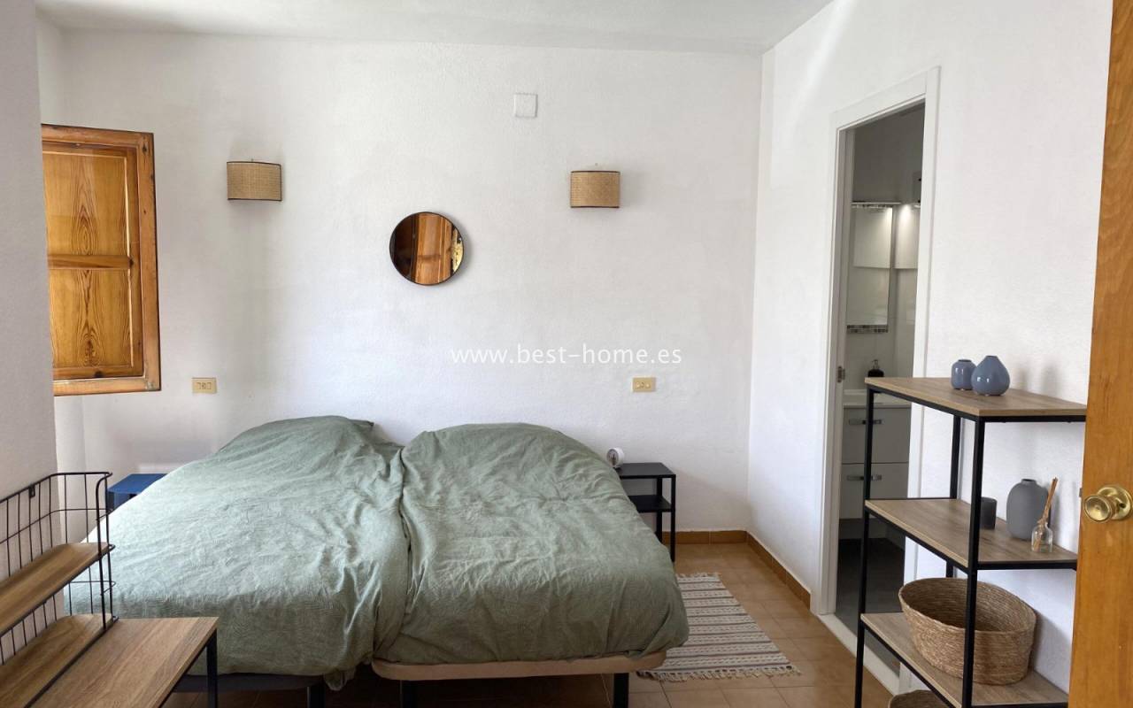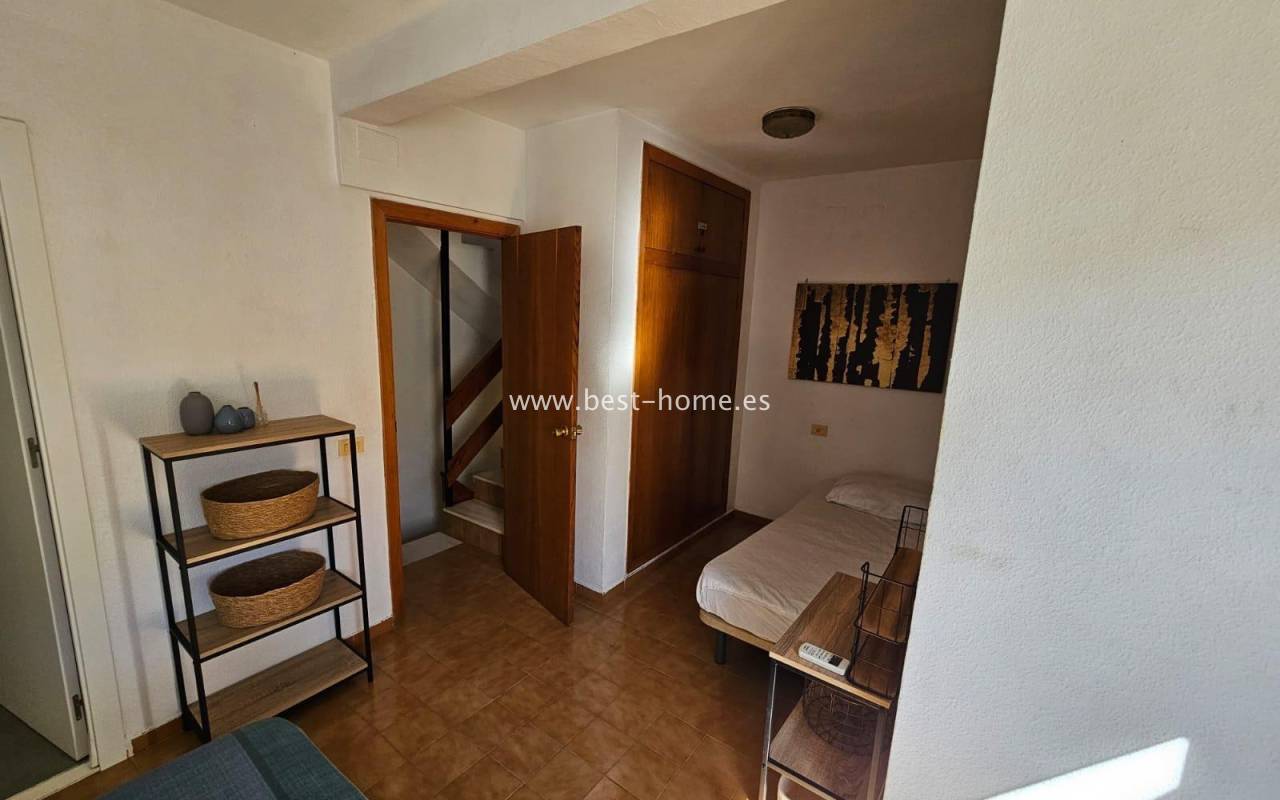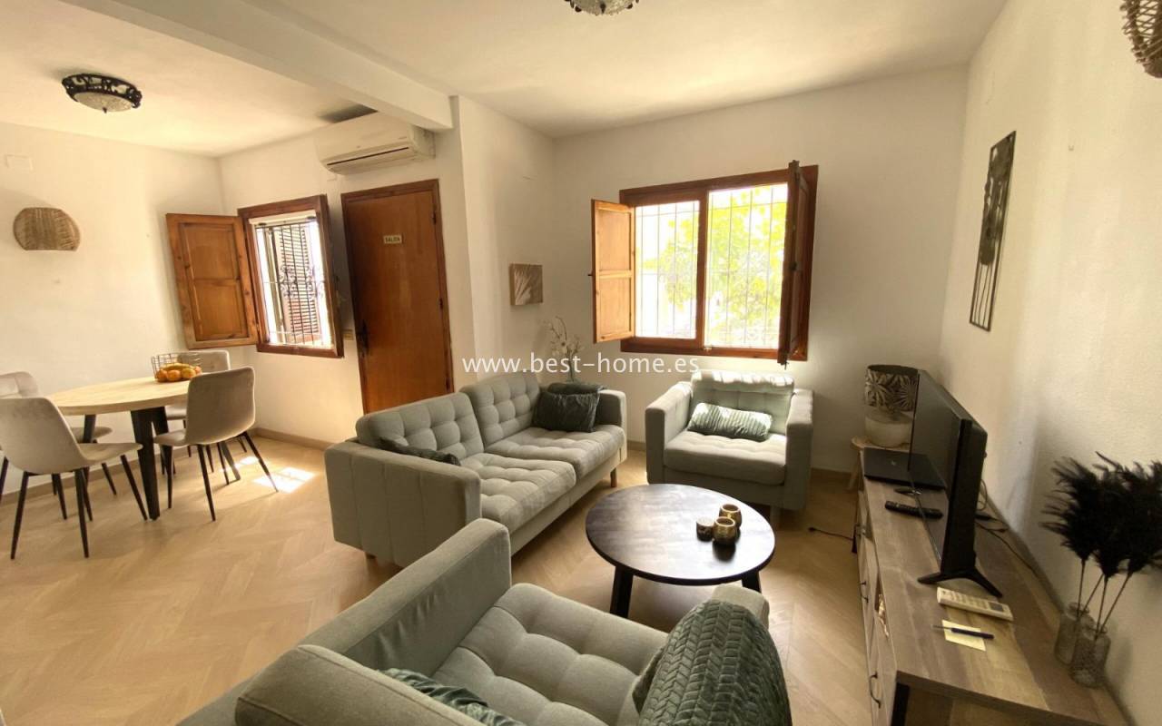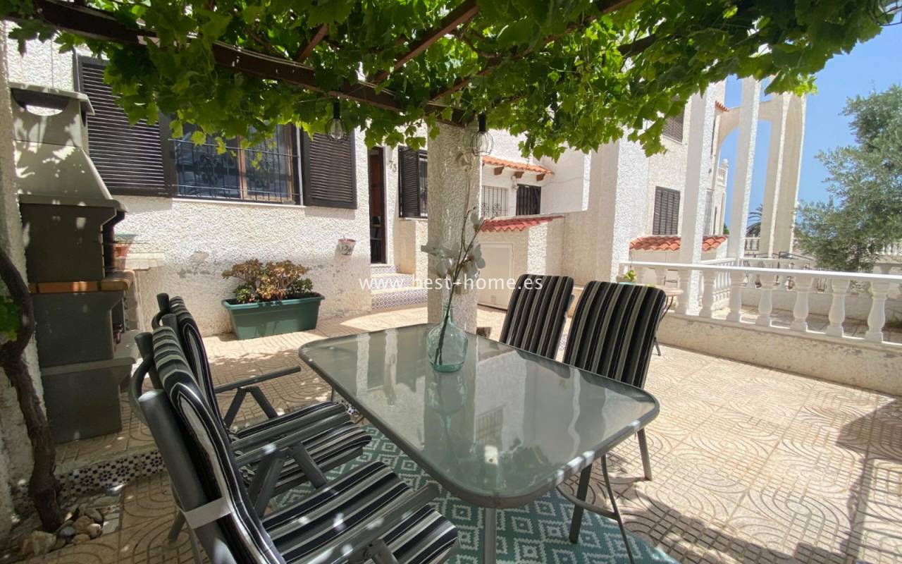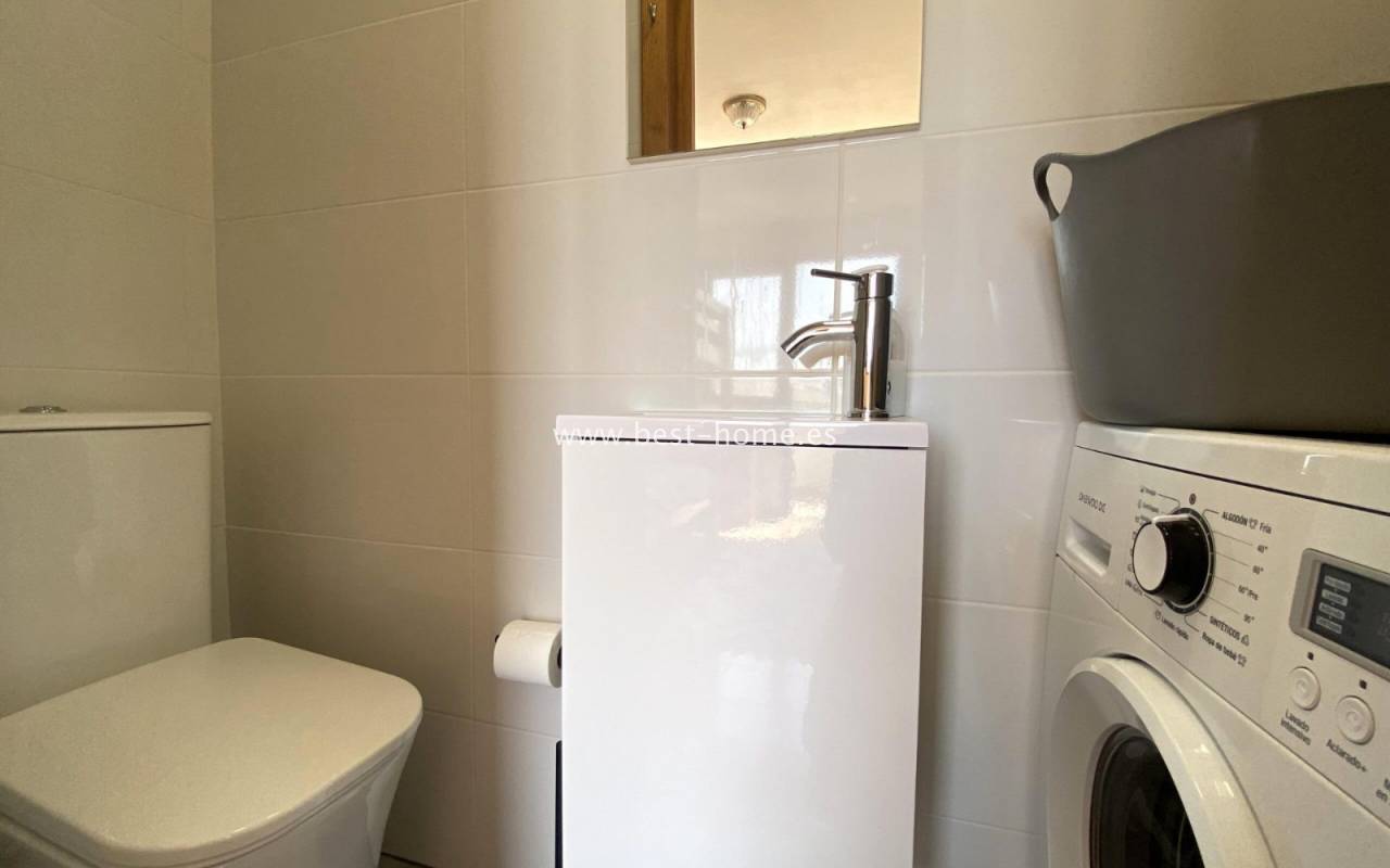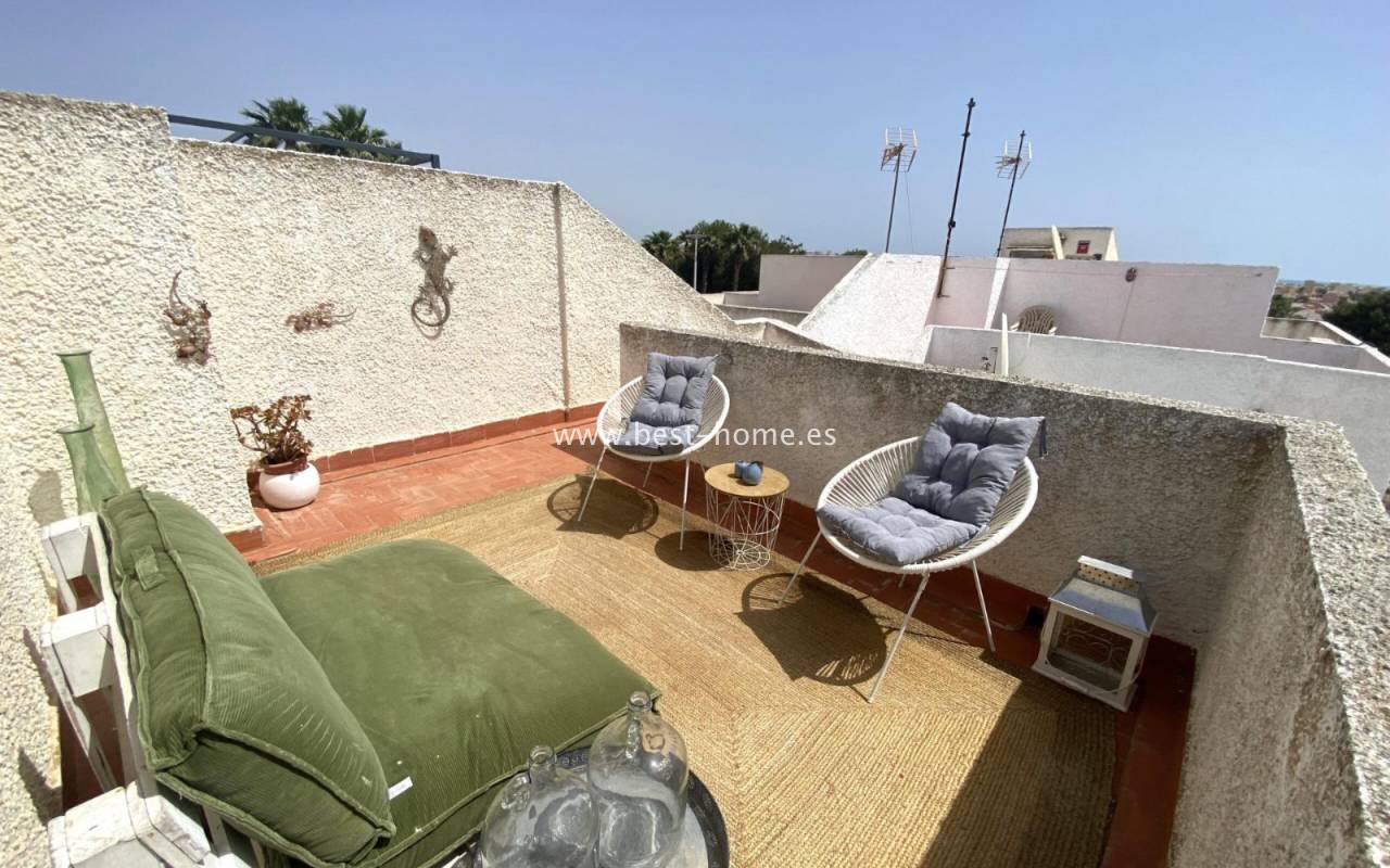 Bungalow 3 poziomowy z solarium, ogrodem i basenem osiedlowym oraz licencją turystyczną na presiżowym osiedlu Calas Blancas w Torrevieja. Przez ogród o powierzchni 15 m2 wchodzimy do środka, gdzie znajdziemy salon z jadalnią, małe pomieszczenie gospodarcze ( piwniczka ). Na 1 piętrze znajdziemy dużą pierwszą sypialnię z szafą i łazienkę typu e-suite z prysznicem, na 2 piętrze znajdziemy drugą sypialnię z łóżkiem piętrowym i wyjściem na malutki taras i toaletę. Na 3 piętrze znajdziemy słoneczne solariuum z widokiem bocznym na morze. Mieszkanie jest wyposażone w klimatyzację i sprzedawane wraz z meblami. Na terenie osiedla znajduje się basen przeznaczony dla mieszkańców. W pobliżu znajdziemy sklep spożywczy Consum, park, dużą ilośc barów, restauracji kawiarnii.