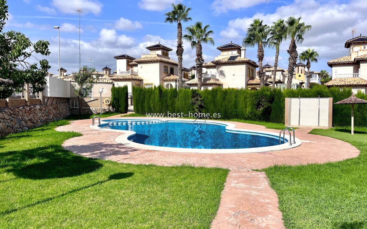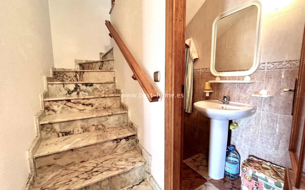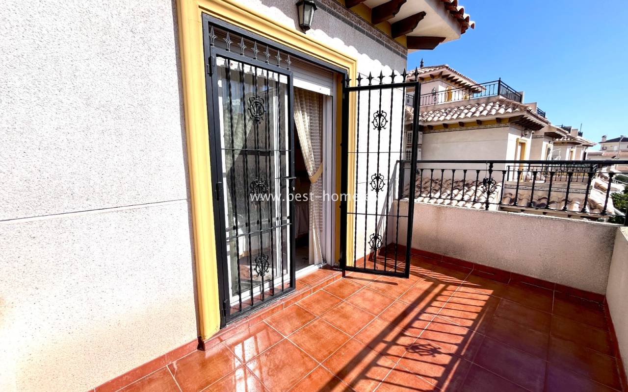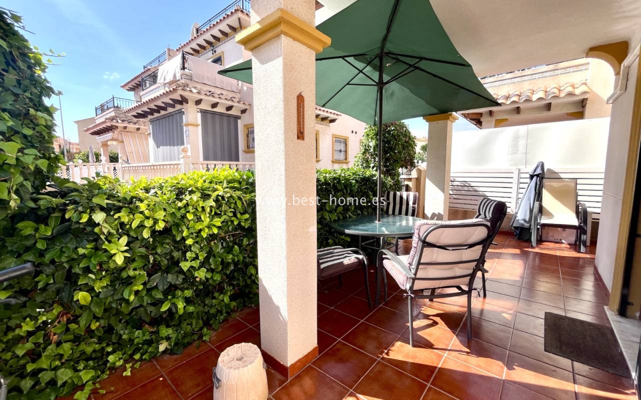 Dom położony jest w dobrej lokalizacji w dzielnicy La Zenia. Składa się z 3 sypialni, 2 łazienek, umeblowanej kuchni i salonu z jadalnią. Przed domem jest zadaszony taras i narożny ogródek z miejscem parkingowym. Do plaży 1,2 km. W cenie umeblowanie i sprzęt AGD.